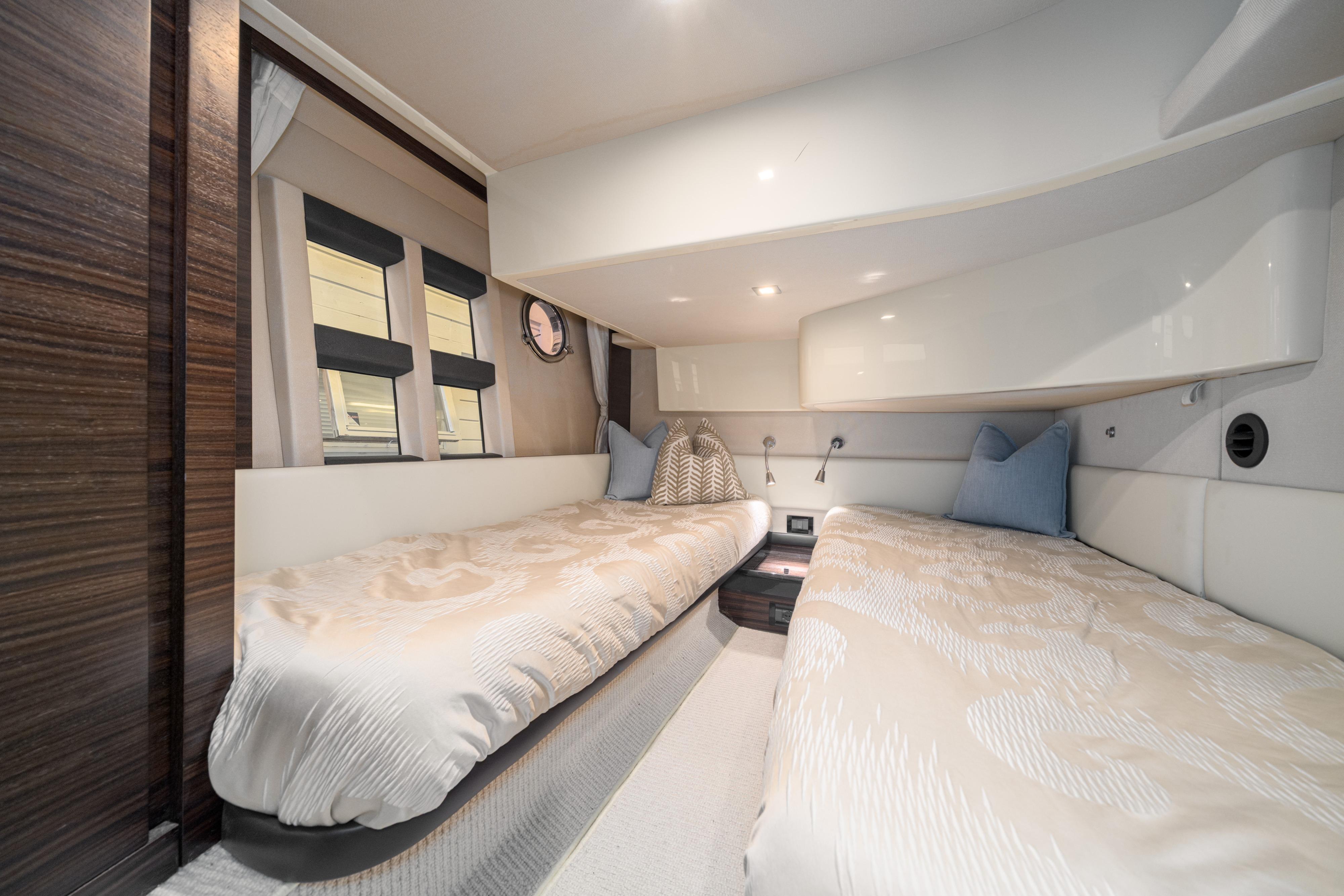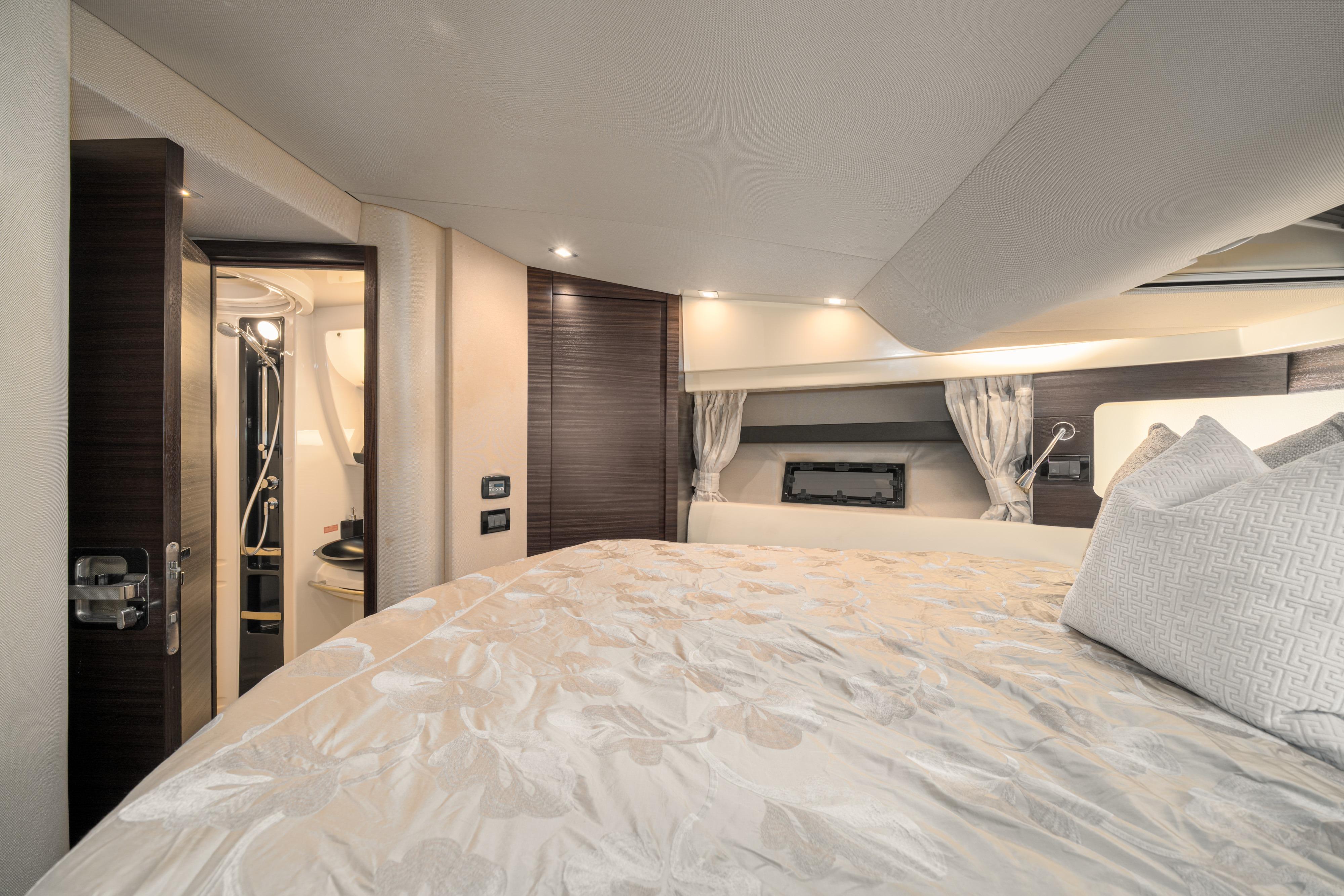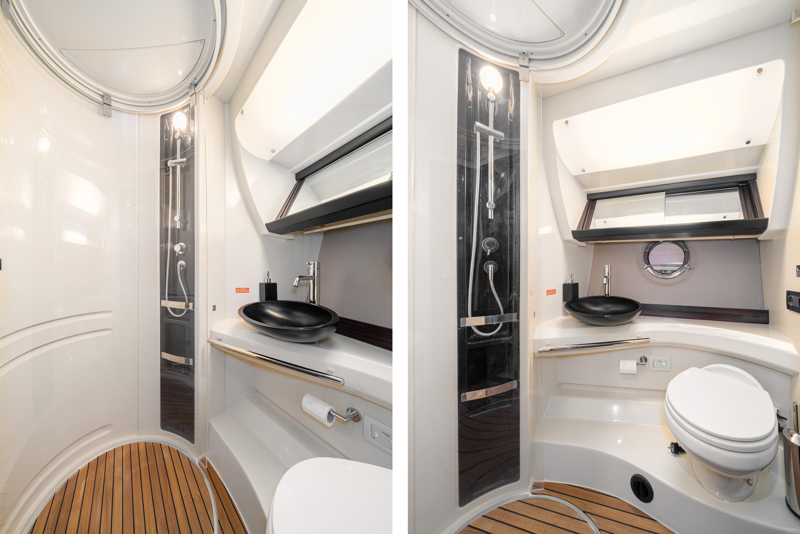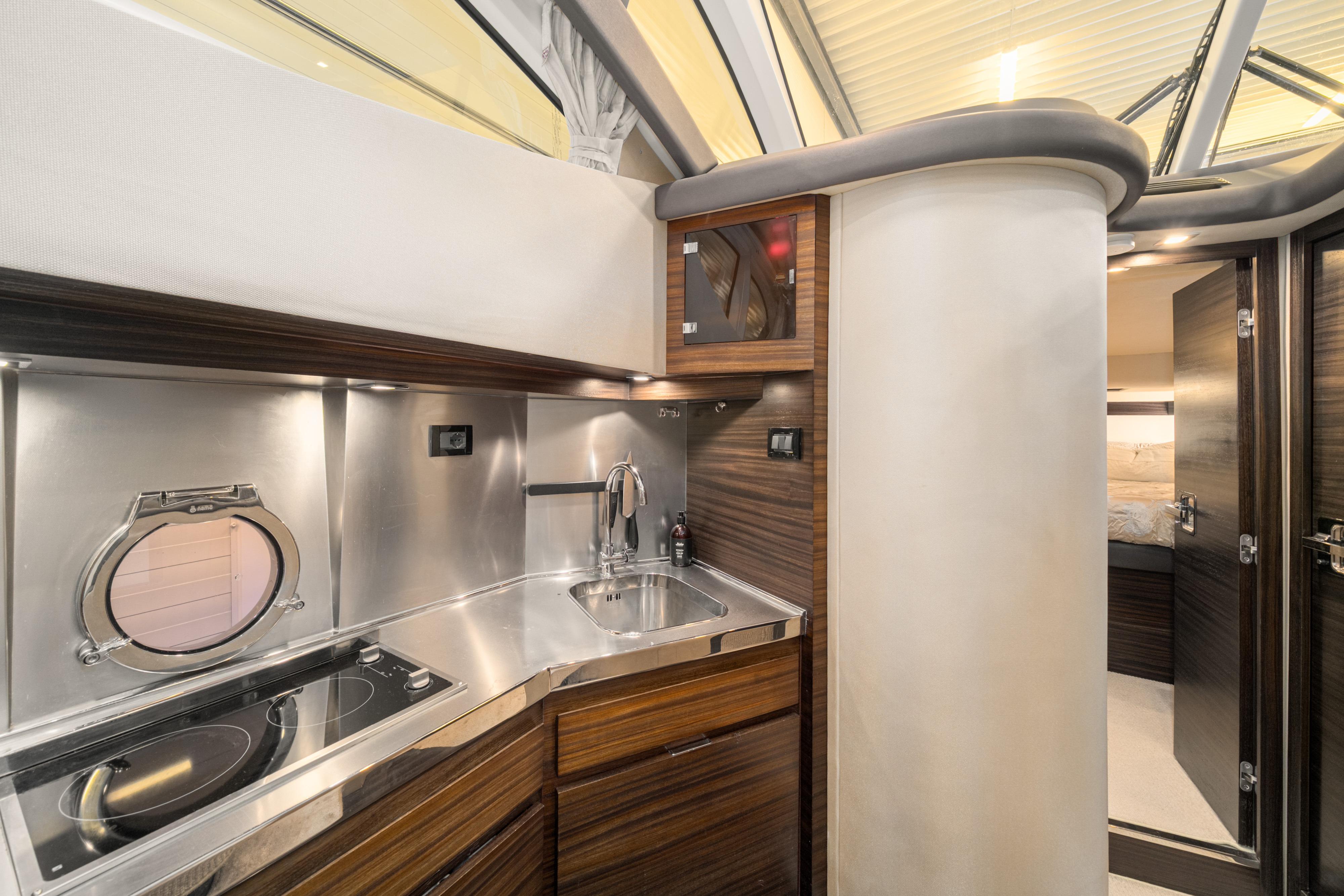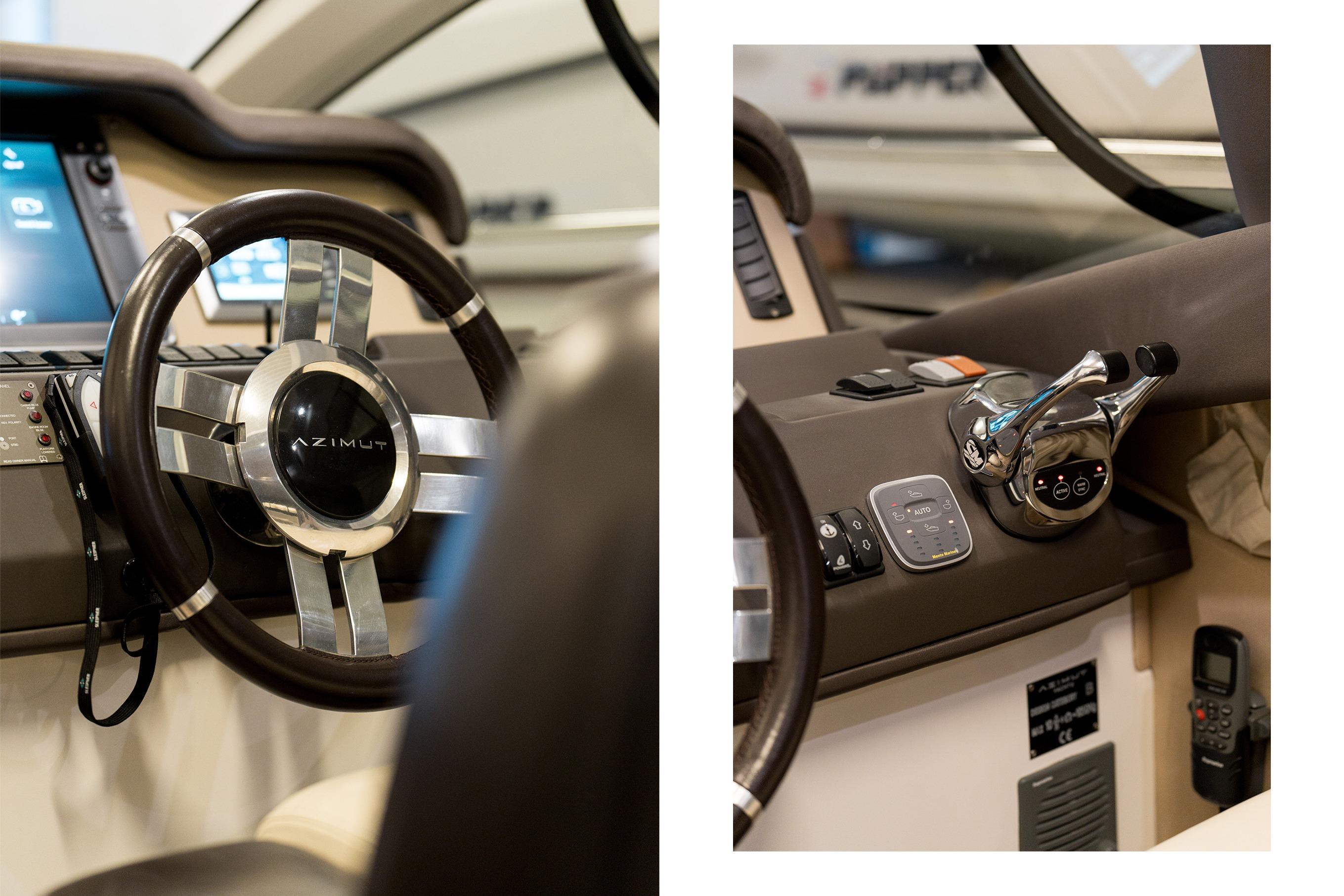 Inside the main saloon, the premium feel continues — warm, inviting materials with contrasting leathers, beautifully crafted woodwork and large surrounding windows. The signature curved side windows of the Azimut S-series provide excellent natural light and visibility for both the helmsman and guests. The compact but well-equipped galley on port includes a sink, stove, microwave and refrigerator with freezer. The helm station to starboard is elevated, ergonomic and offers very good visibility. Twin engines, thruster and joystick make the 40S remarkably easy to handle for its size.