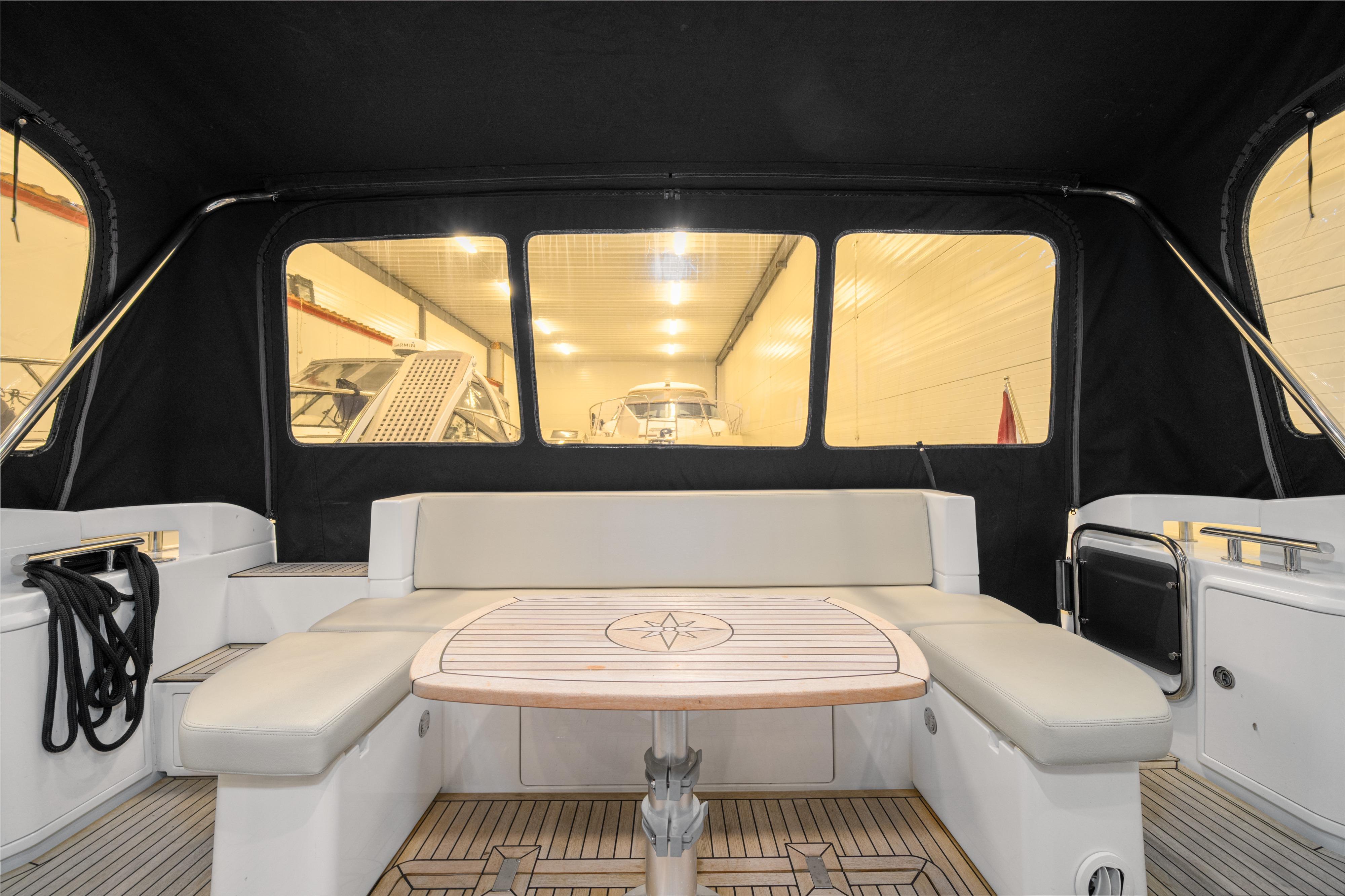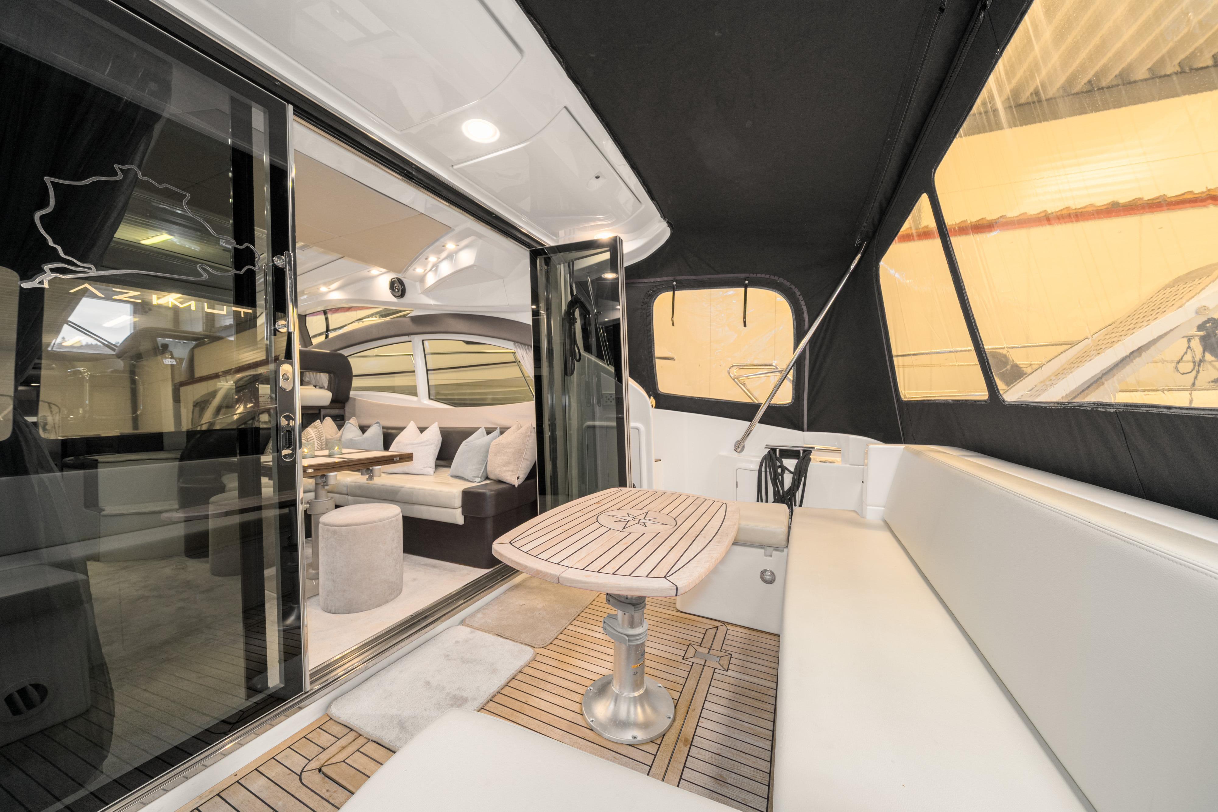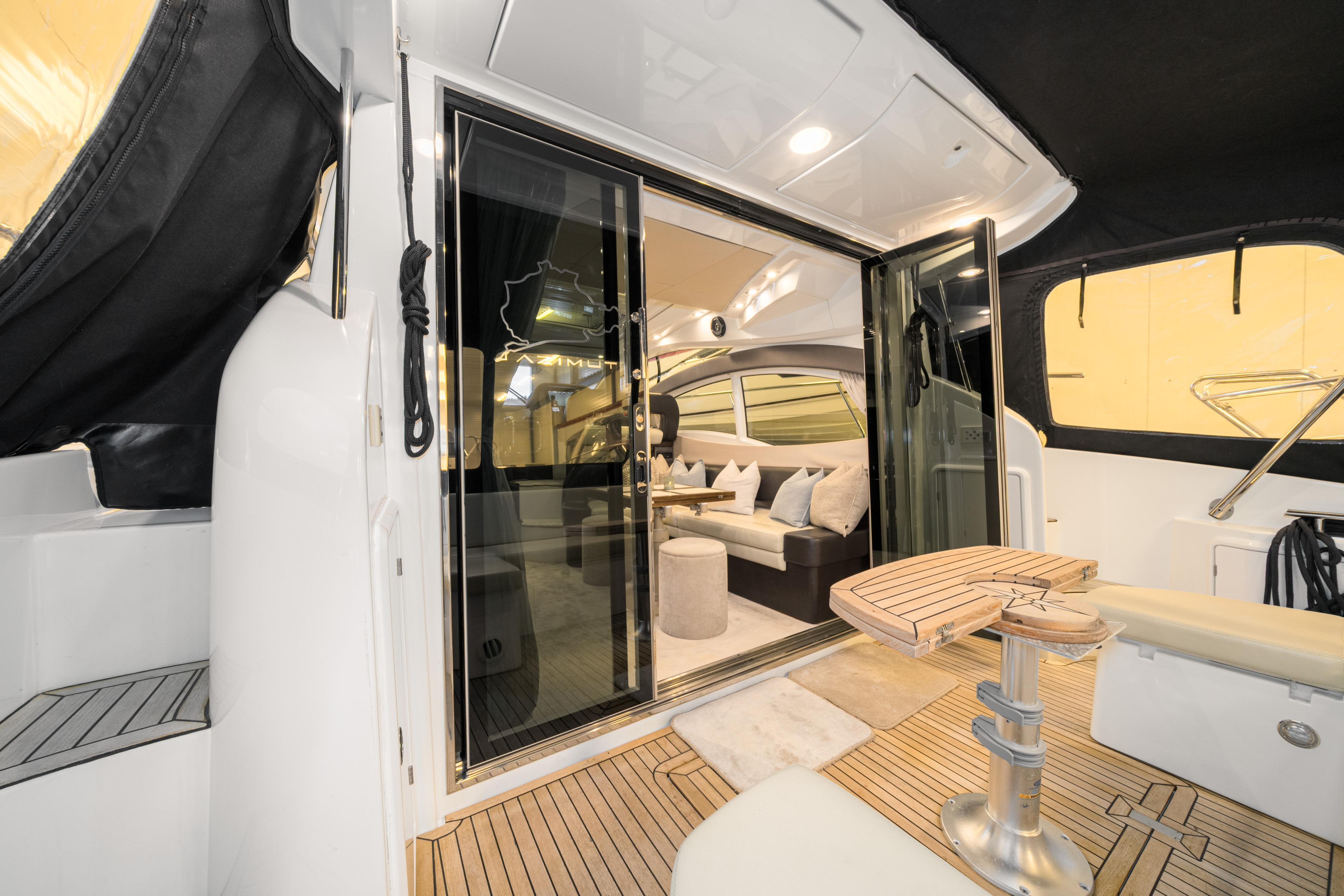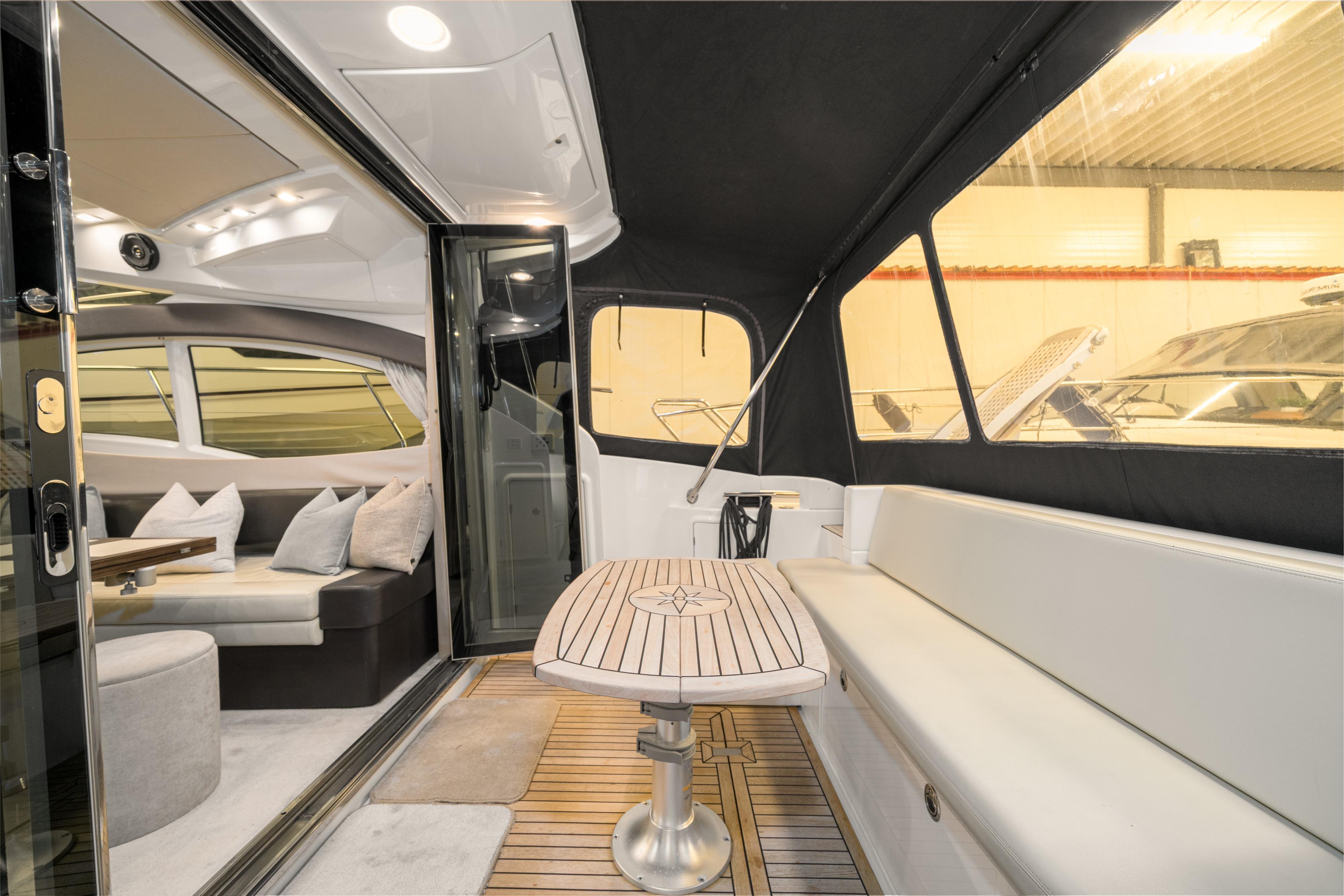 A large aft deck combined with the electrically operated panoramic sunroof over the saloon gives the boat an airy, open feel in good weather. When needed, the space can be fully enclosed with the aft canopy, sliding glass door and solid hardtop, providing excellent protection from wind and rain.
