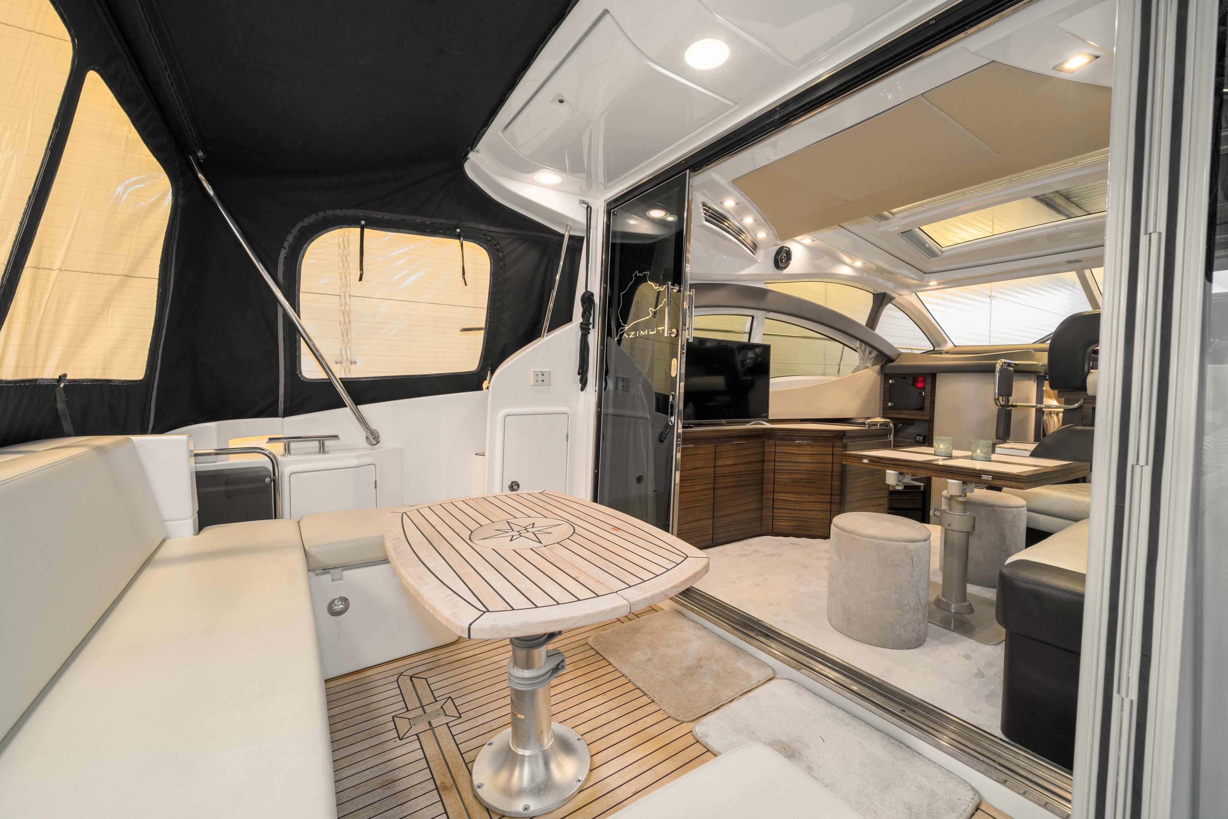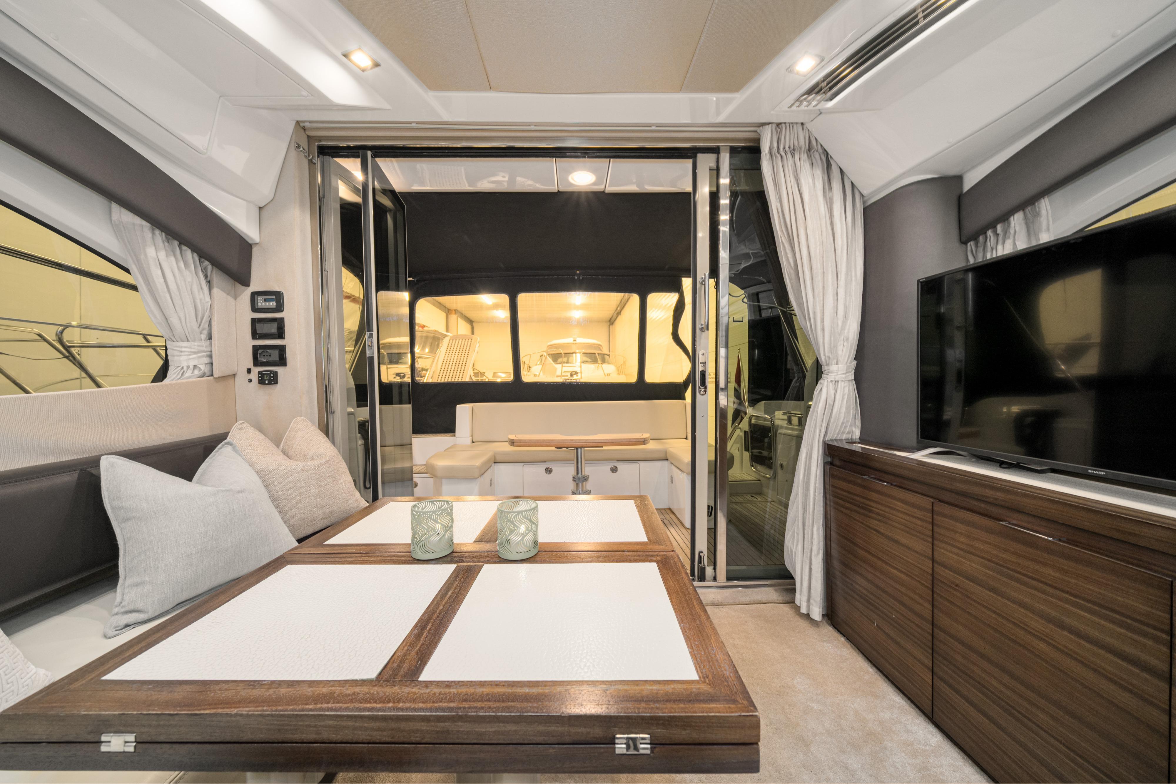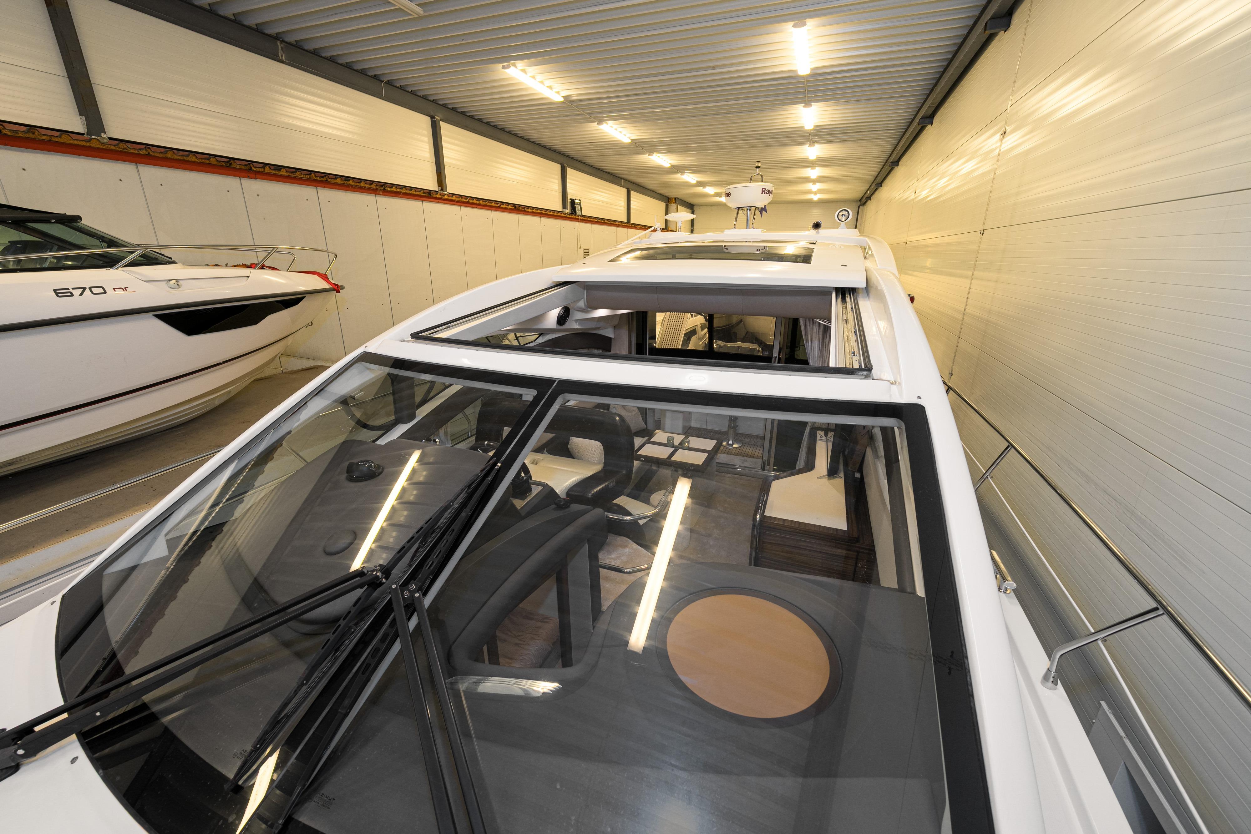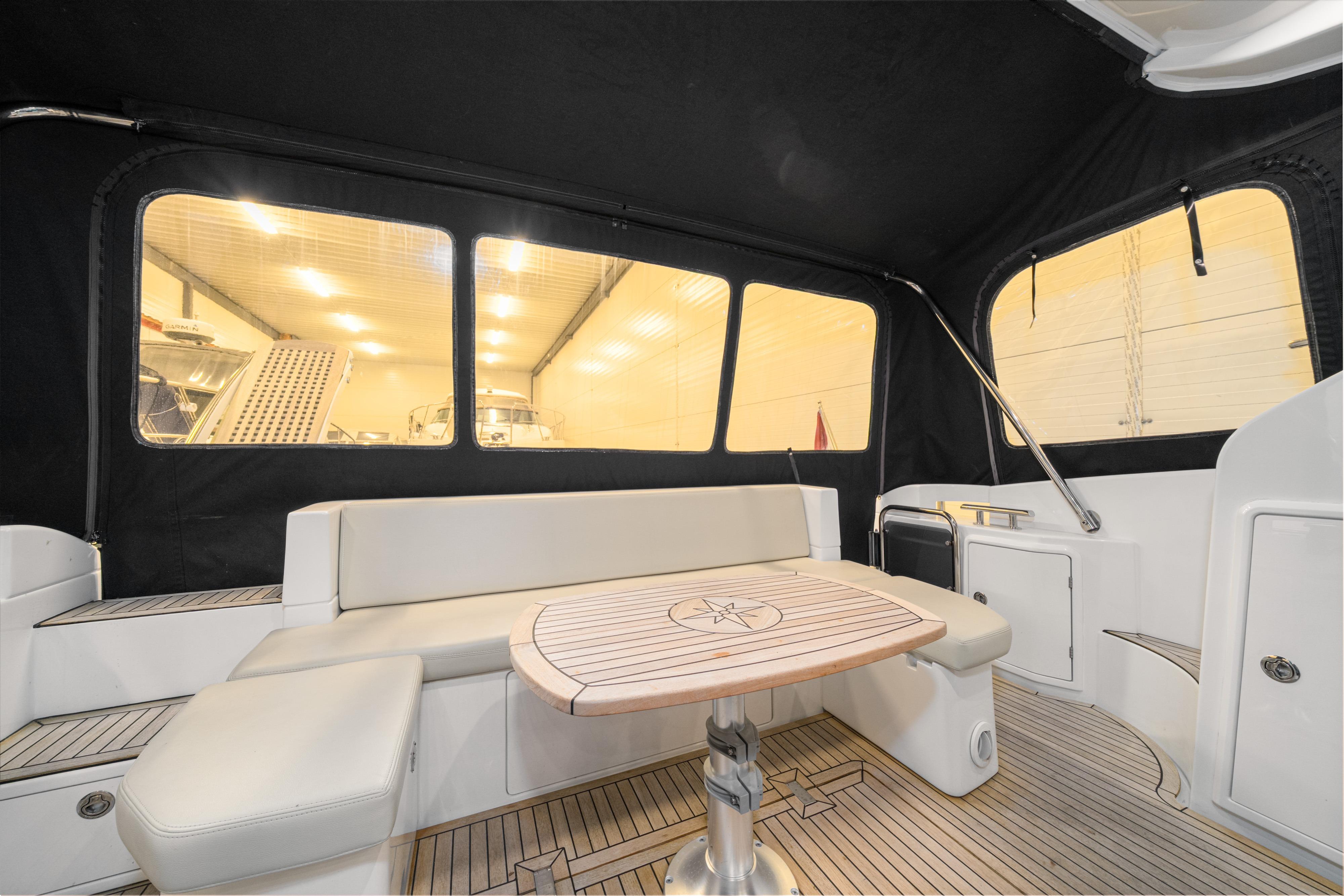 A large aft deck combined with the electrically operated panoramic sunroof over the saloon gives the boat an airy, open feel in good weather. When needed, the space can be fully enclosed with the aft canopy, sliding glass door and solid hardtop, providing excellent protection from wind and rain.