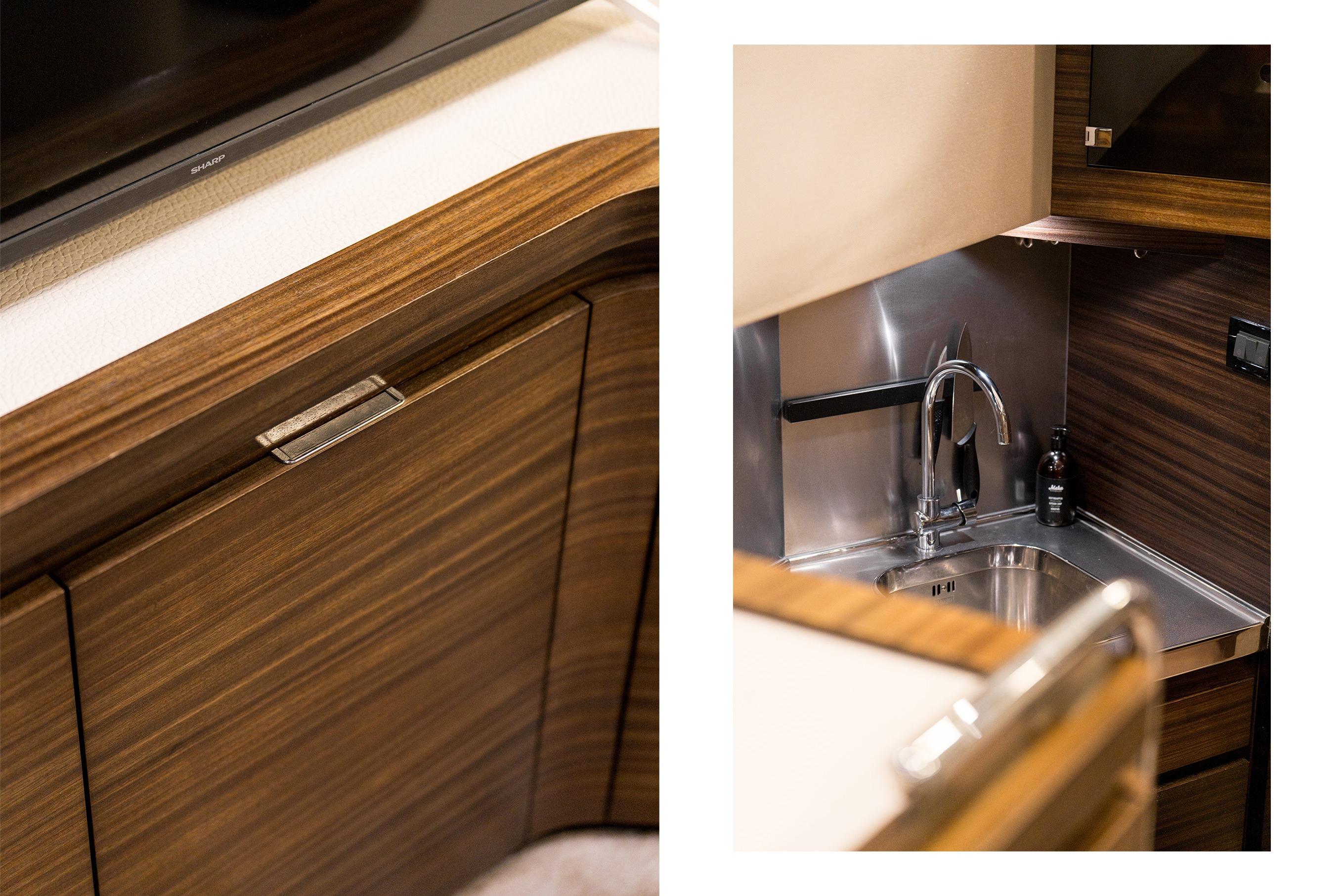 At the stern, you will find a practical and robust hydraulic bathing platform rated for 400 kg. This leads up to an elegant seating area that easily converts into a sunbed. The teak table, teak decking and high-quality leather upholstery give the cockpit a refined, exclusive atmosphere. The sofa is neatly designed with walk-around access on both sides.