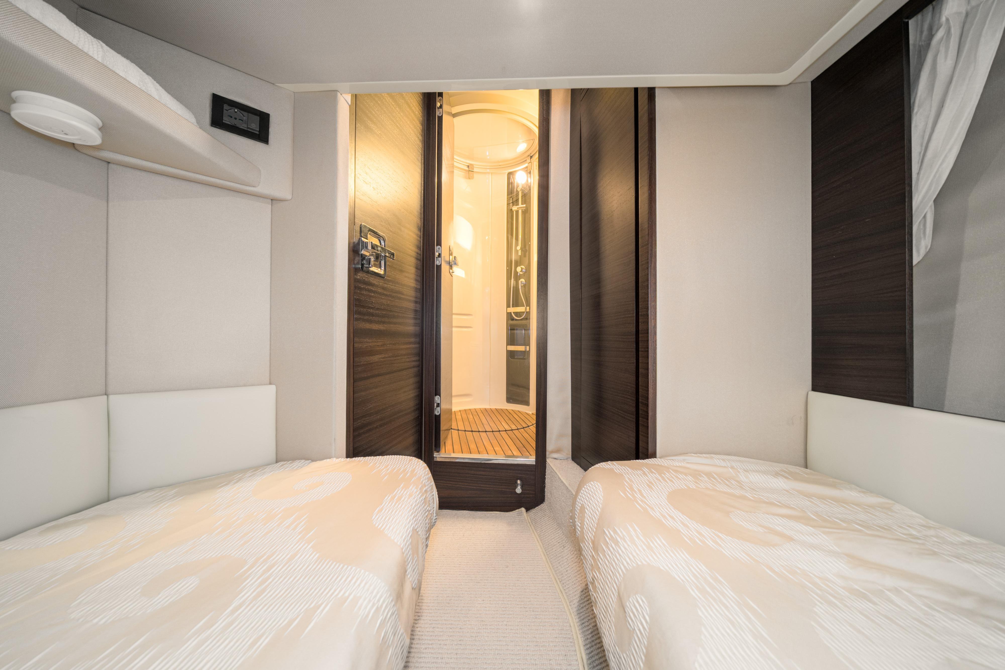 The boat offers two cabins: the owner’s cabin forward with en-suite bathroom, and a guest cabin amidships with its own bathroom accessible from both the companionway and the cabin. This layout prioritizes comfort and privacy over maximum berth count, making the boat ideal for two couples or a family of four. Air-conditioning and heating with outlets in all rooms ensure a comfortable onboard climate throughout the season.