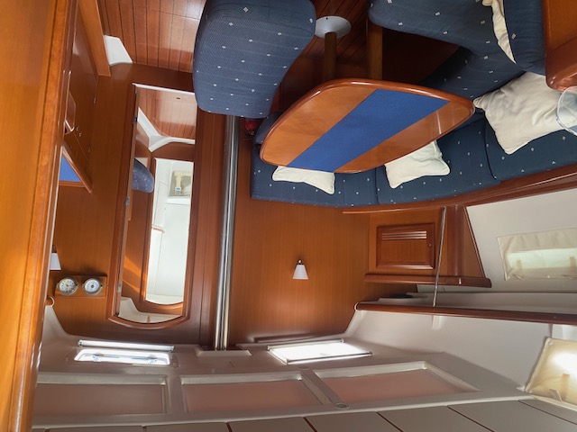 Saloon with C-shaped seating to port around table that drops down to form double berth