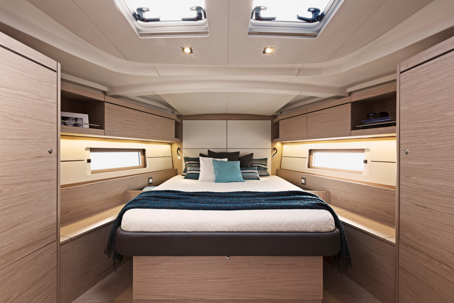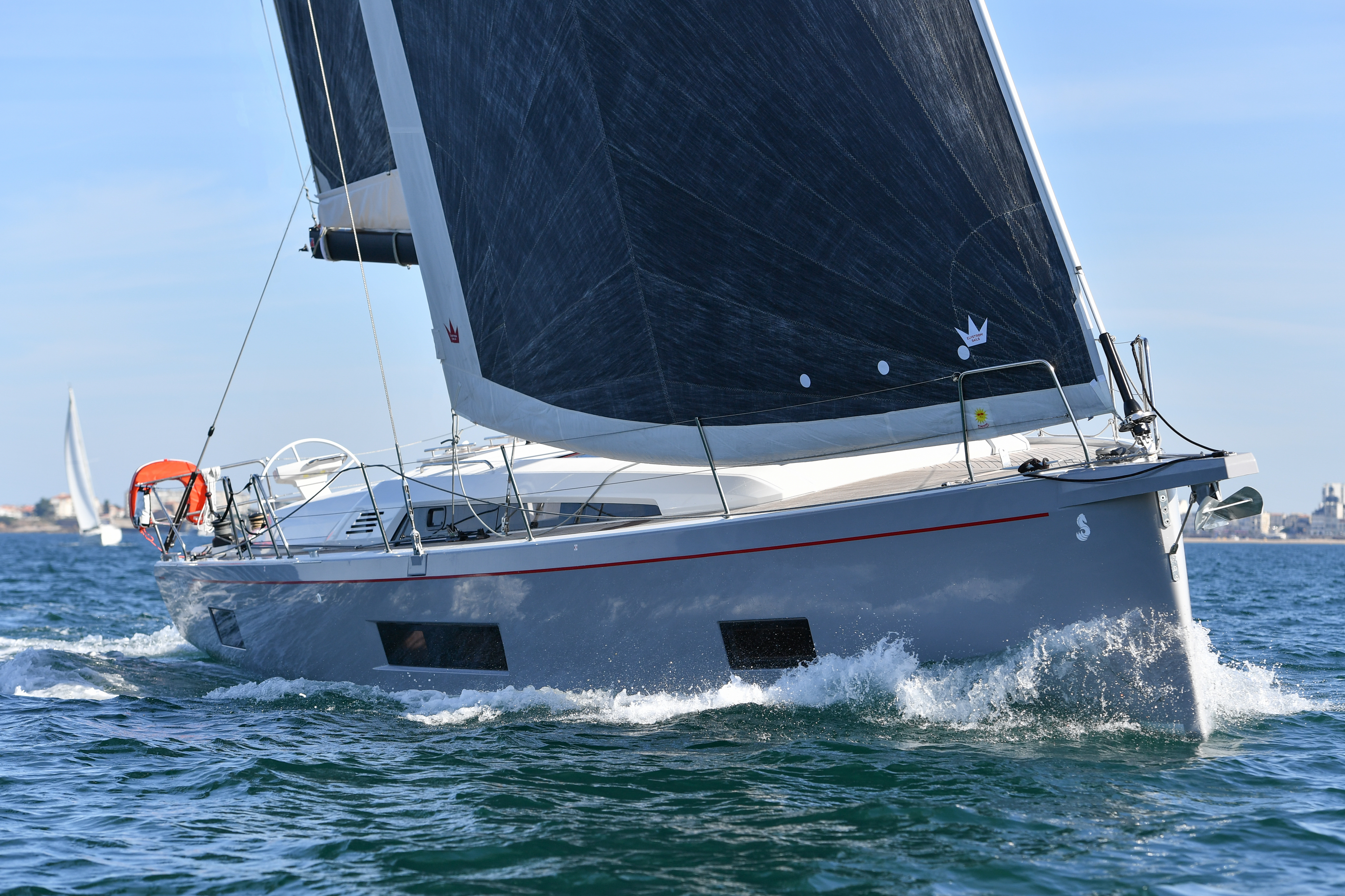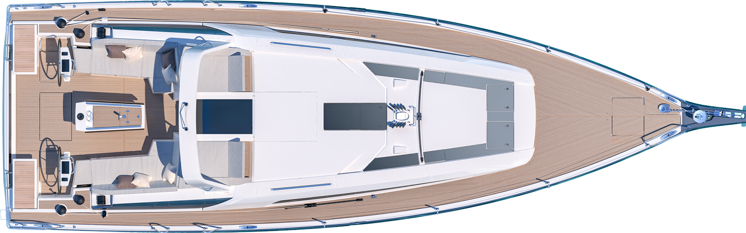 The Oceanis 46.1 is based on a Finot-Conq plan, keeping the distinctive stepped hull of the 51.1. Apart from her performance at sea and the huge amount of space that set this boat apart, this architecture makes optimal use of the cockpit beam. An incredibly efficient deck plan makes her wonderfully safe and easy to use. The furling mast, self-tacking jib and all the halyards and sheets brought back to a single winch at each of the helm stations, make manoeuvring simple when short-handed sailing.