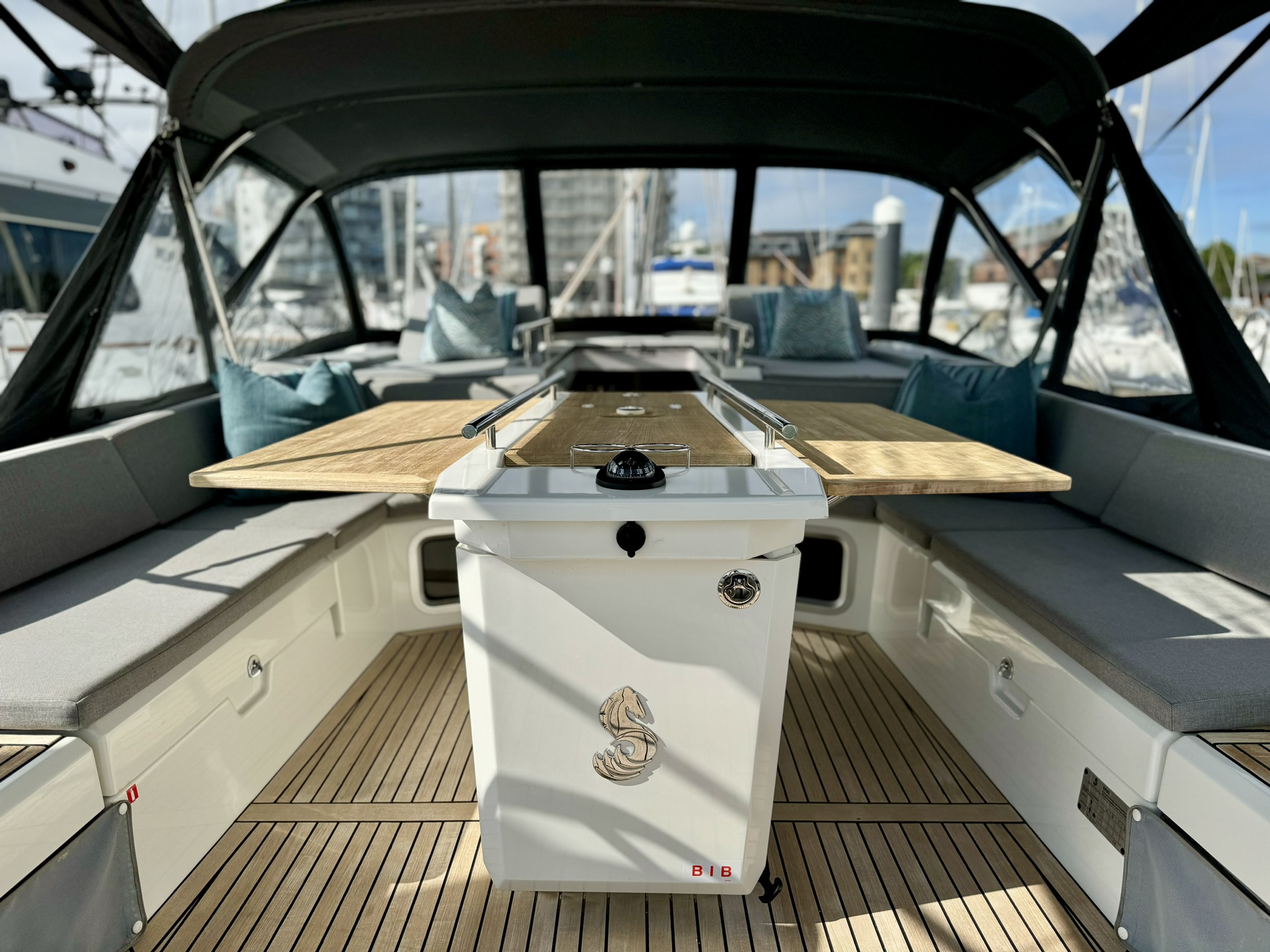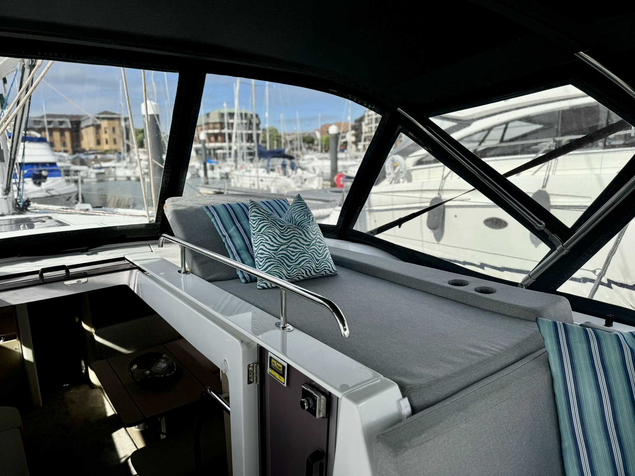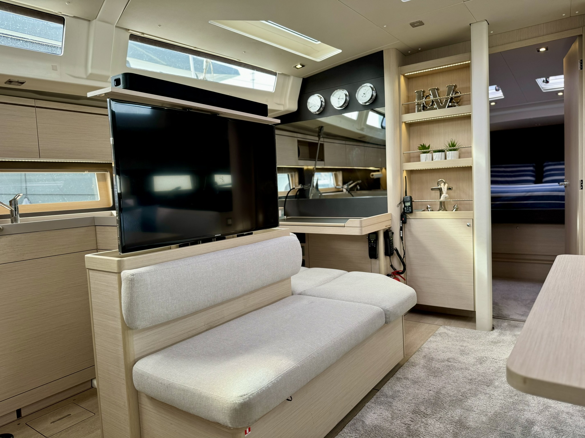 Headroom: 2,03 m / 6’8’’. U shaped saloon bench - double density foam. 1 Flexible and swivelling reading light. Saloon table with manual dropping legs. Storage under bench seats. Mirror on forward bulkhead. Bottle rack behind the bench against the forward bulkhead. Bose speakers in saloon. 40" Pop-up TV in saloon - antenna required, 2 Panoramic coachroof windows with curtains. 2 Hull portholes.