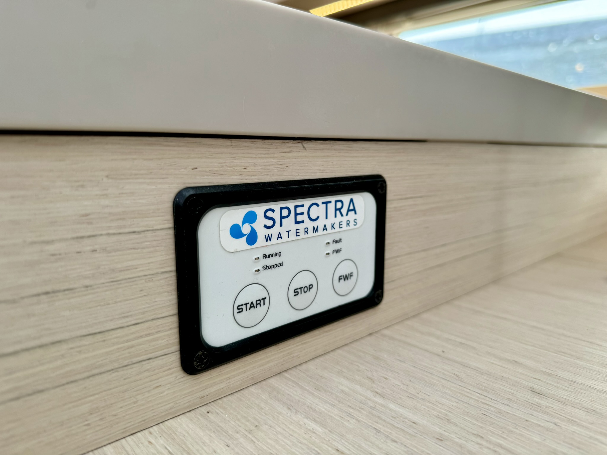Engine throttle and control panel on starboard. Engine compartment: Soundproofing foam - Ventilation: 3 air intakes and 1 forced air outlets. Alternator 12 V / 125 Ah. Electronic gauge - Low level alarm - 1 Deck filler. Filters: Sea water - Diesel - Water separator. Gori Folding Prop. Engine access through companionway (opening with 2 gas struts) - access also through aft cabins.