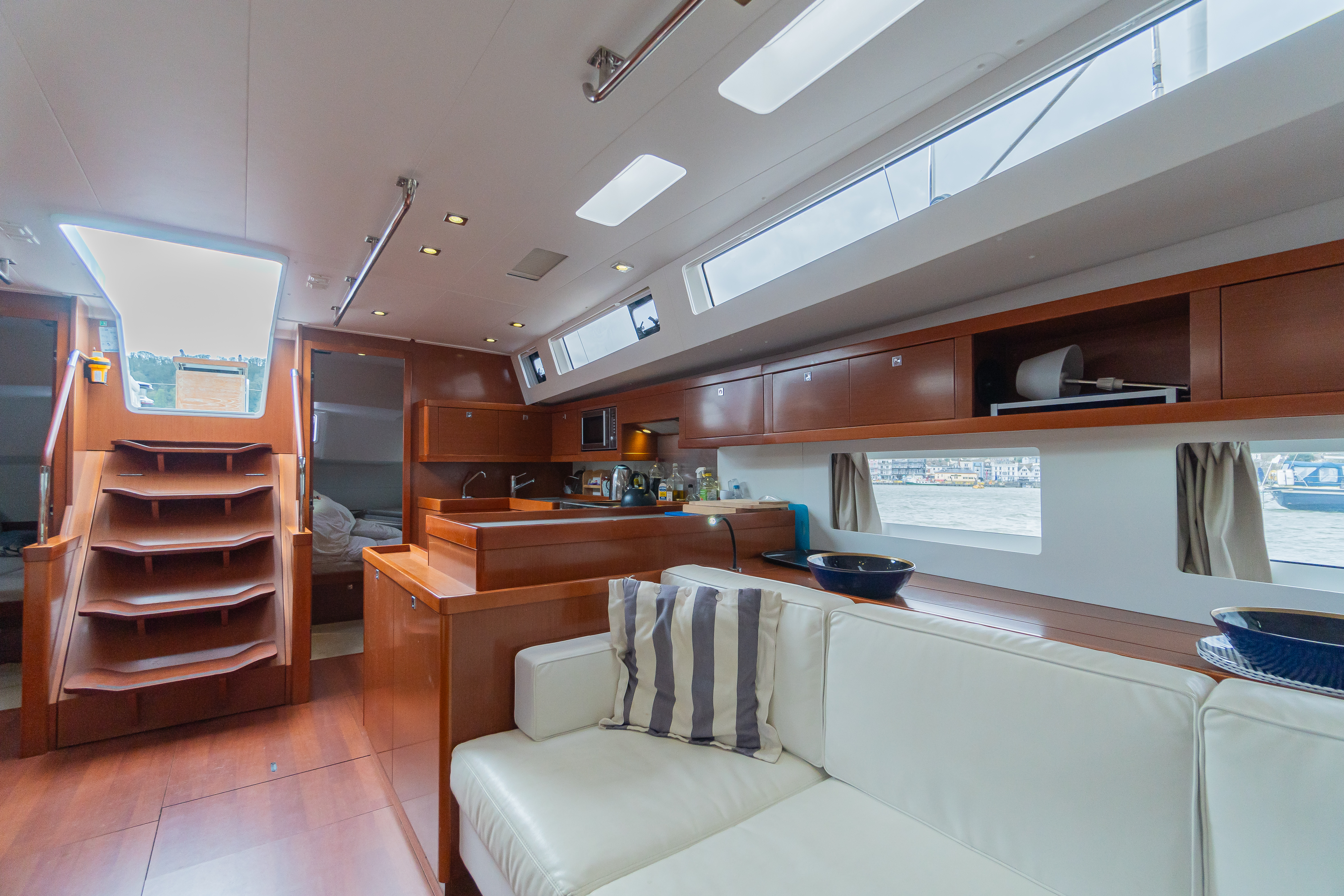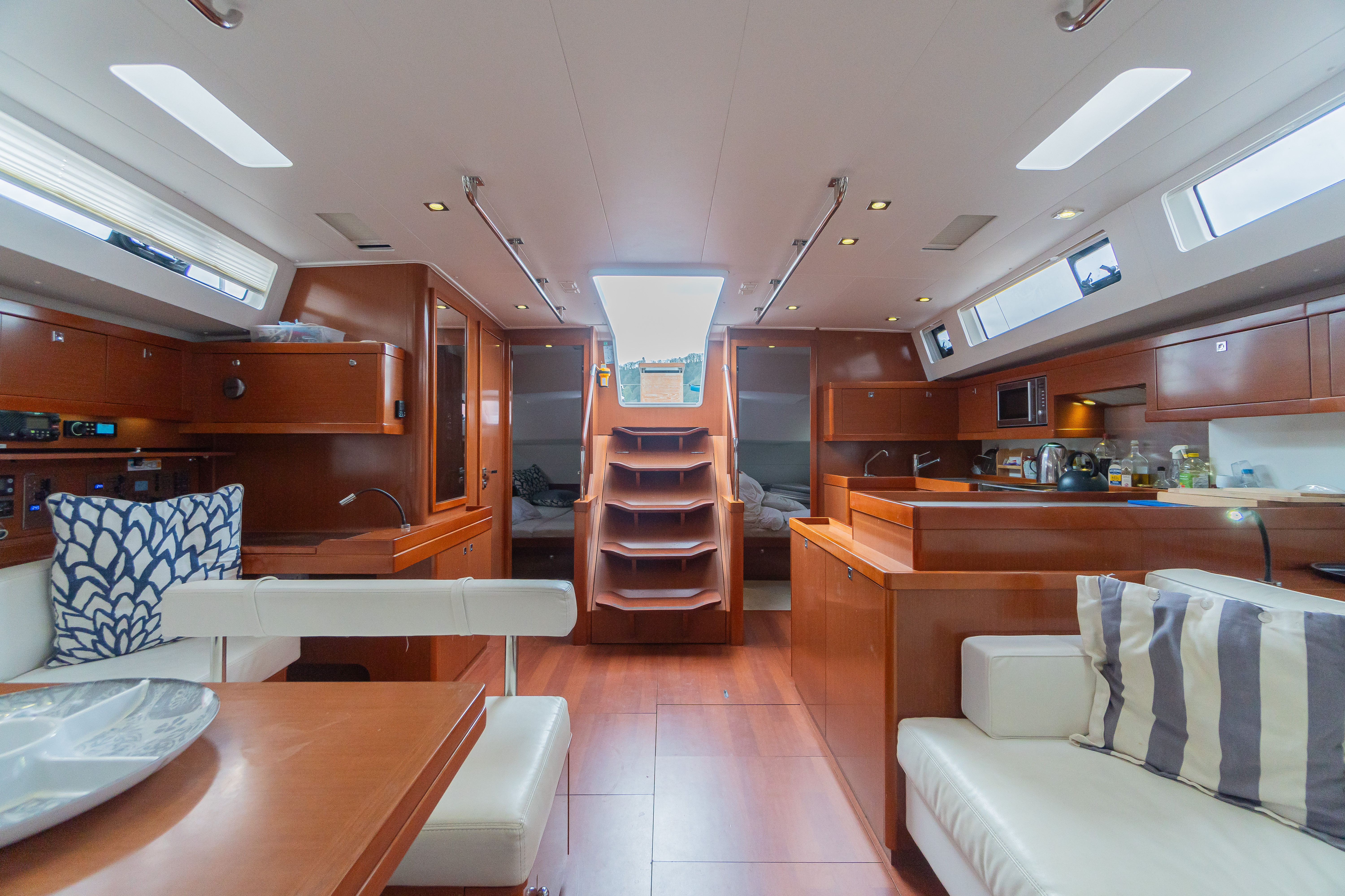 The Beneteau Oceanis 55 is a yacht designed for big adventures and set up to enable short handed sailing with a comfortable deck layout, balanced sail plan and large safe cockpit including all controls within reach of the helm. Interior comfort is high level with three spacious cabins, a large saloon with well equipped galley and lots of glazing throughout to create naturally well lit spaces.