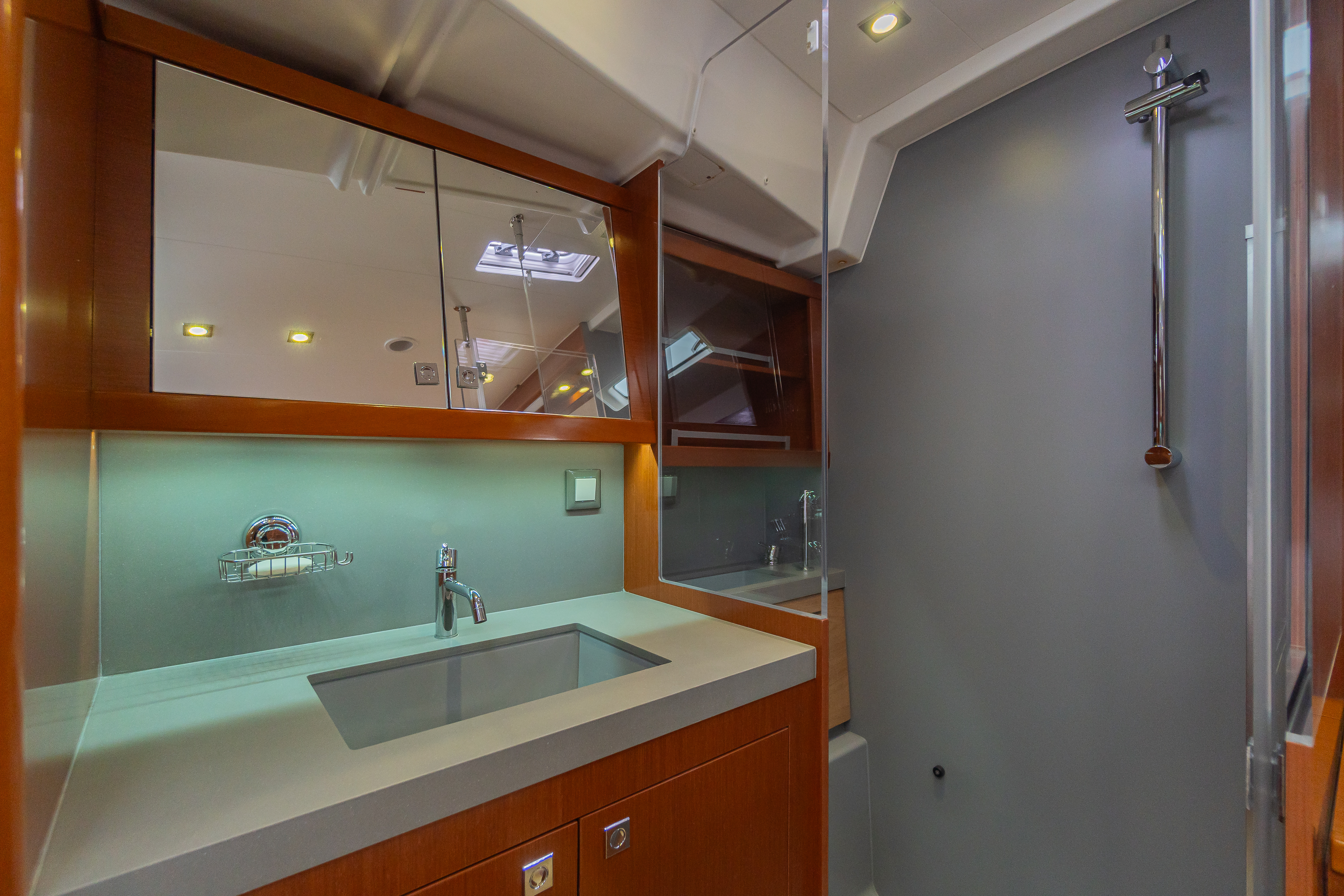 to starboard - Glass shower cabin with flush access and stowage on the bulkhead, Grey