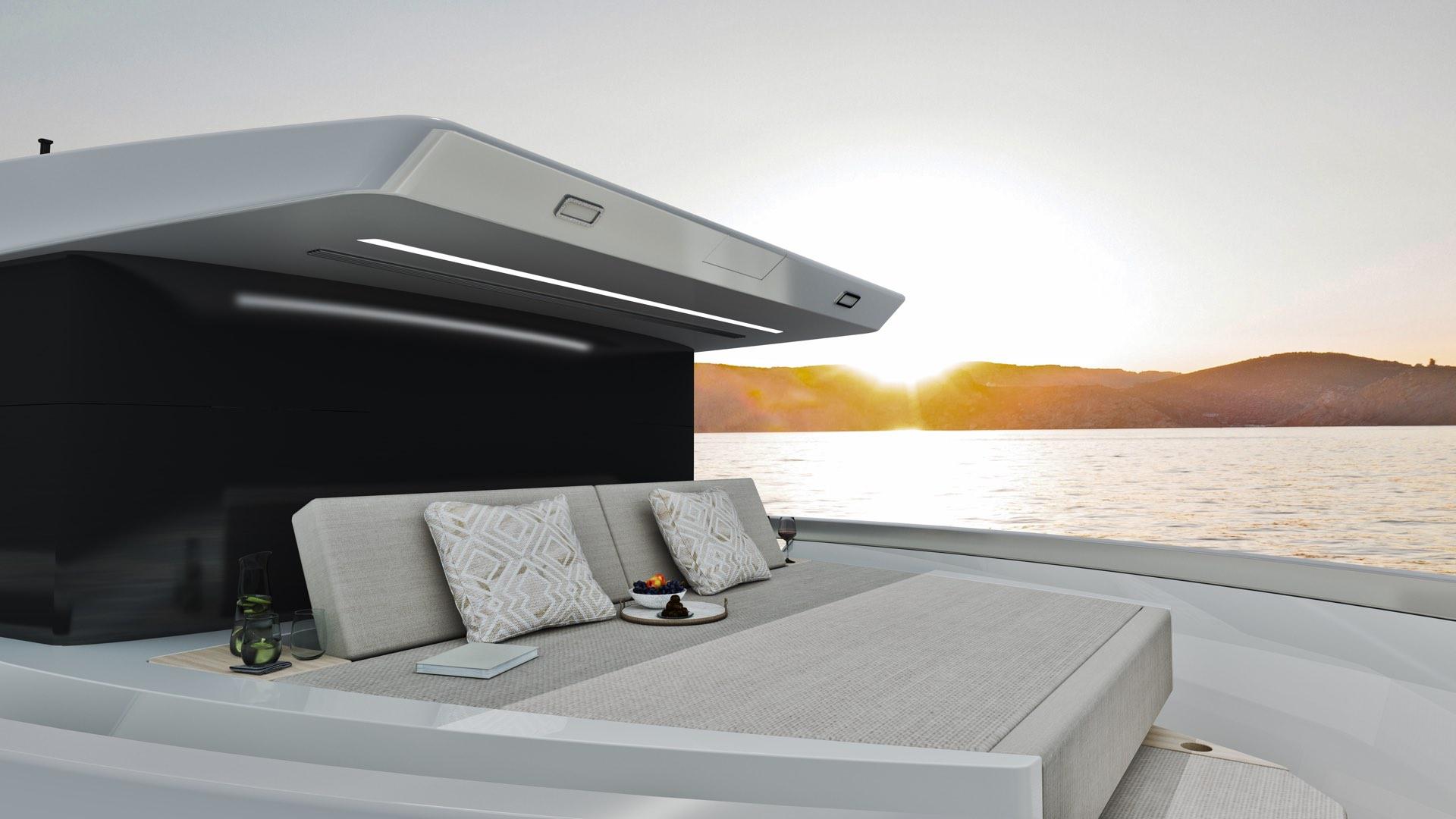 • Aft Sunbed & Engine Design: Outboard engines are discreetly hidden beneath a large sunbed that comfortably fits two, combining safety with sleek style.