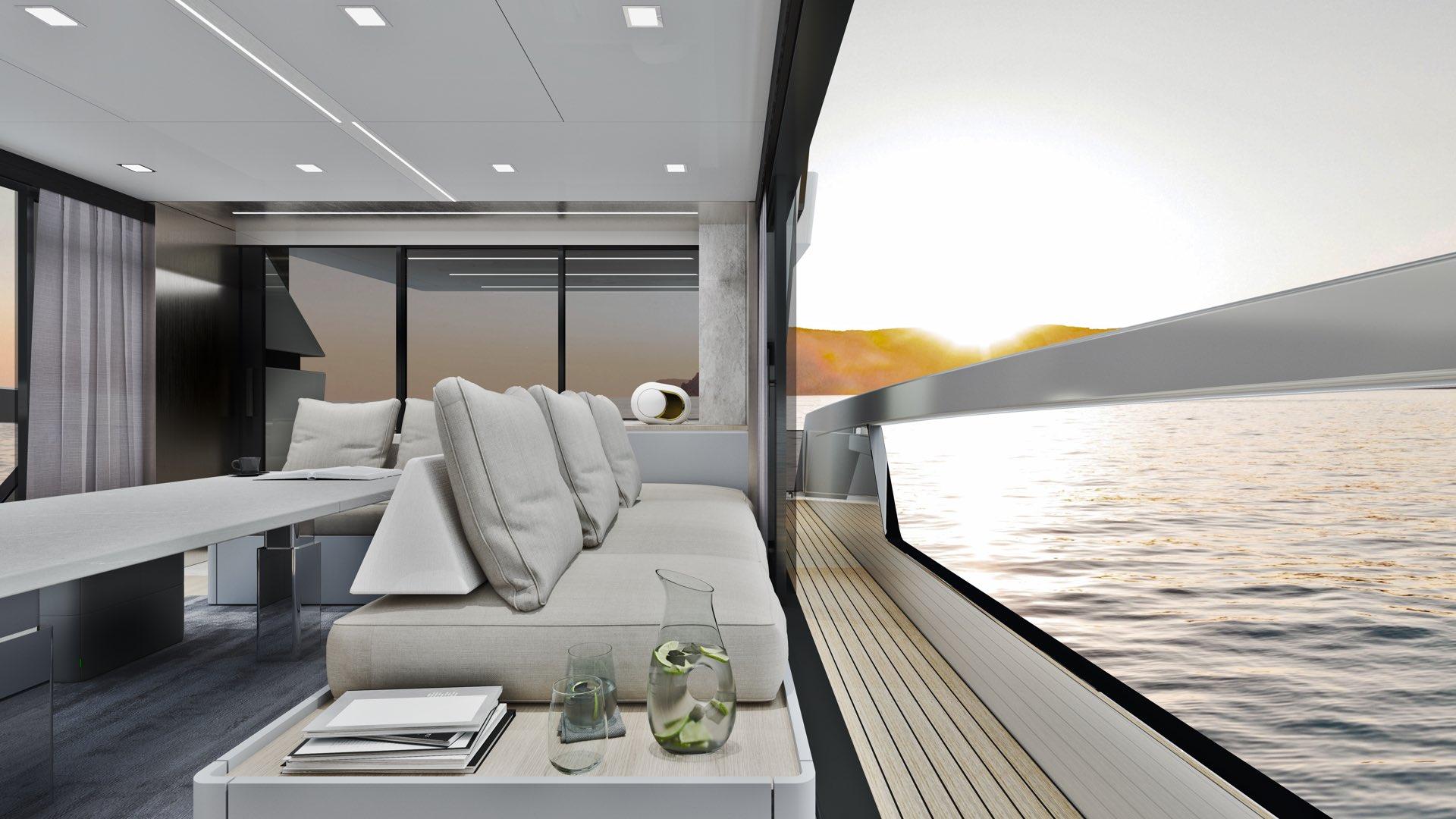• Spacious Salon: The expansive salon can be fully enclosed or opened with large sliding glass doors (optional), ensuring comfort in any weather.