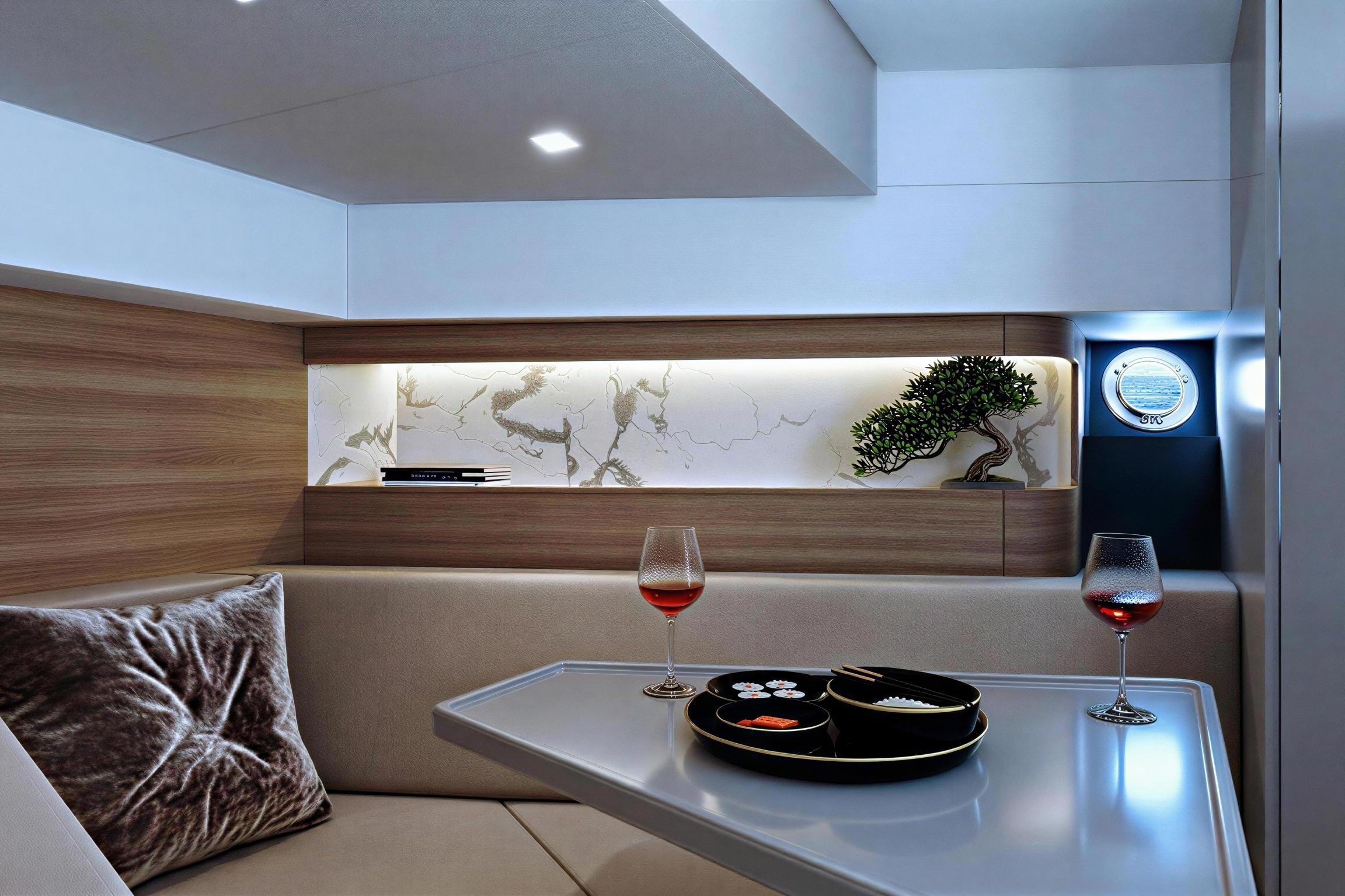 • Foredeck: Features a spacious sunbed for lounging and a bench for seating, with optional upgrades like an ice maker and freezer for added convenience.