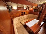 Large saloon with U-shaped settee to starboard, bench settee to port and dining table between.