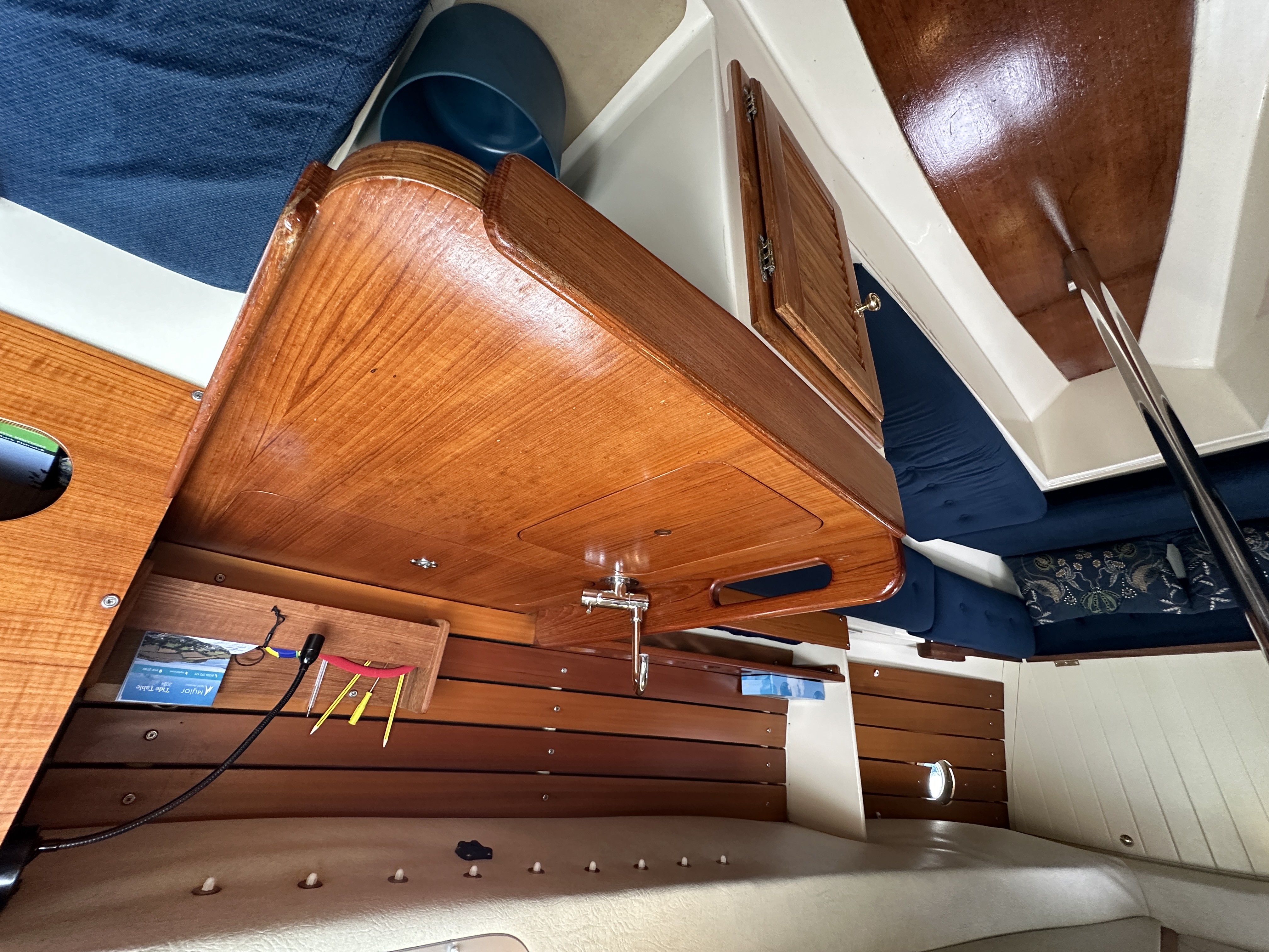 Pilot berth aft of chart table currently shortened and used for extra flexible water tank
