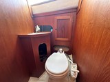 Heads compartment to port, between the forecabin and saloon, with marine toilet, washbasin with hot and cold pressurised water to a shower mixer tap, and stowage