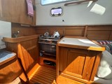 Galley to starboard with two-burner gimballed gas cooker with oven and grill, rectangular stainless steel sink with hot and cold pressurised water to a mixer tap, fridge (replaced August 2023) and stowage area along with ample working areas and stowage.