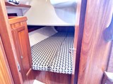Seating area to starboard. Generous hanging and shelved lockers to starboard