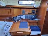 Navigation station with chart table, wooden seat with stowage underneath
