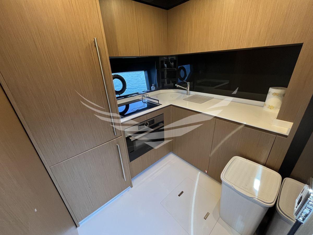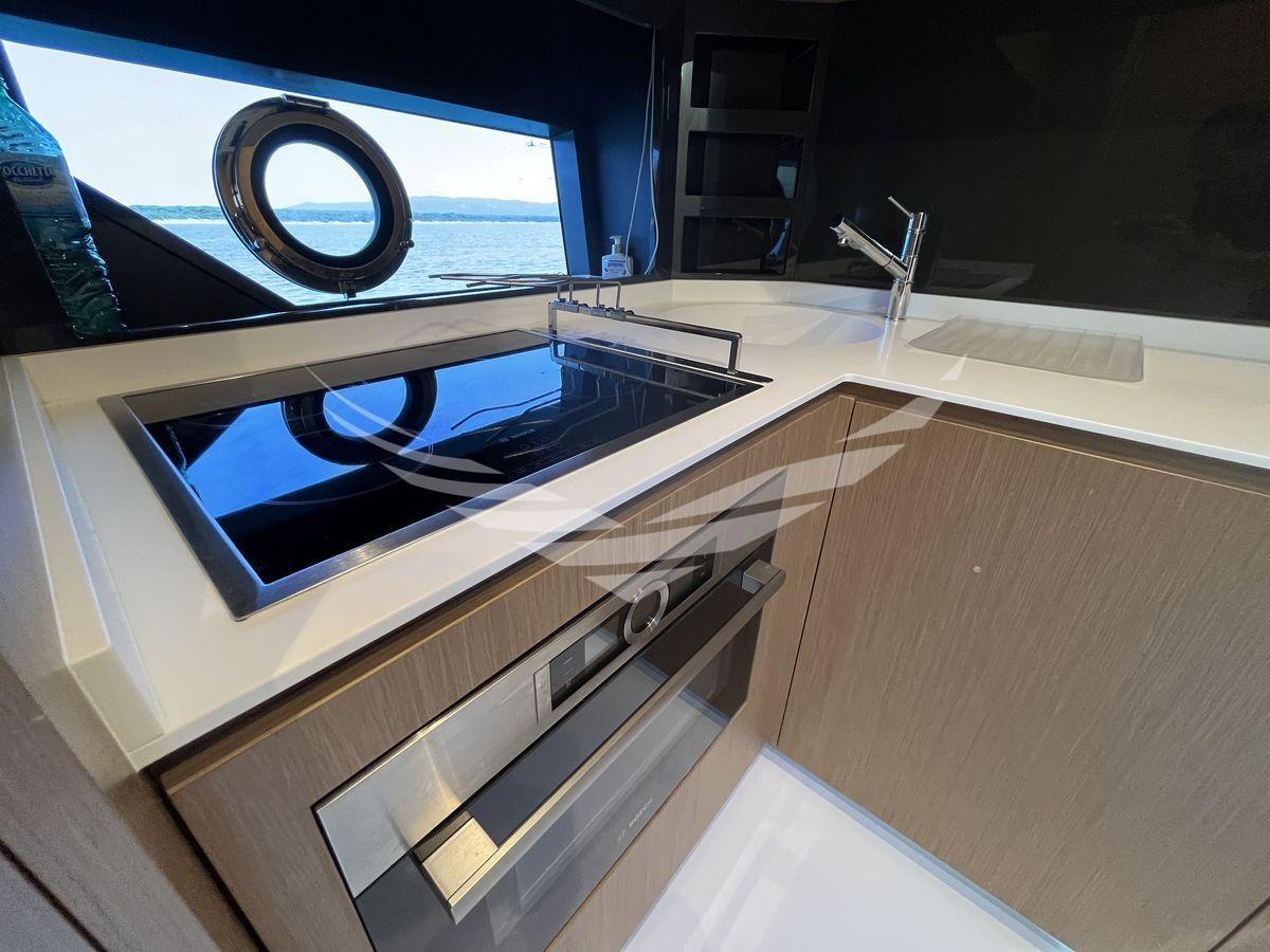 Disposition : 1 cabine principale au milieu du navire avec salle de bain, 1 cabine VIP à l’avant avec salle de bain, 1 cabine invités avec deux lits plats et salle de bain à tribord