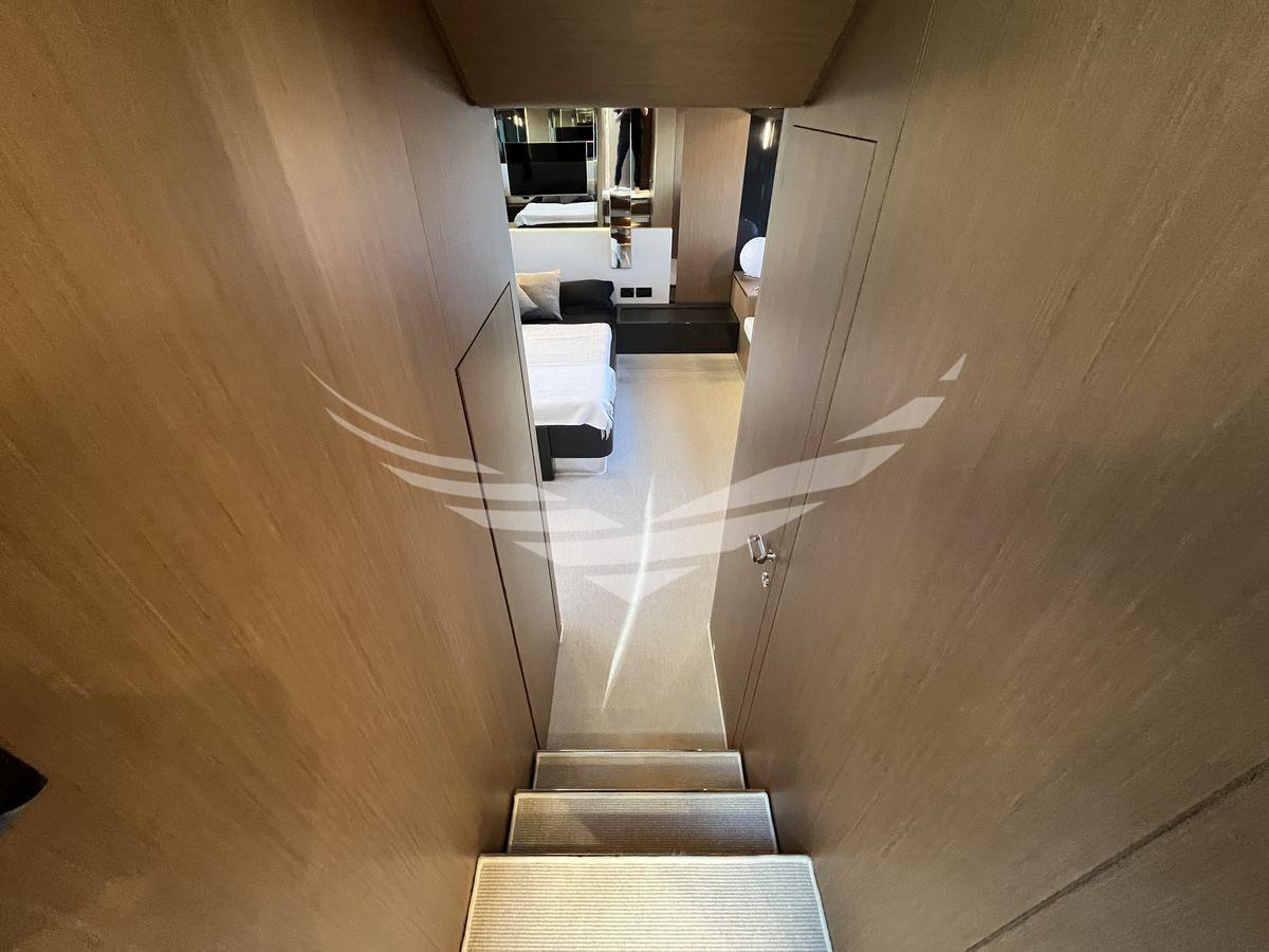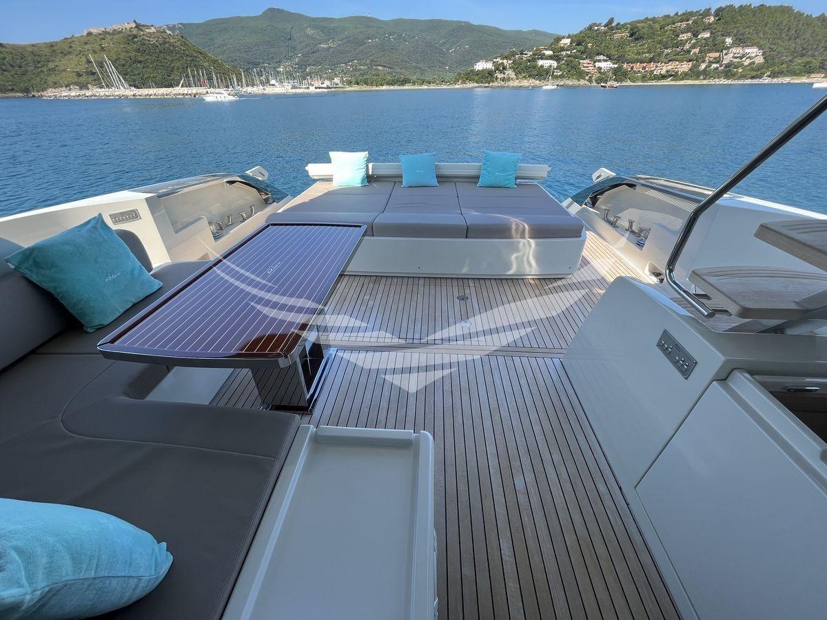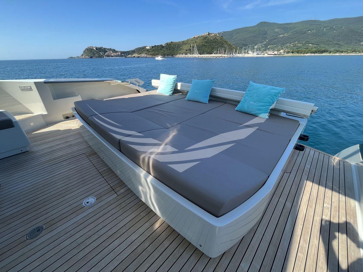 Layout: 1 Cabina master a centro barca con bagno, 1 Cabina vip a prua con bagno, 1 Cabina ospiti con due letti in piano e bagno a dritta