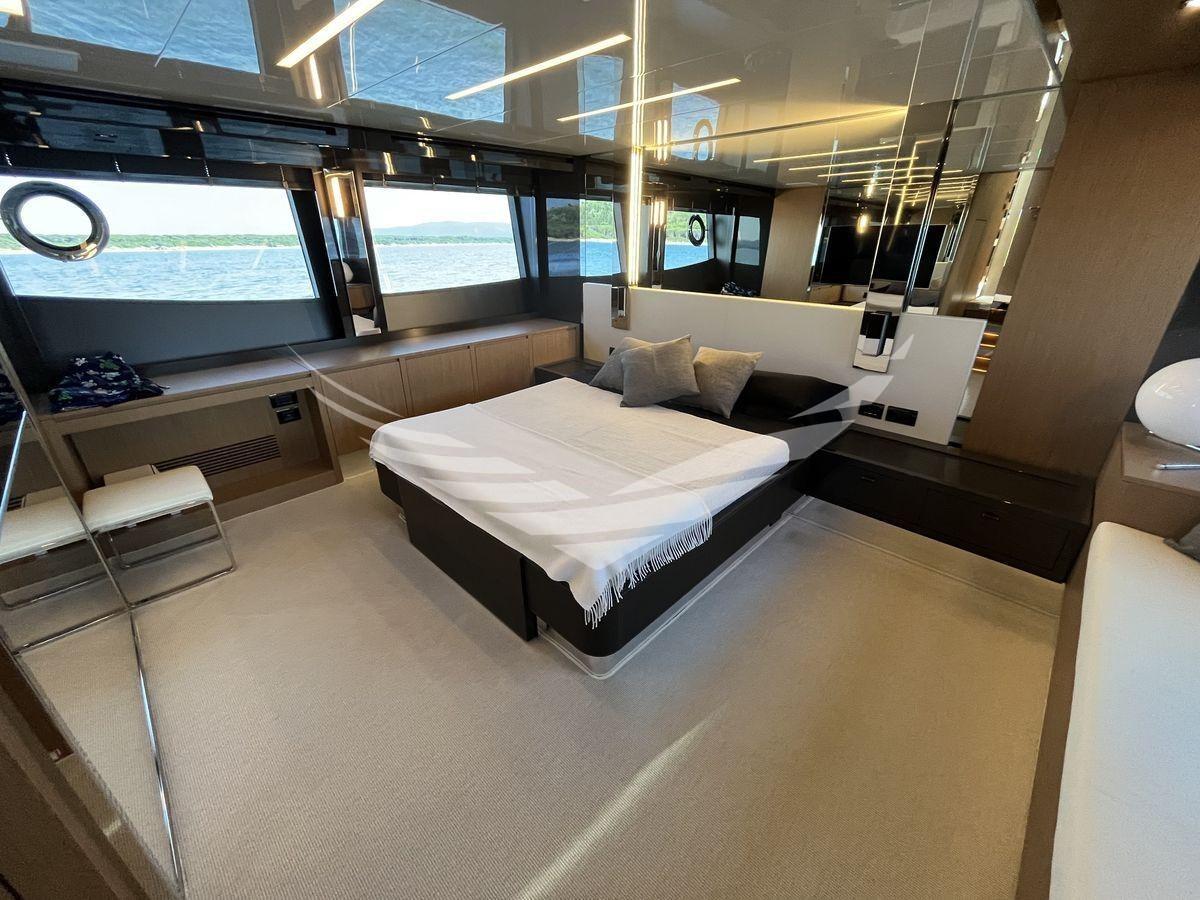 Layout: 1 Master cabin amidships with bathroom, 1 VIP cabin forward with bathroom, 1 Guest cabin with two flat beds and bathroom on the starboard side