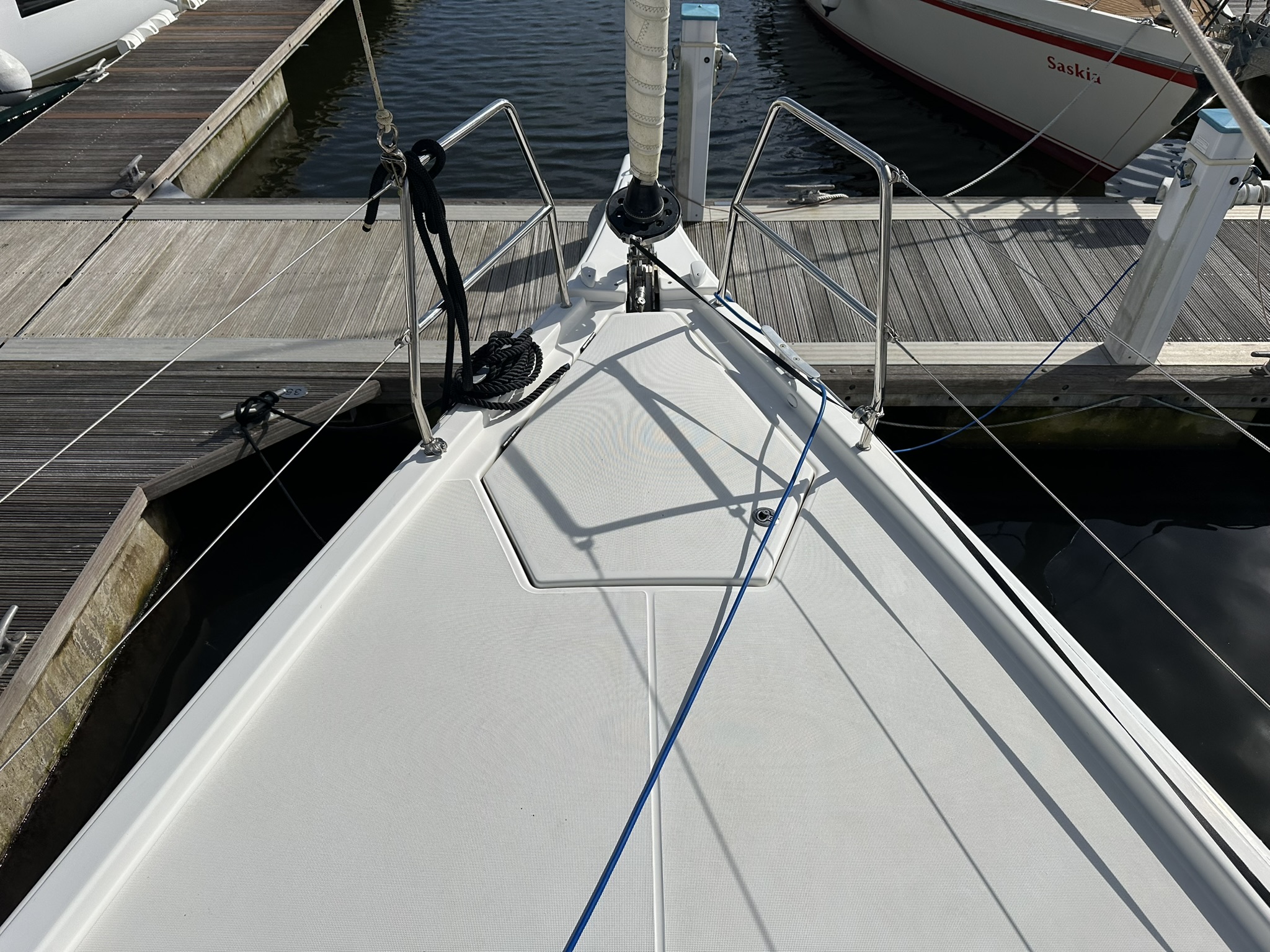 FORWARD CABIN - Central island double berth with drawer storage under, double-fronted wardrobe, high-level shelving along hull, reading lights, 2x hull windows with screens, rooflight, 2x opening hatches.