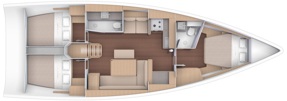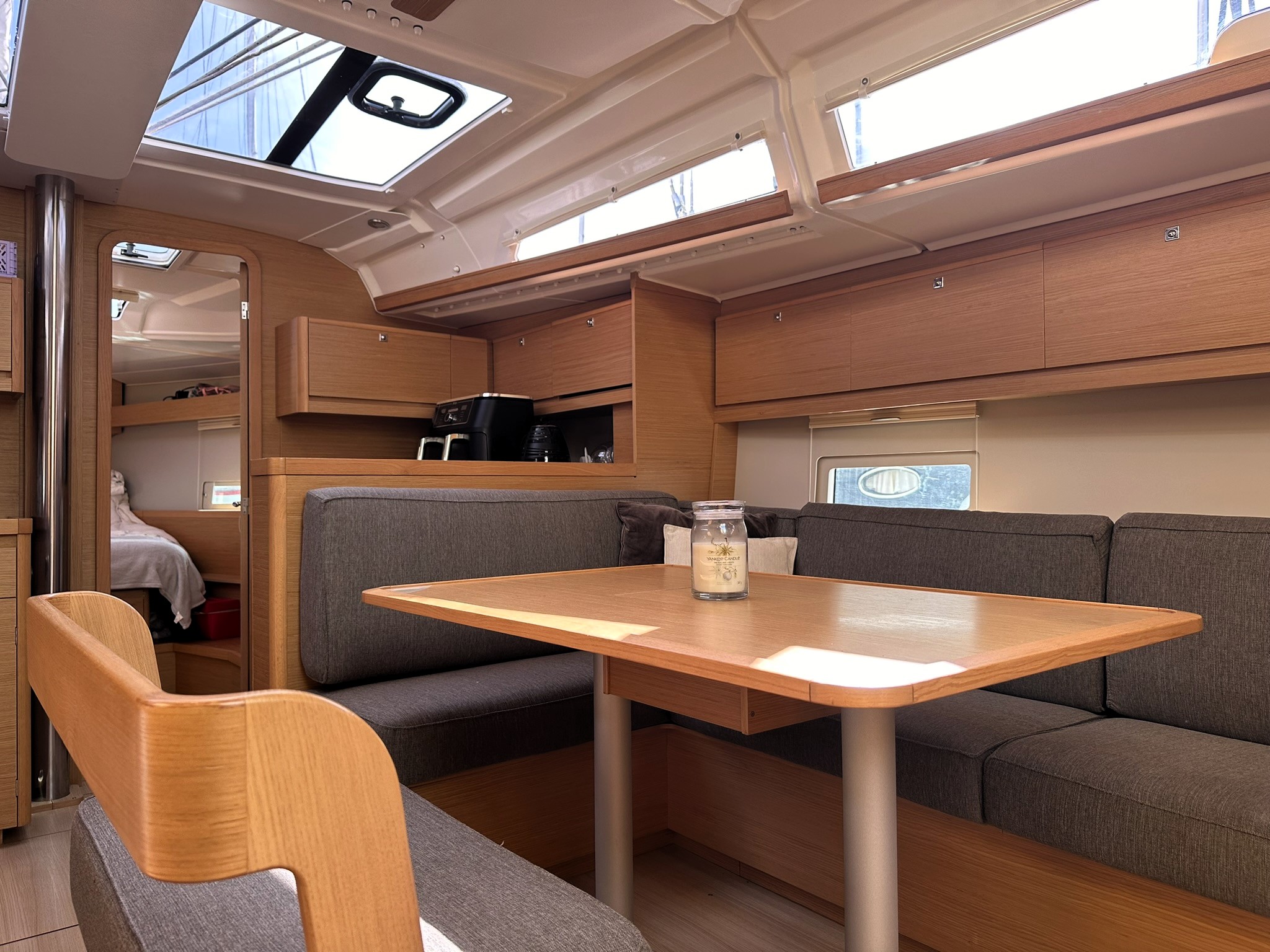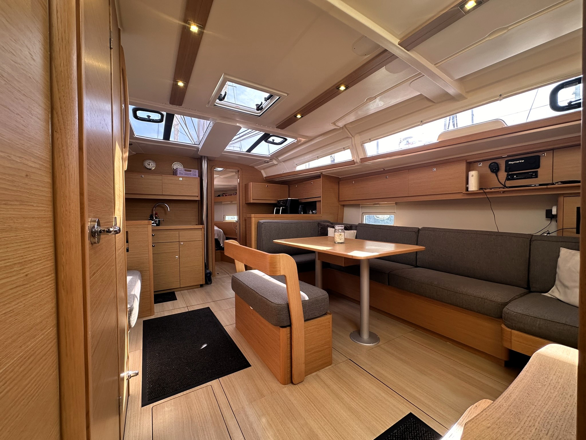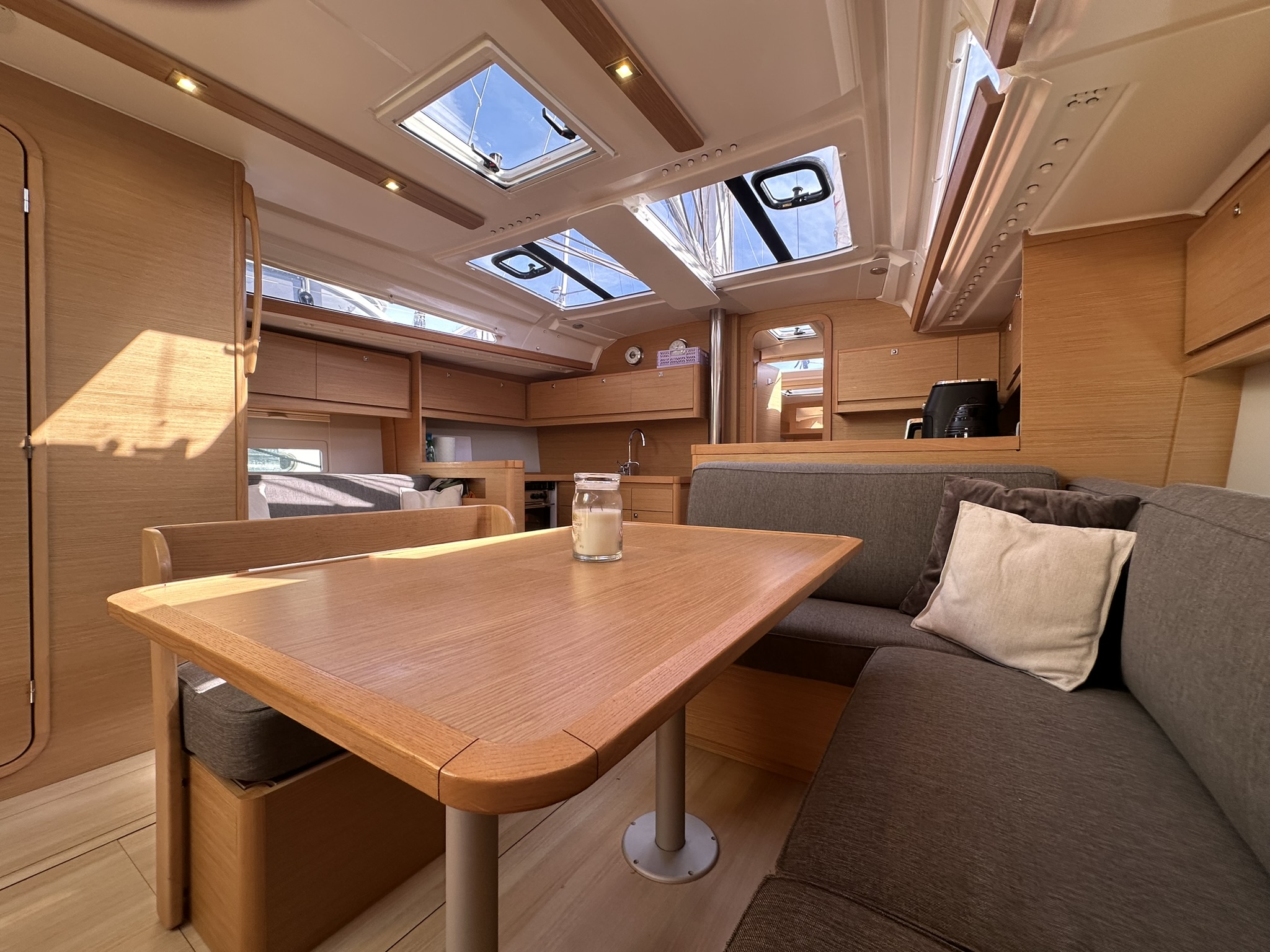 SALOON - L-shaped seating to starboard and centreline seat around table with second settee on portside (table convertible into berth), drop-down chart table to create additional seating, 2x wine cellars, 2x skylight hatches, 2x hull windows, opening hatch and opening portlight.