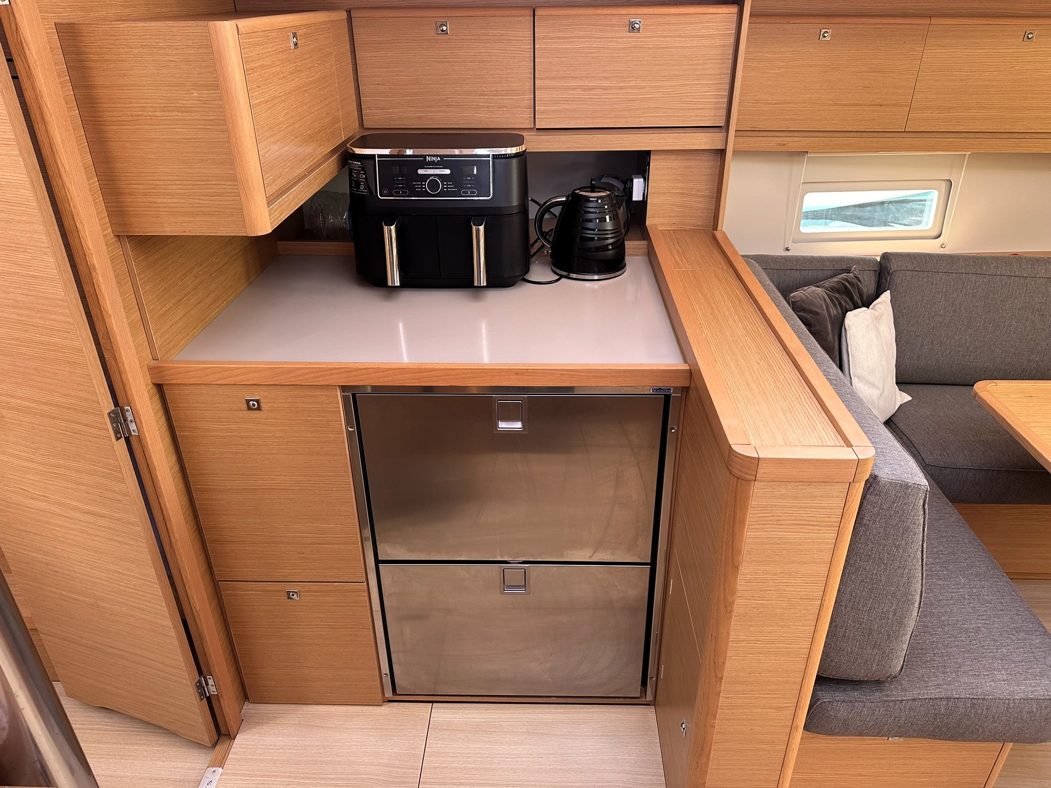 GALLEY - Split central galley positioned forward of the saloon allowing much better use of the living space. Microwave, 2 burner stove / oven. Sink with mixer tap, Aquafilter and separate seawater tap. Double stainless-steel drawer style fridge. Ample storage.