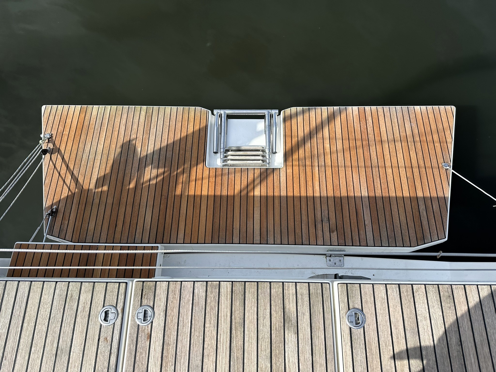 COCKPIT - Twin helm stations. Drop leaf cockpit table with cup holders, storage and removable light. Plancha gas BBQ and sink located under helm bench seat, cockpit lockers, additional storage under cockpit sole, designated liferaft stowage built into transom, electrically operated bathing platform.