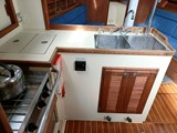 Galley comprising of a range of storage, melamine worktops, Force 10 two burner gas cooker with oven and grill, twin stainless steel sinks and a top loading re fridgerated icebox (new 2006)