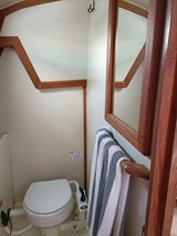 Heads compartment comprising of storage for toiletries, an inset dirty linen bin, marine toilet, hand basin and shower with teak grating and pump out to holding tank