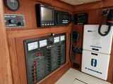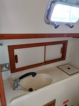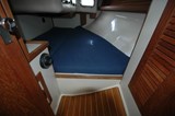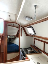 Shelves line the forepeak and there are two cedar lined hanging lockers, opening hatch to foredeck