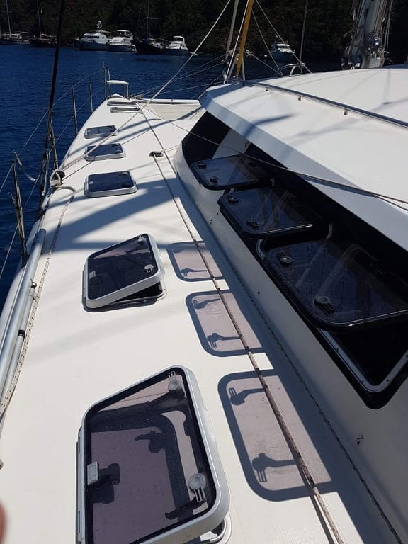 Each guest cabin has 2 deck hatches and 2 opening portlights, each head had 1 hatch and 1 portlight. Saloon has 10 opening hatches and large glass sliding doors with a step through from cockpit which provides protection from water ingress from cockpit. 28 hatches plexiglass replaced 2021(only plexiglas)