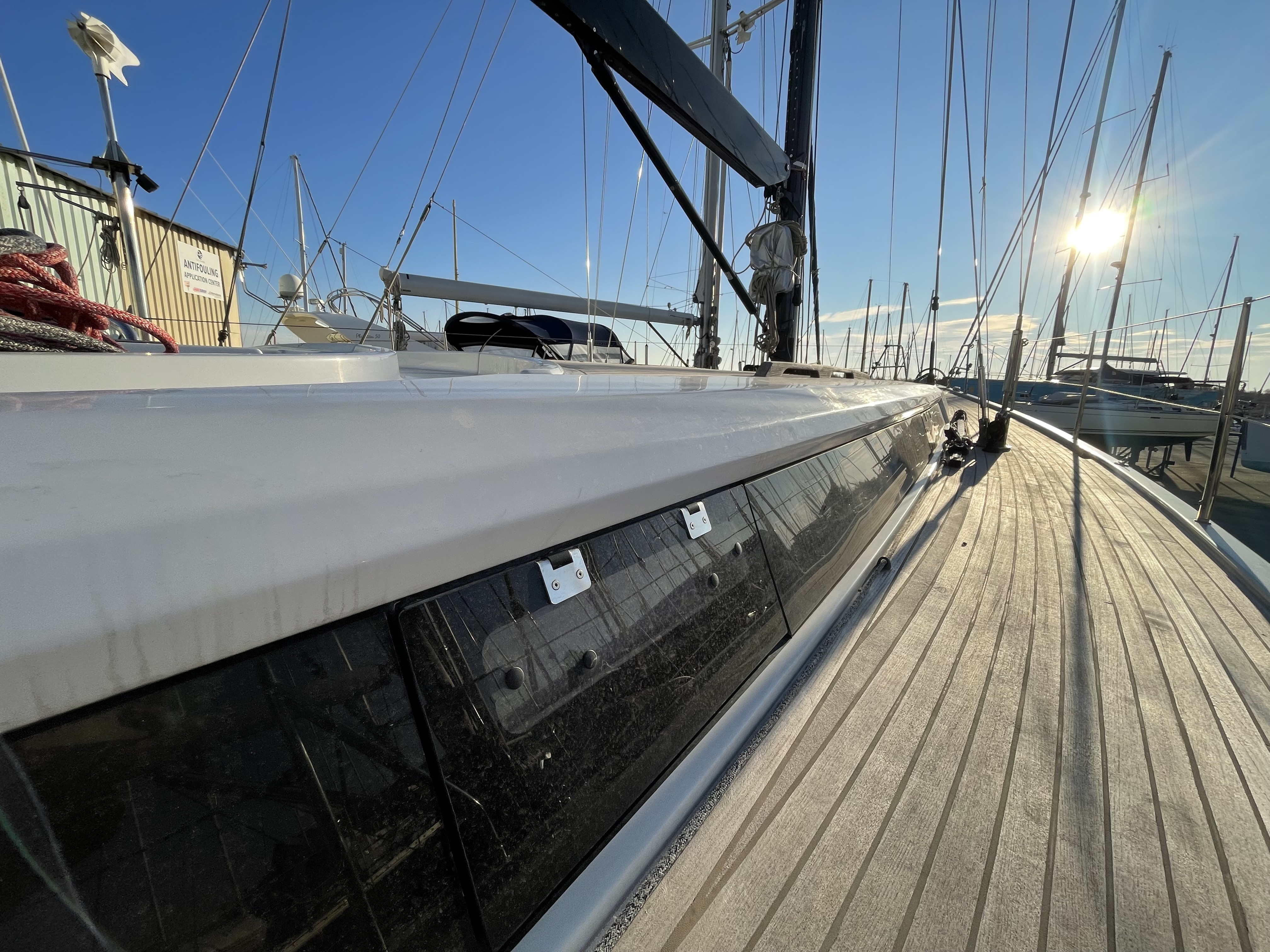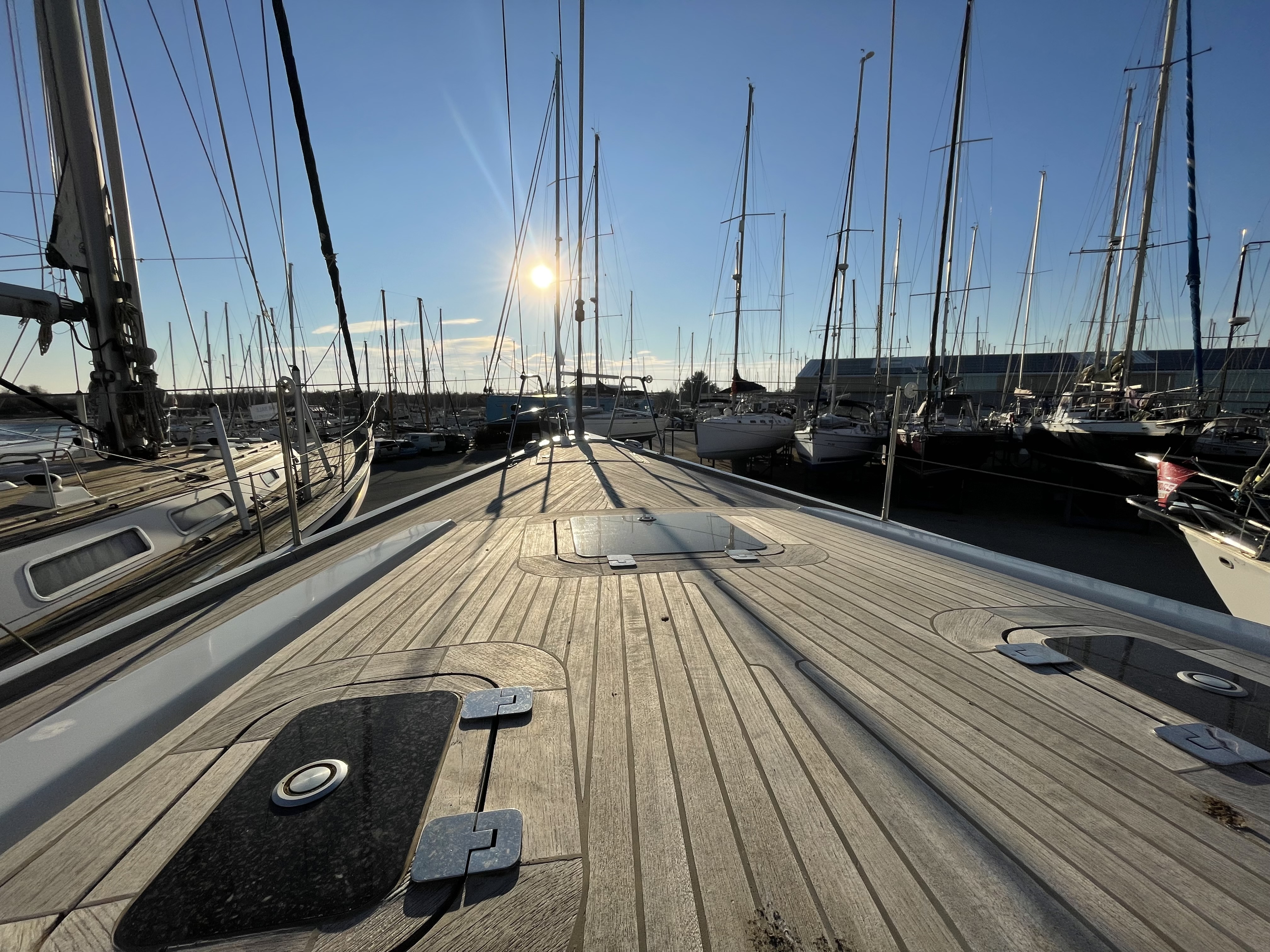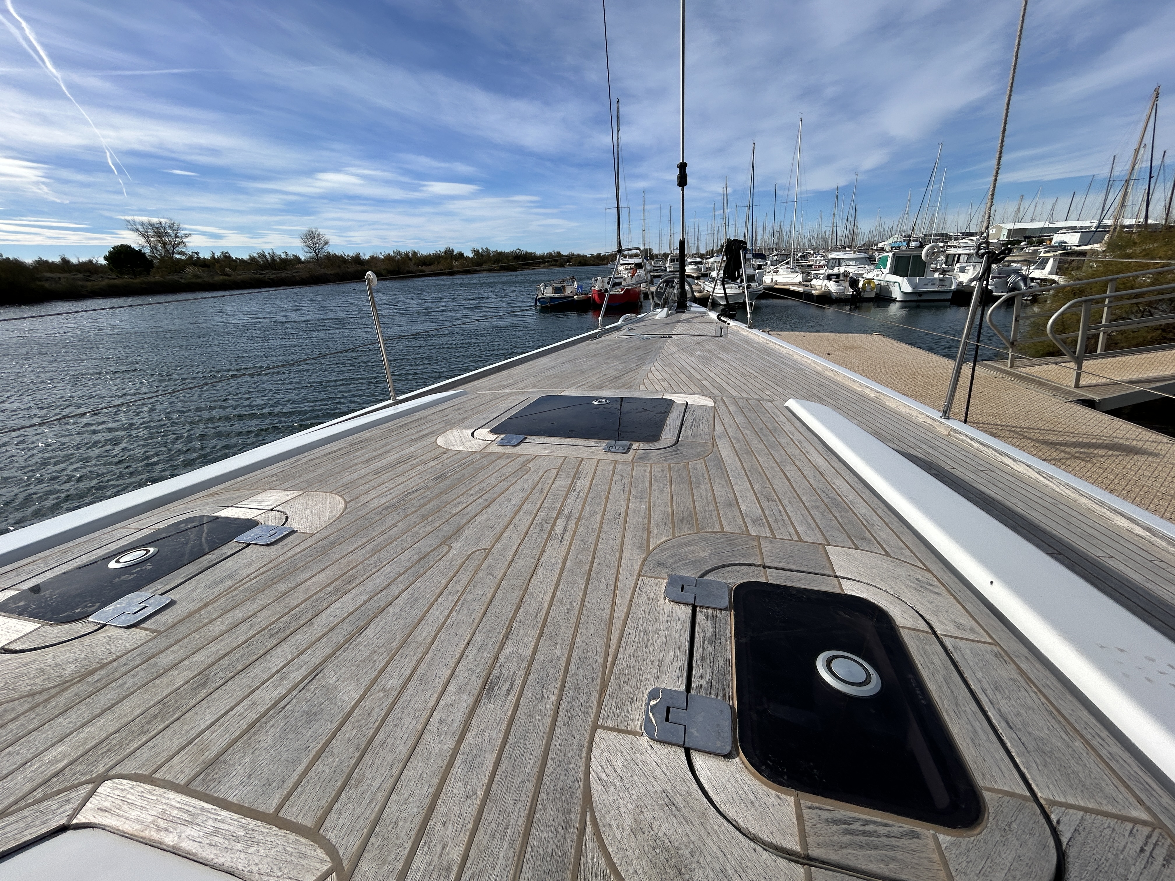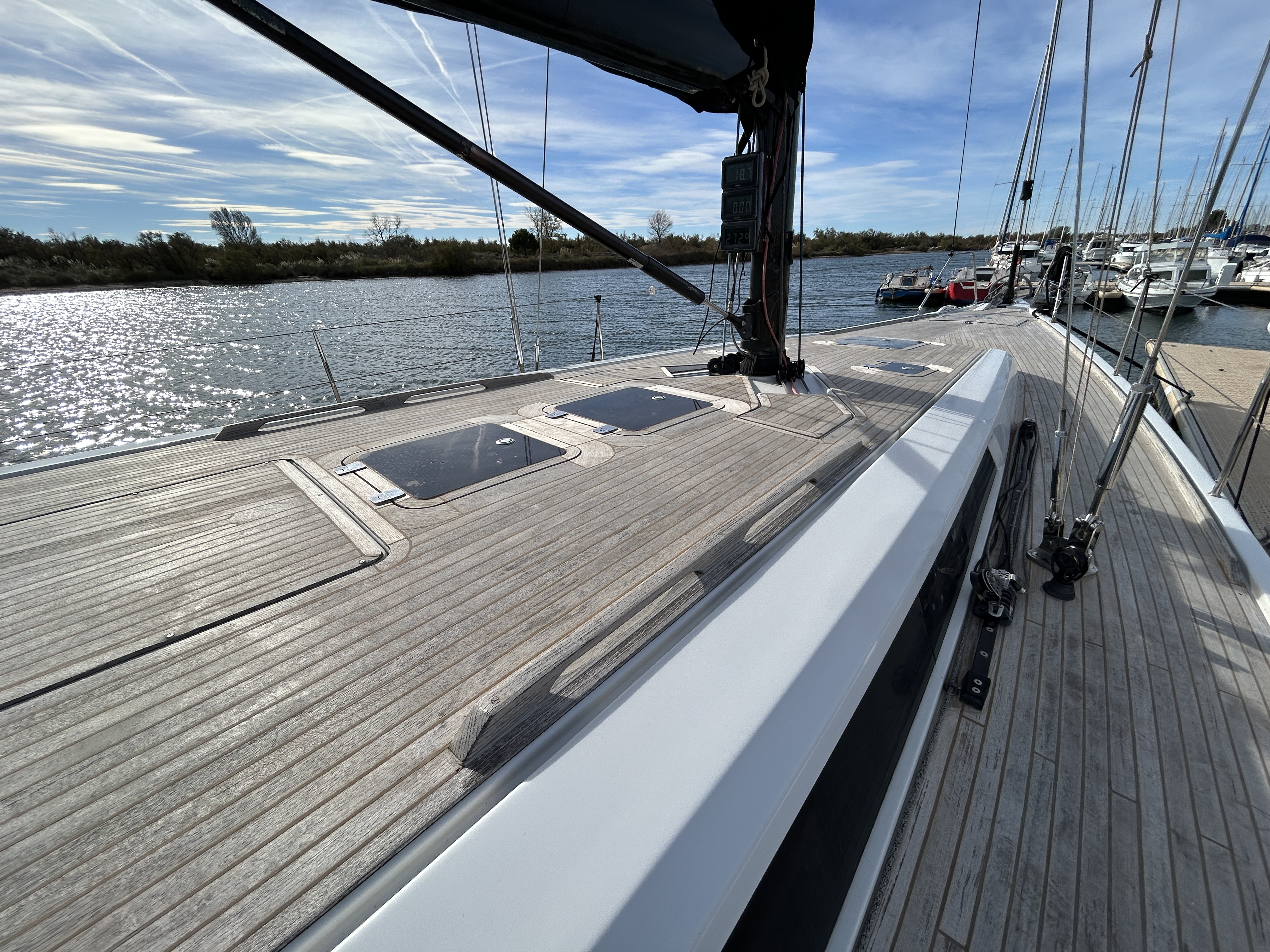 Teak decks with grey caulking, side deck,cockpit, coach roof and platform