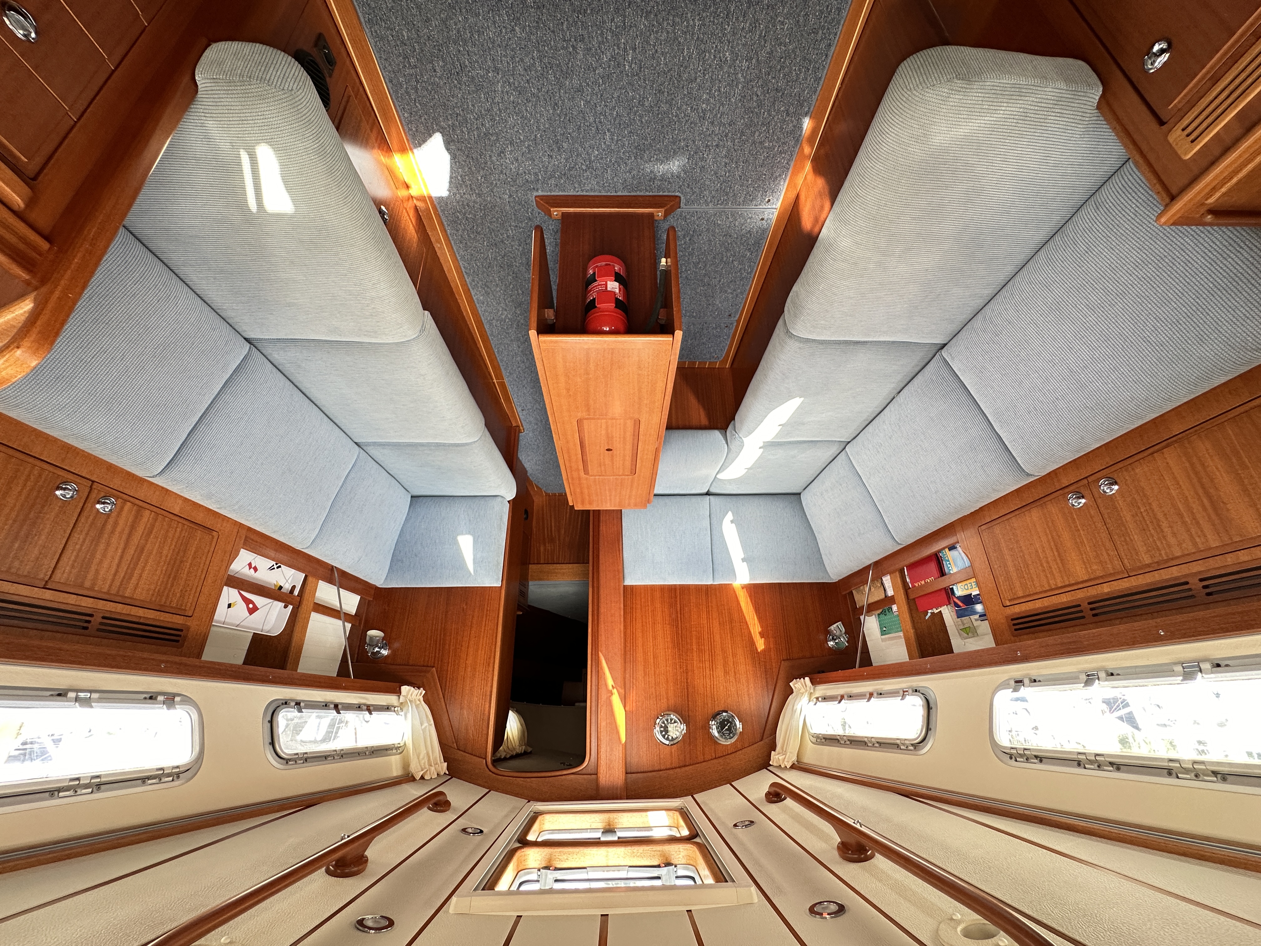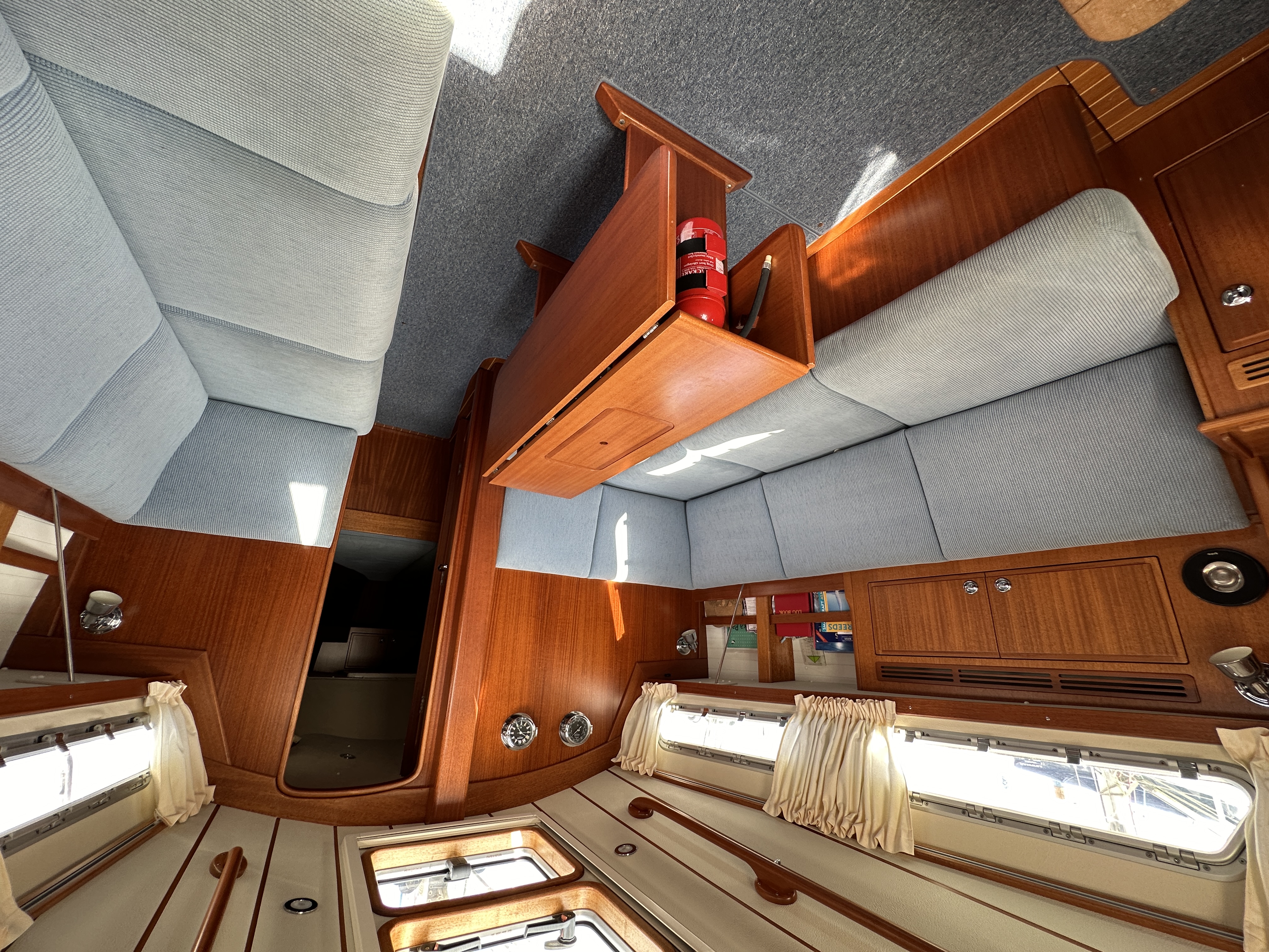 Bright and roomy. On port side an L shaped 2m / 6’ 7’’ long sofa, on starboard a straight 2m / 6’ 7’’, with hinged backrests.