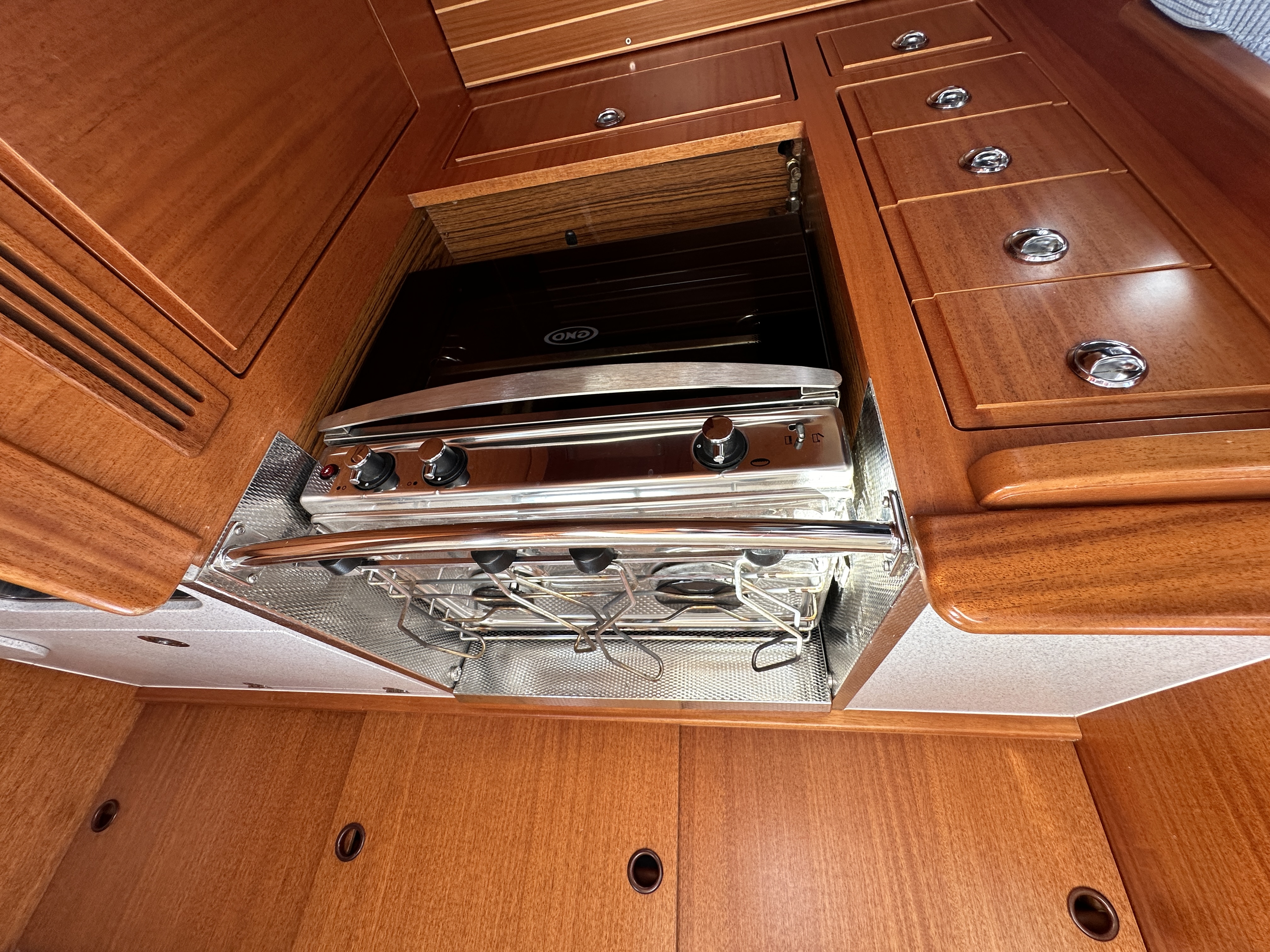 Mahogany interior with a matt silk varnish below decks, flush fitting locker having ventilation grills and discreet hinges. Teak and holly striped sole boards.