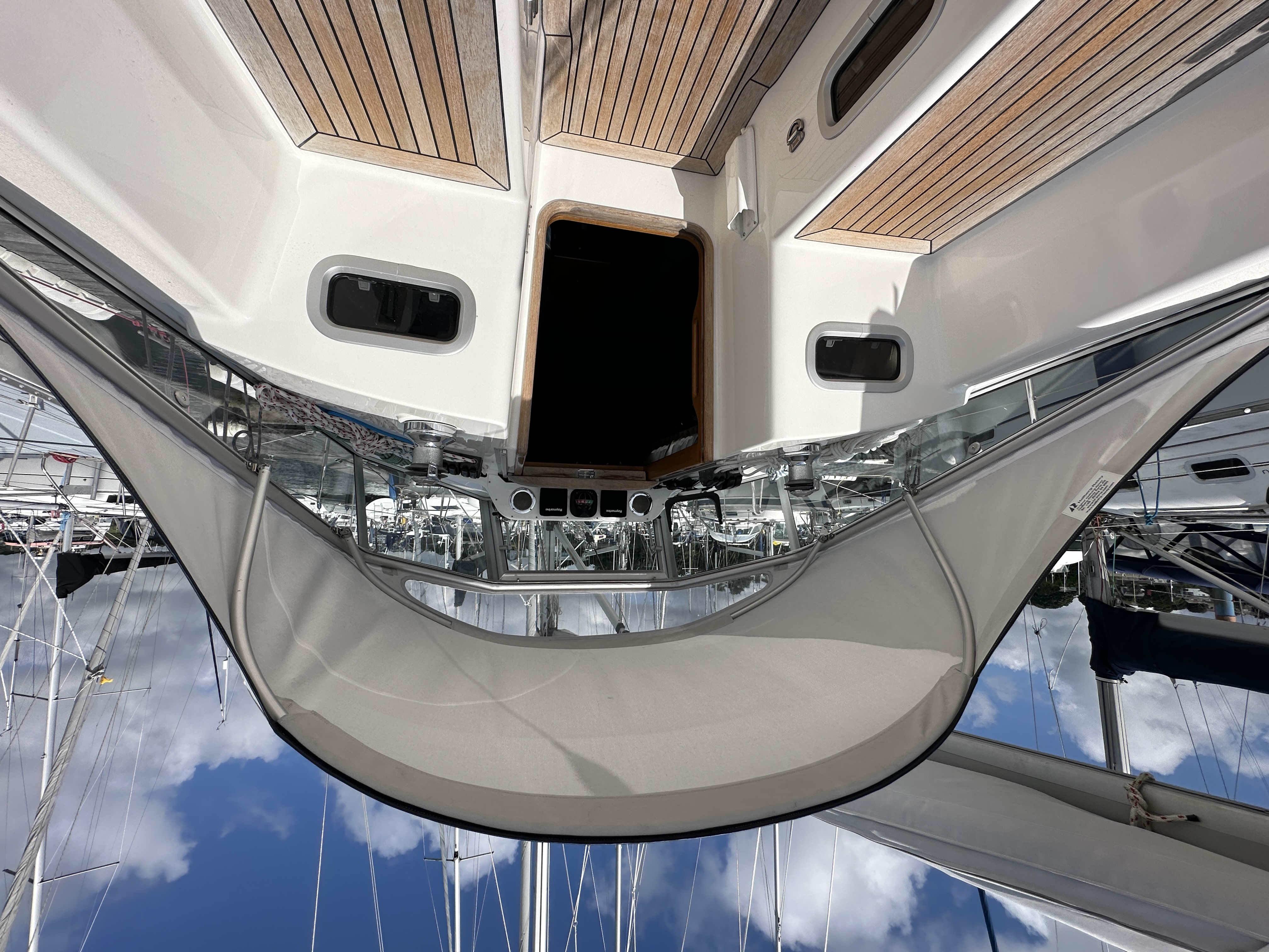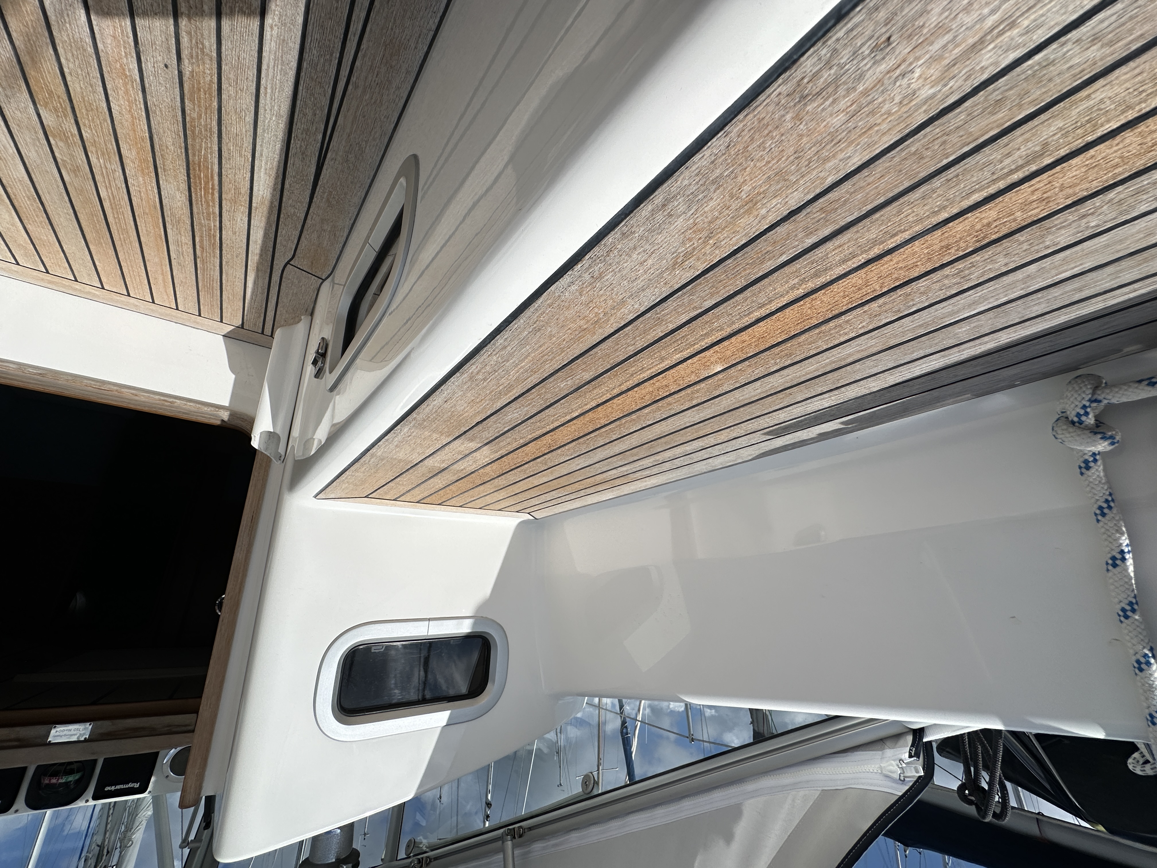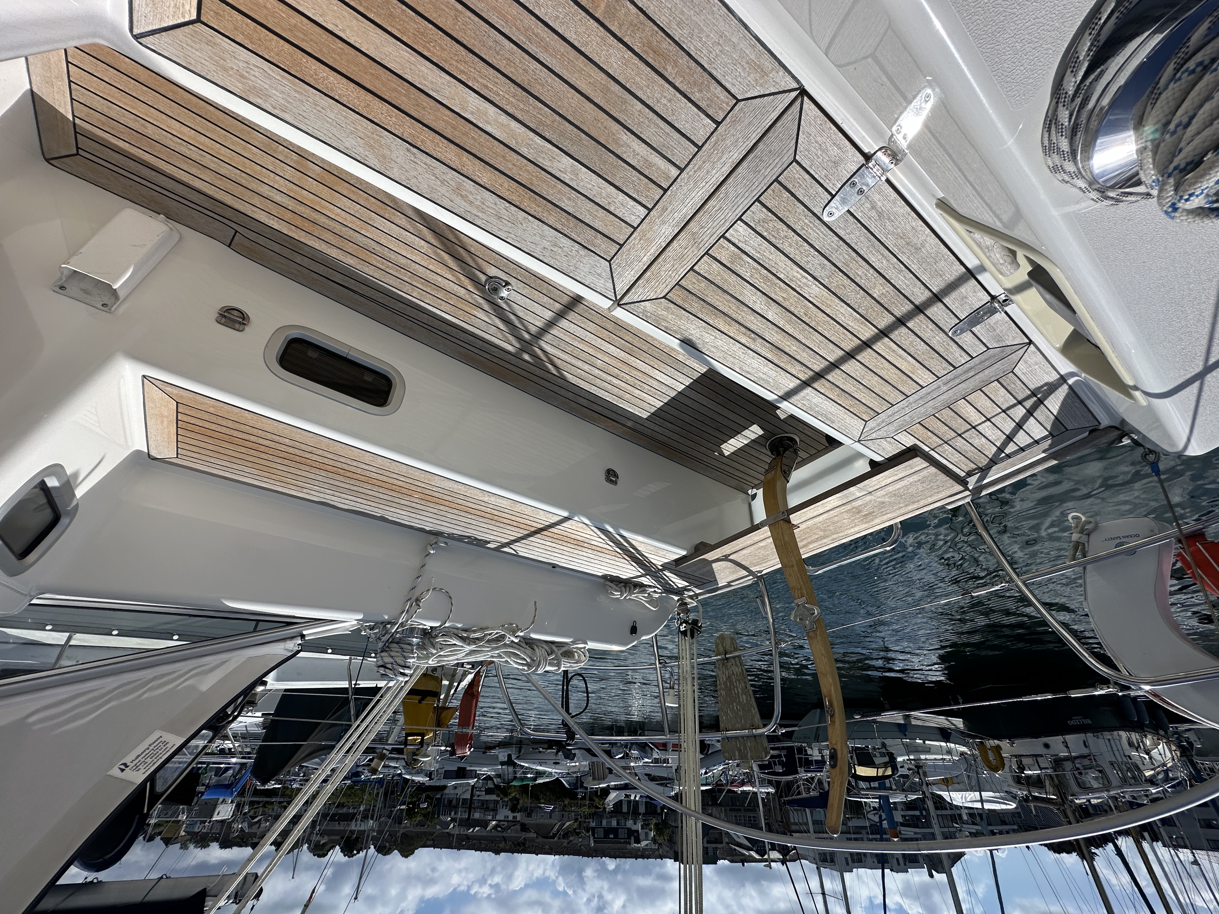 Teak side decks, toe rail, cockpit seats, cockpit floor and bathing platform
