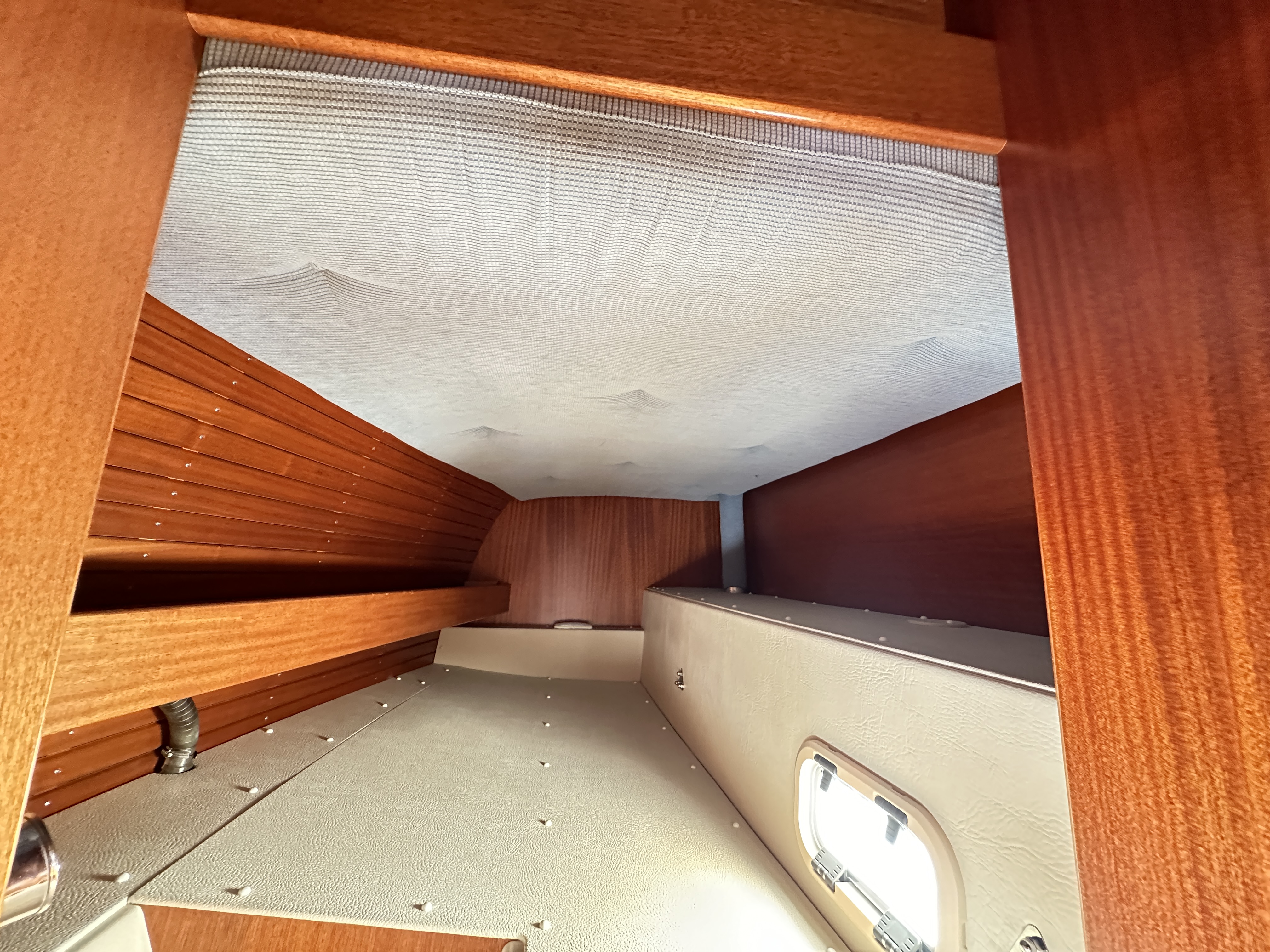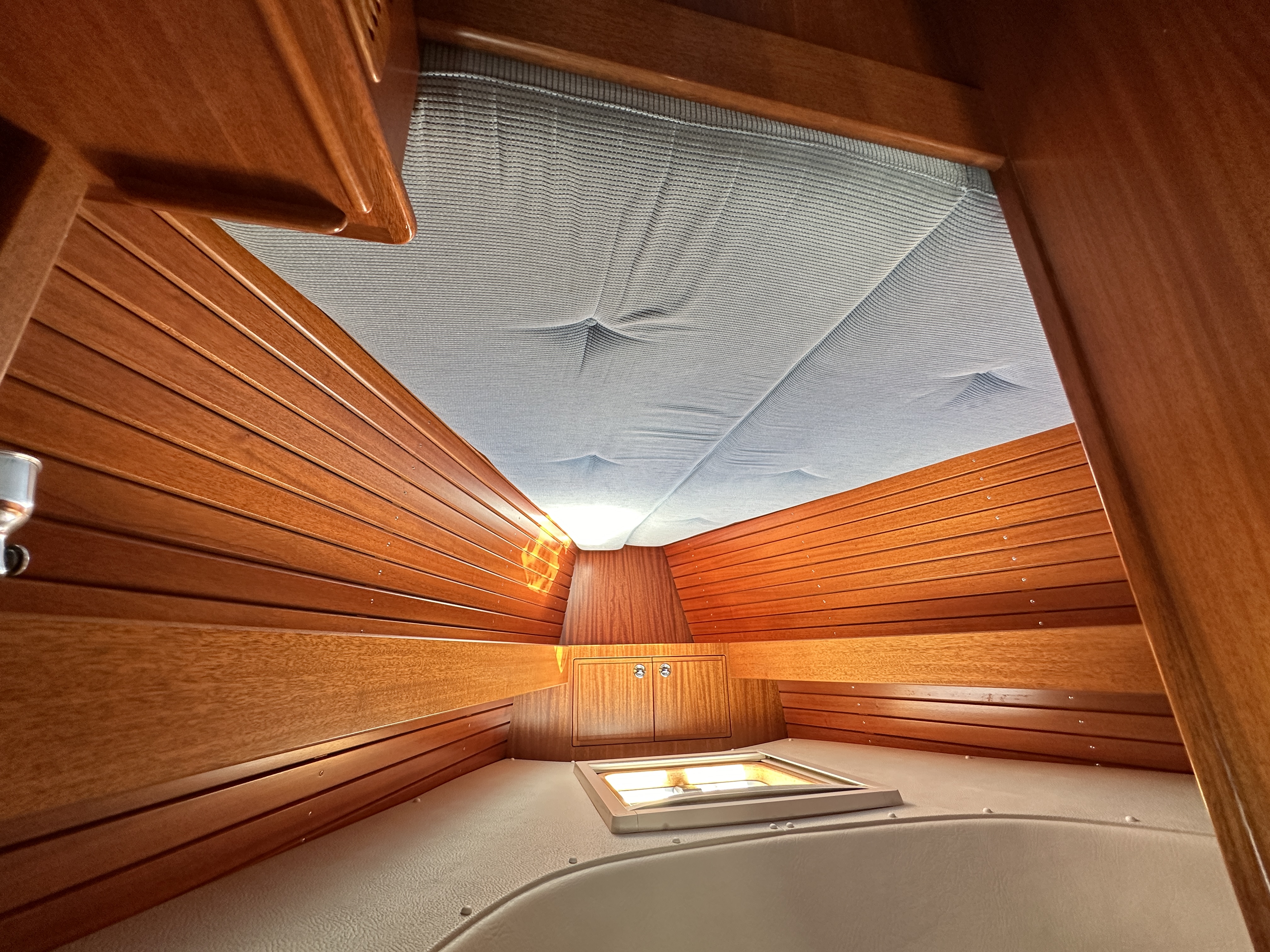 Light vinyl head linings through out with mahogany strips in he saloon.