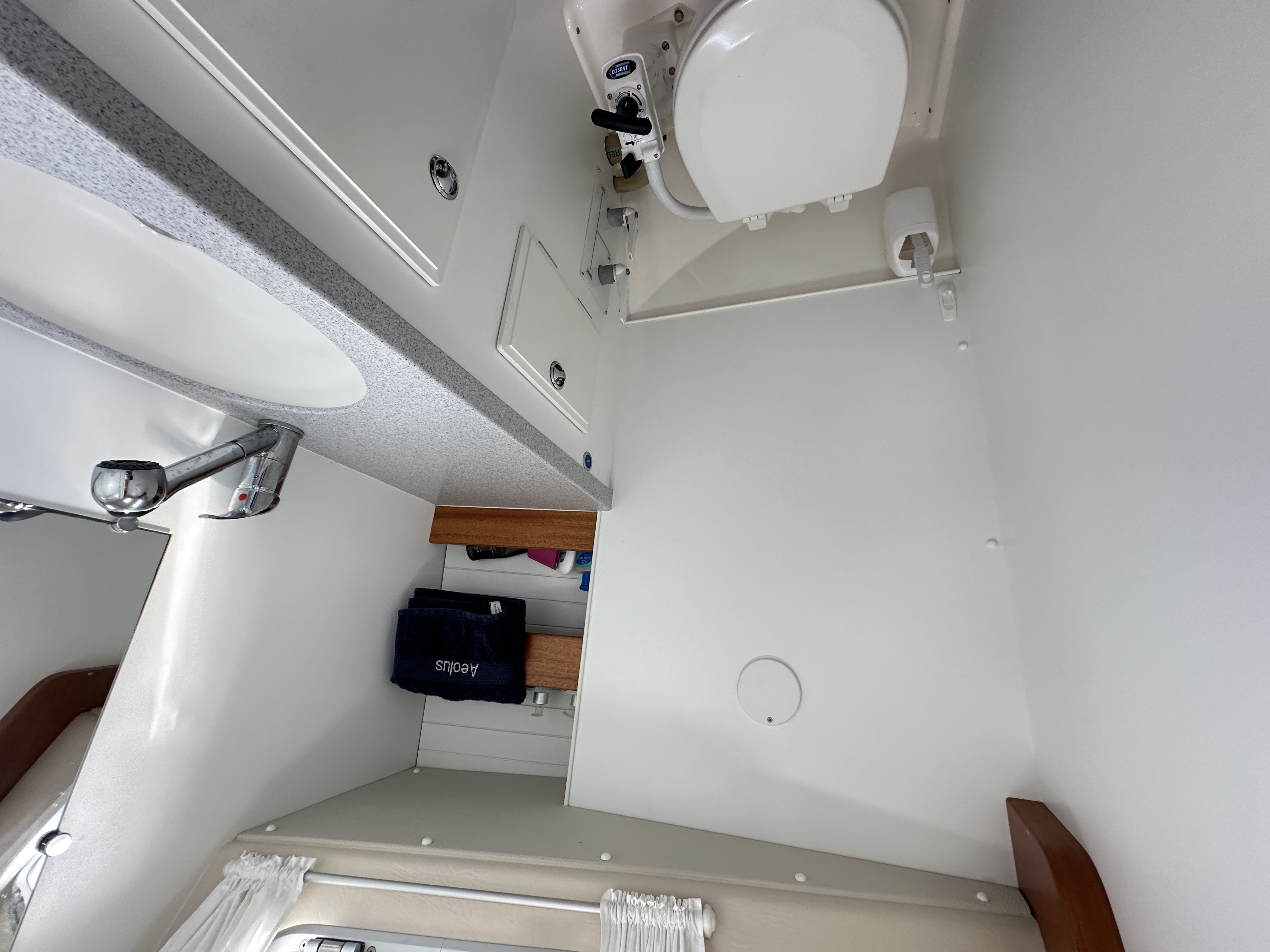 Vanity unit and hanging locker to starboard.