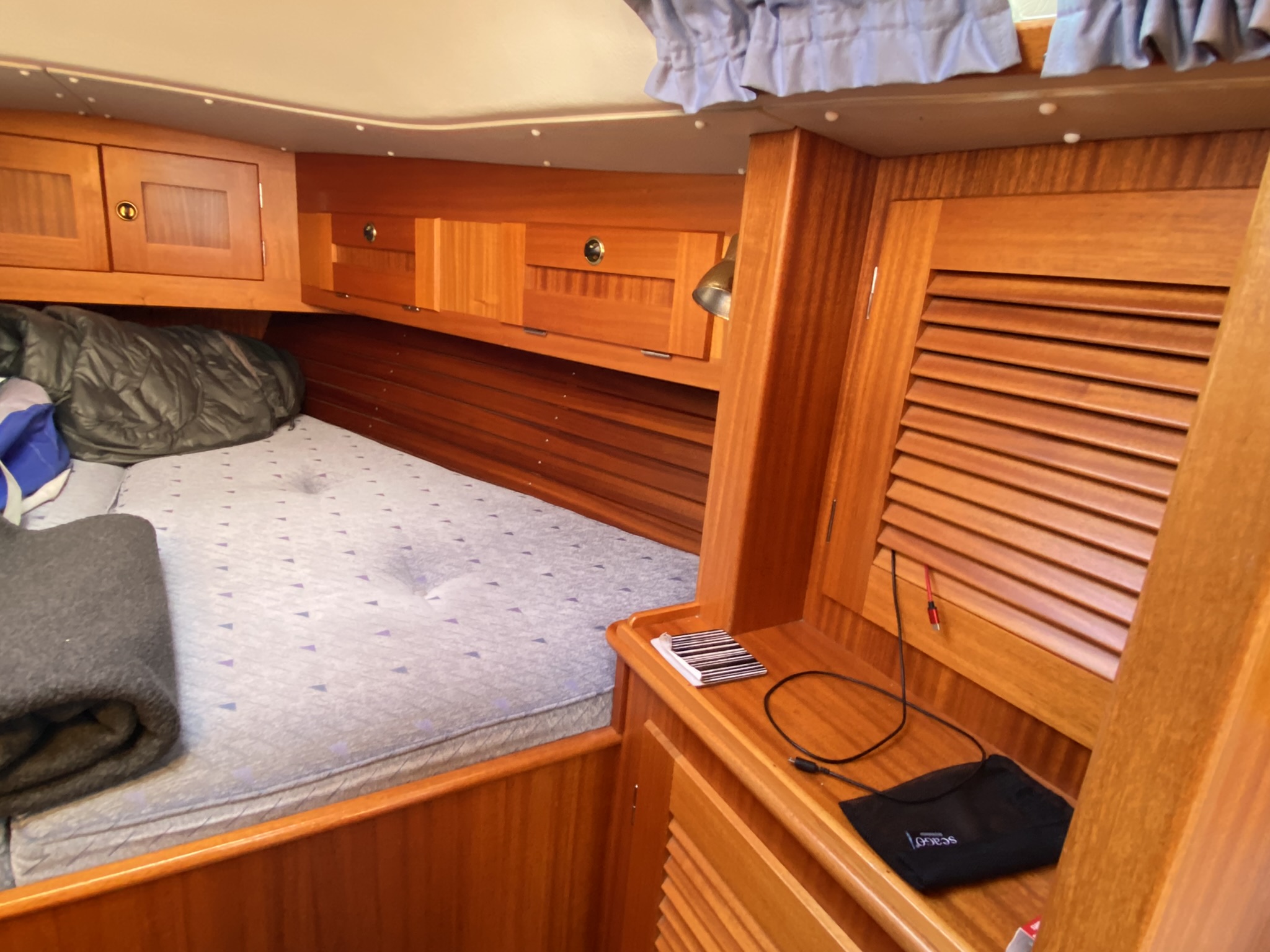 Forward cabin with double berth, generous stowage and hanging lockers on both sides