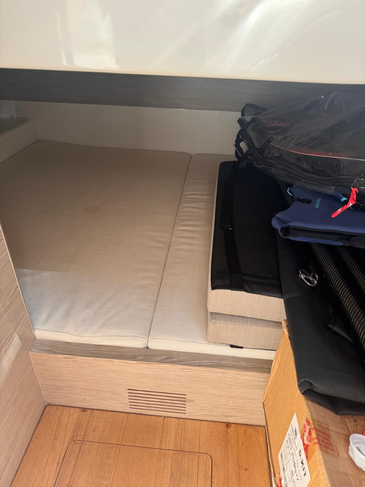 La disposizione interna prevede una cabina armatoriale a prua con letto matrimoniale, un bagno con box doccia e una cabina ospiti con letto matrimoniale a tutta larghezza. In più, il Rebel 47 offre uno spazio cucina attrezzato, una dinette con divano e libreria, e ampi ripostorii.