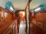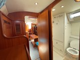FRONT CABIN: Two berths convertible into a double bed, leatherette upholstery (2022) with plenty of storage space and wardrobes. opening deck hatch. Head compartment with washbasin, manual WC and separate shower.