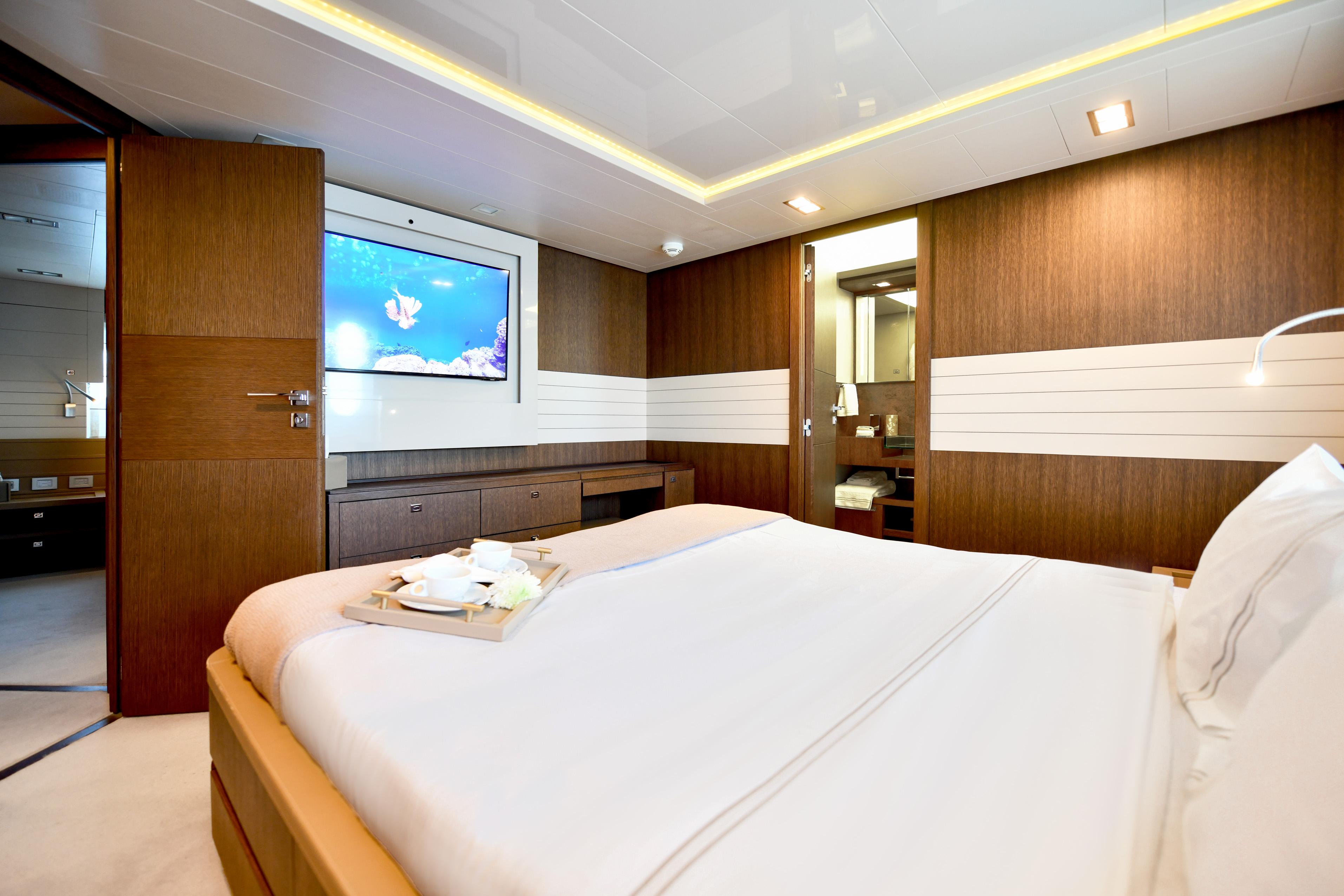 The full-beam, on-deck owner’s suite offers panoramic views and natural light via its top to bottom windows.