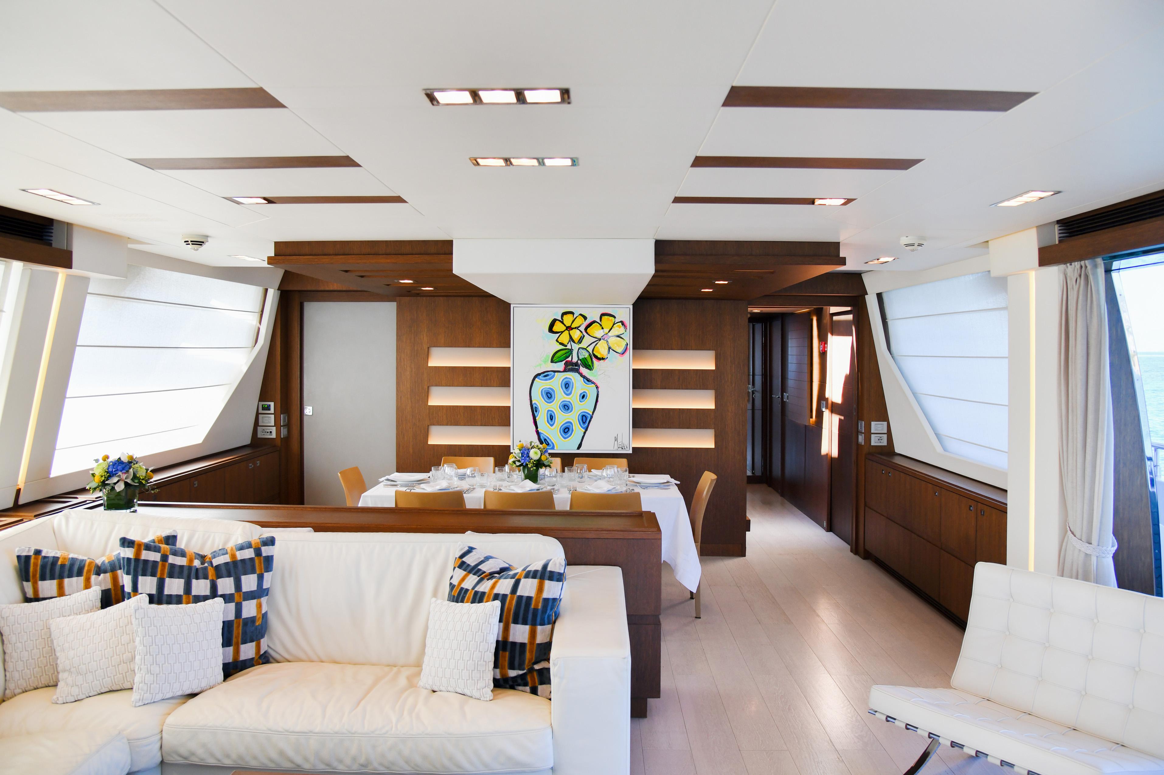 Five spacious Guest cabins all with ensuite bathrooms with the Full beam On Deck Owner's Cabin. Dual walk in closets in the Master stateroom, dual sinks, shower and head with Bidet All guest cabins below deck have Panoramic windows with stunning views of the Sea Two foldable banks at the forward guest cabins Access to the lower deck guest staterooms direct from the Crew quarters via private entry 3 Crew cabins with ensuite bathrooms and spacious Crew quarters Salon Electro hydraulic Sliding doors to access the beautiful fold down balcony, providing you unrestricted view of the water Full walk around decks. Portuguese Bridge Forward Seating area on each side of the bow with tables Forward large sunbathing area Forward Garage with crane for small tender storage, or extra freezers and other equipment Four docking stations: Pilothouse, Flybridge port and stbd, Aft deck Spacious aft deck with dining table that comfortable seats 12 Aft deck couch seating reverses fore and aft which can be used as a mezzanine seating for the beach club area Beach Club hydraulic swim platform Garage for Tender storage Well appointed and spacious Flybridge with Jacuzzi, designated Sunbathing area , Bar. Retractable Hard top. Comfortable Staircase to Aft Deck. Al fresco dining that seats comfortably 12 guest Very spacious Engine room with only the Generators and main engines Designate Room for Pumps / AC / Electrical systems / Emergency steering. Custom Line Shore Power Converter unit Hydraulic Swim Ladder Gyro ARG Zero speed stabilization New Williams Tender 395 in 2022 SummerEquipment List