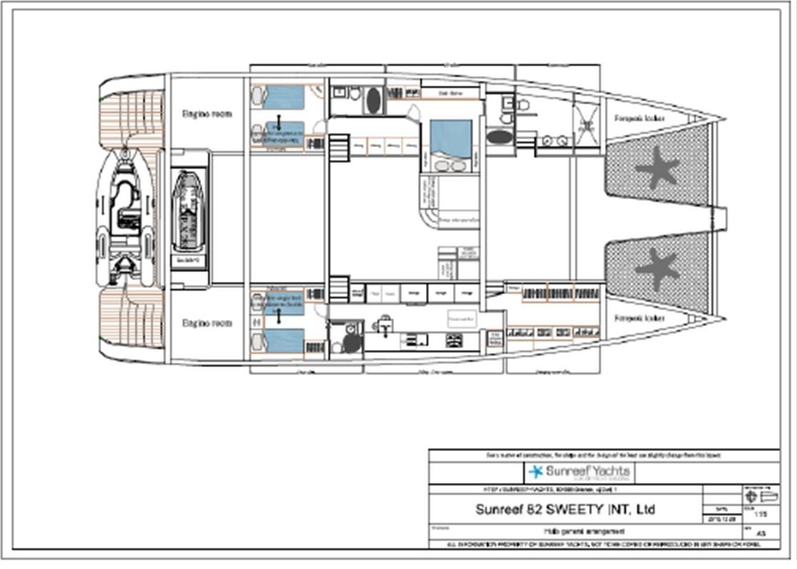 The owner suite, arranged over two floors, is set to occupy the entire forward section of the yacht with a master cabin, Jacuzzi and vanity on the main deck, and wardrobe and floor-to-ceiling storage and bathroom located below decks in port and starboard hulls respectively.