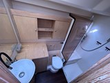 En-suite heads with marine toilet (replaced in 2018 with Jabsco pump) sink, mixer tap and shower and cupboard