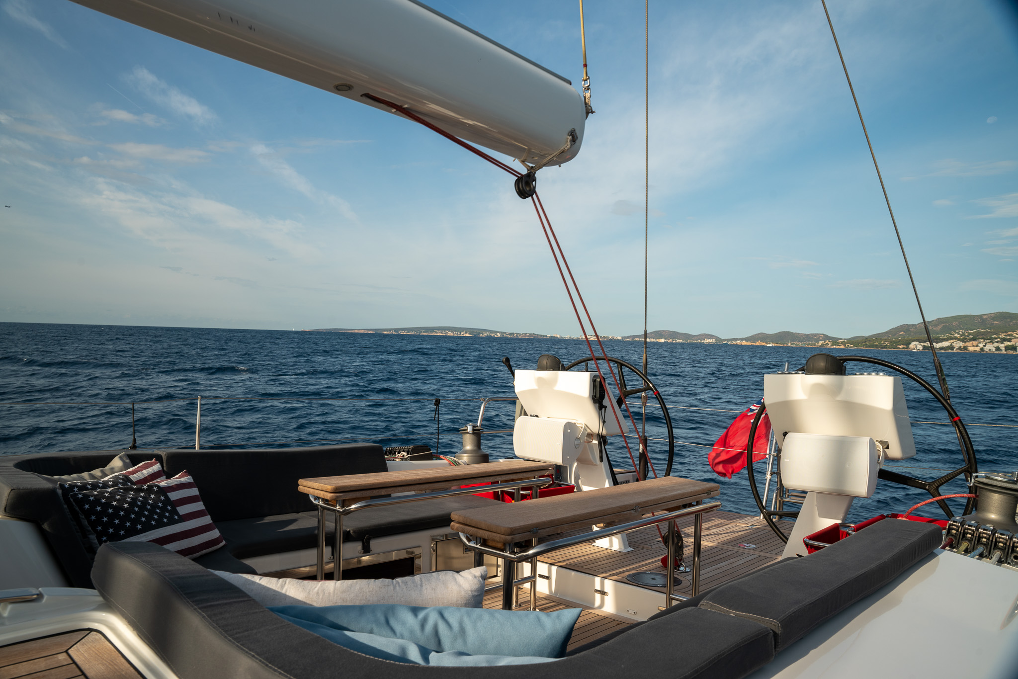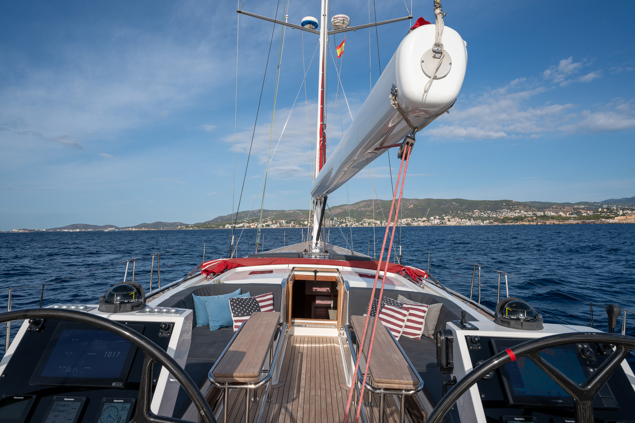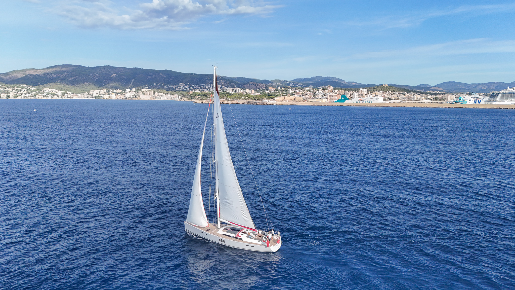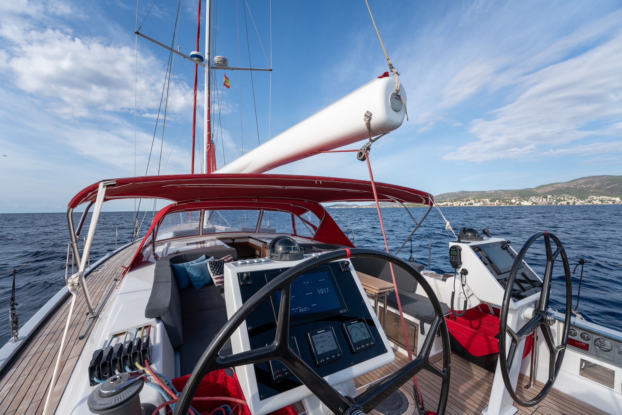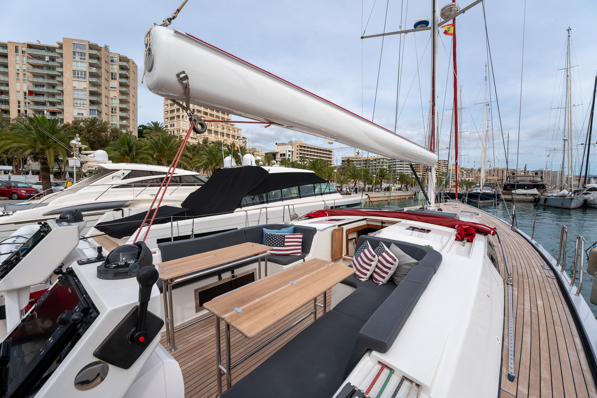 The proven performance cruiser comes well equipped for short handed sailing in comfort with a furling boom, 6x Lewmar electric winches, twin helm stations, retractable bow thruster, generator, air conditioning systems, new 12mm teak deck (2022), new Raymarine Axiom electronics (2022), new high end sound system (2022),new water & fuel tanks (2023), new One sails main (2023), power points AC & USB throughout, watermaker, stern garage with tender, Besenzoni hydraulic passarelle and the list goes on. Available for viewing by appointment in Mallorca. There is an option for taking over the current berth in Mallorca. Serious offers for the yacht will be considered.