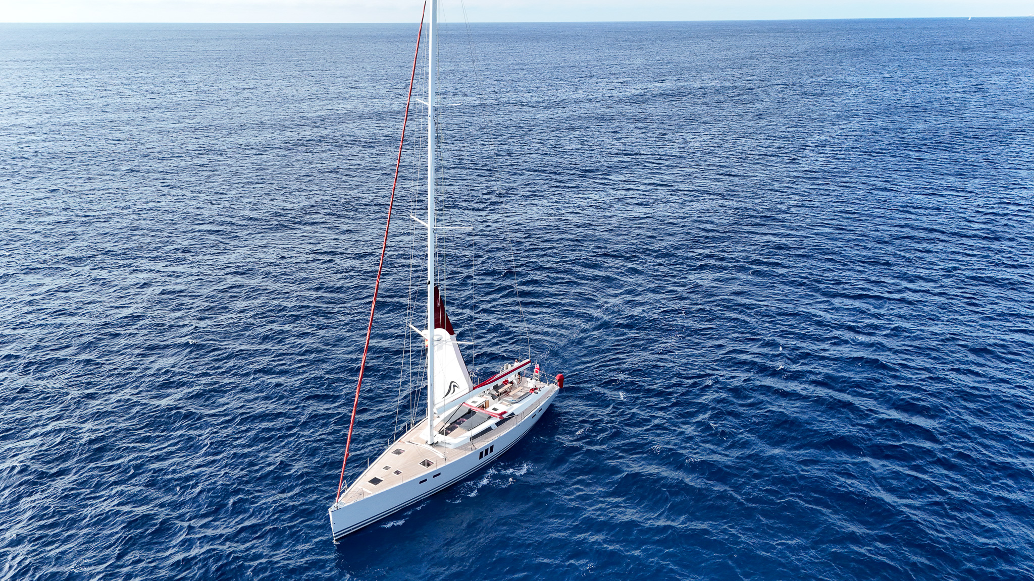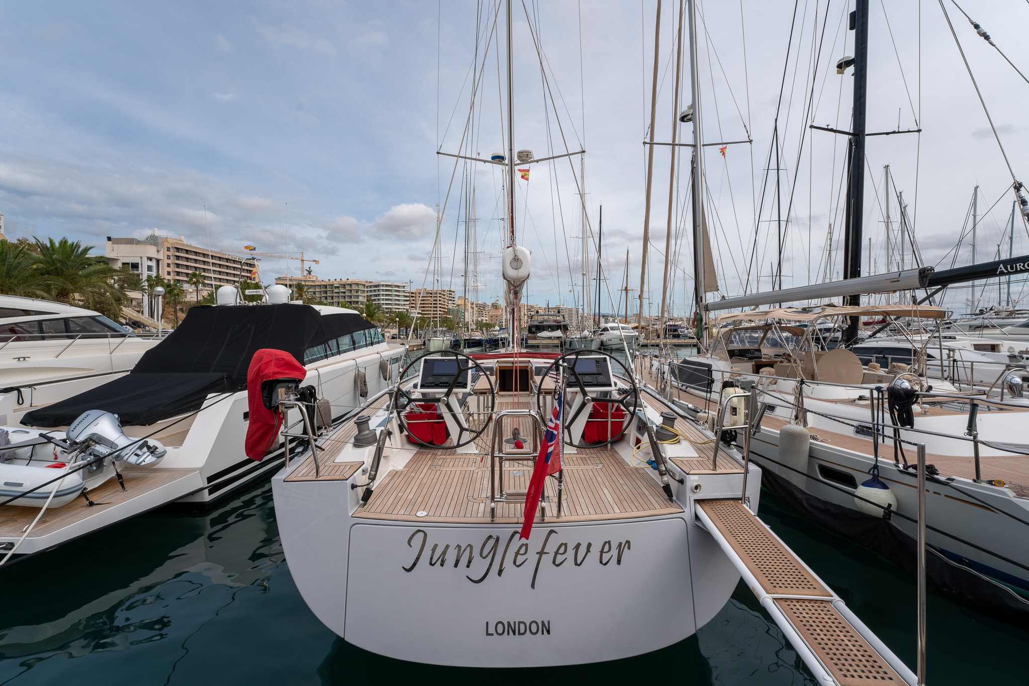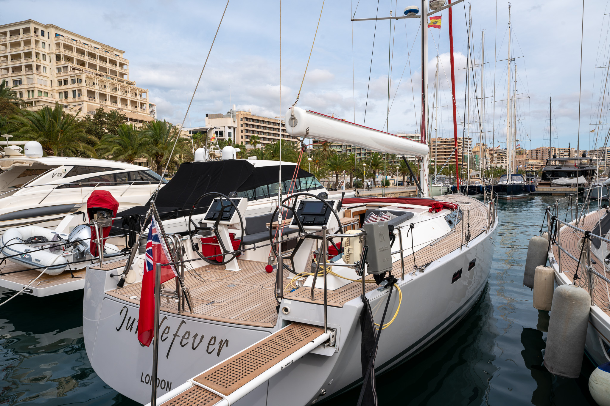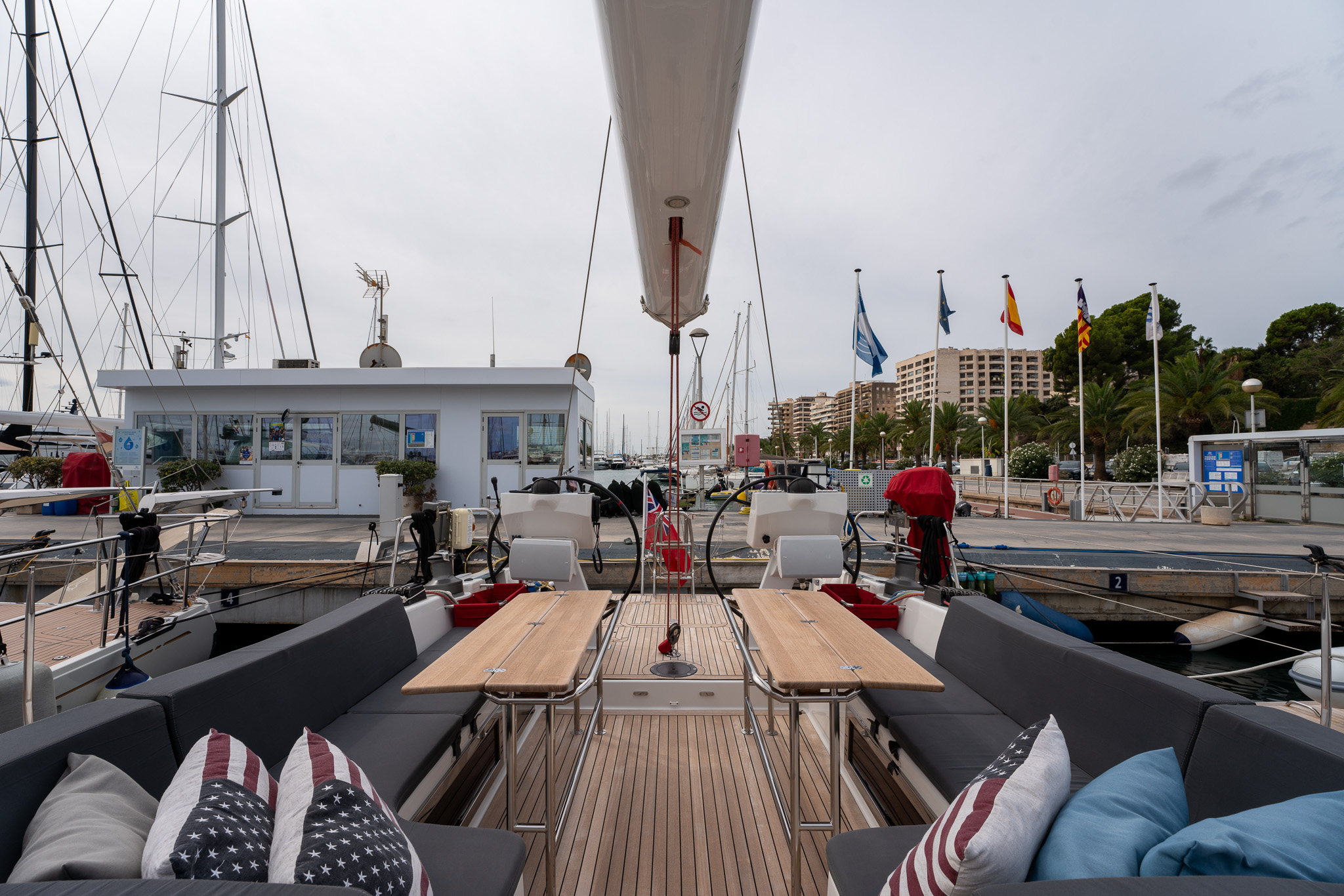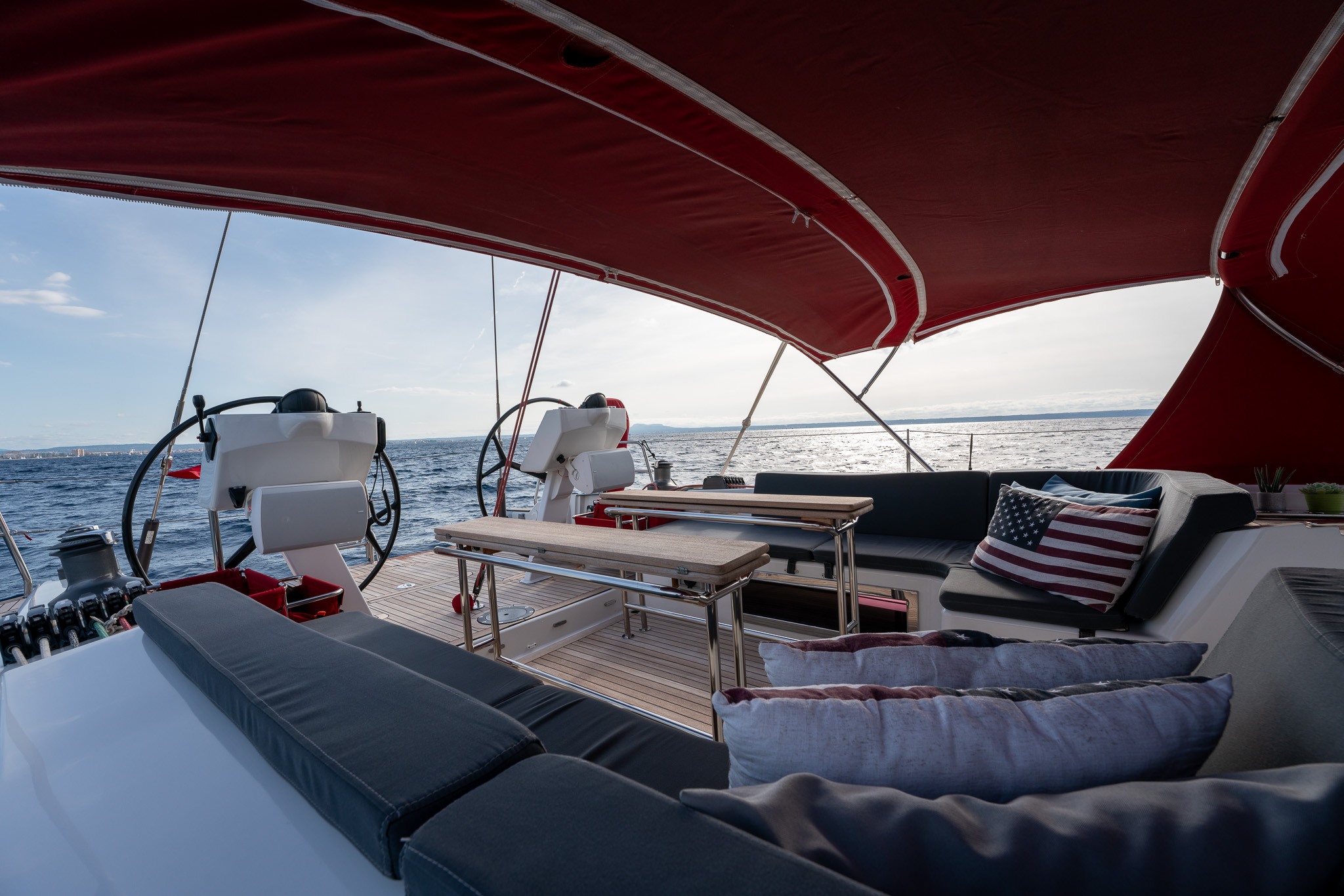 The proven performance cruiser comes well equipped for short handed sailing in comfort with a furling boom, 6x Lewmar electric winches, twin helm stations, retractable bow thruster, generator, air conditioning systems, new 12mm teak deck (2022), new Raymarine Axiom electronics (2022), new high end sound system (2022),new water & fuel tanks (2023), new One sails main (2023), power points AC & USB throughout, watermaker, stern garage with tender, Besenzoni hydraulic passarelle and the list goes on. Available for viewing by appointment in Mallorca. There is an option for taking over the current berth in Mallorca. Serious offers for the yacht will be considered.