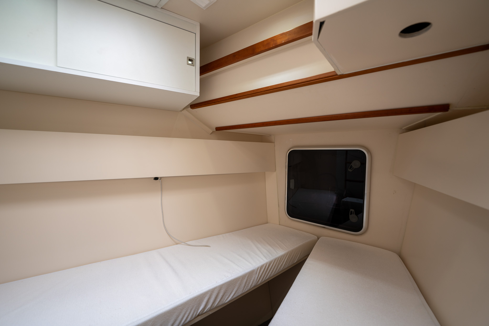 CREW CABIN forward with twin berths and overhead closed shelfs