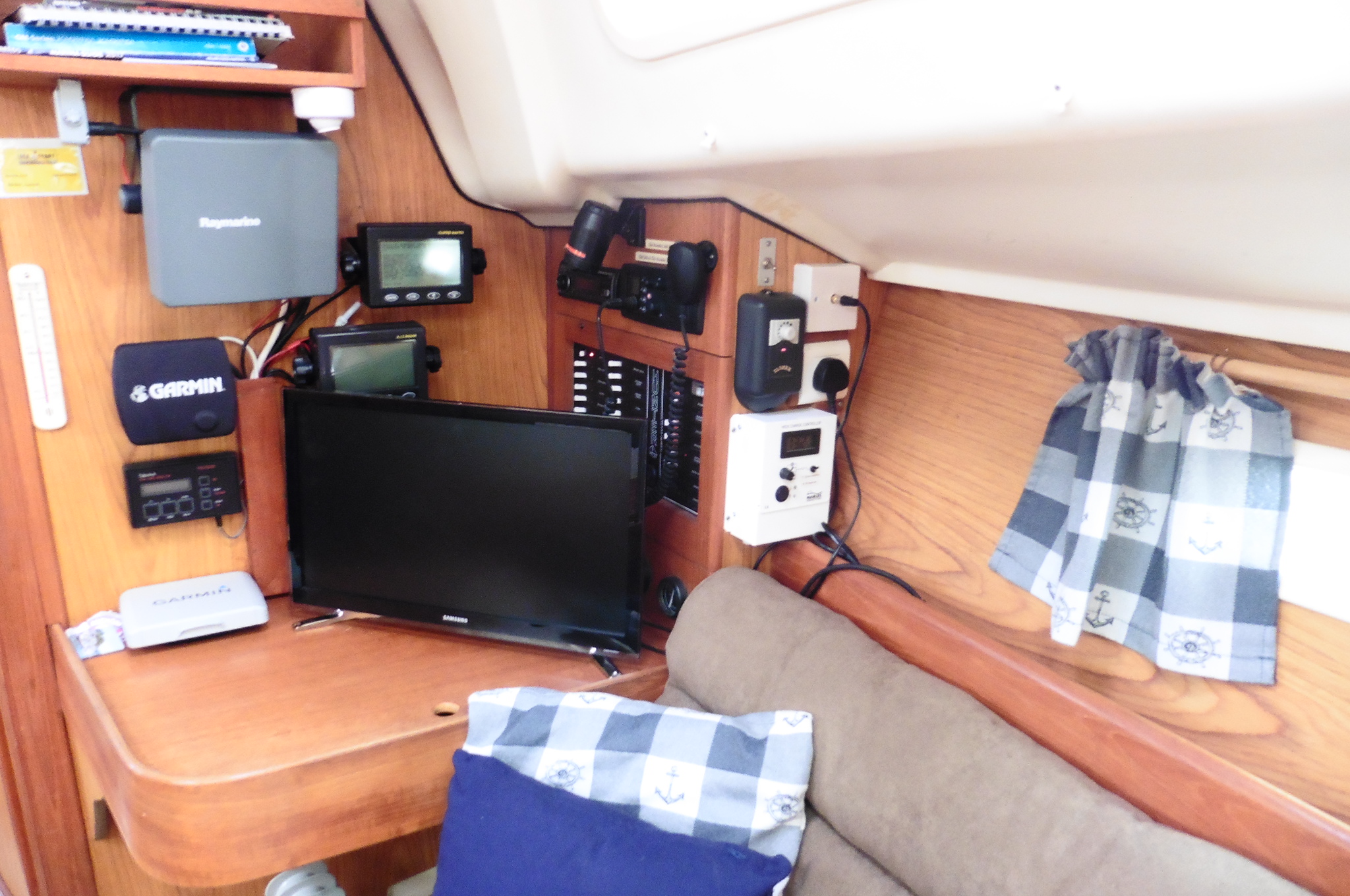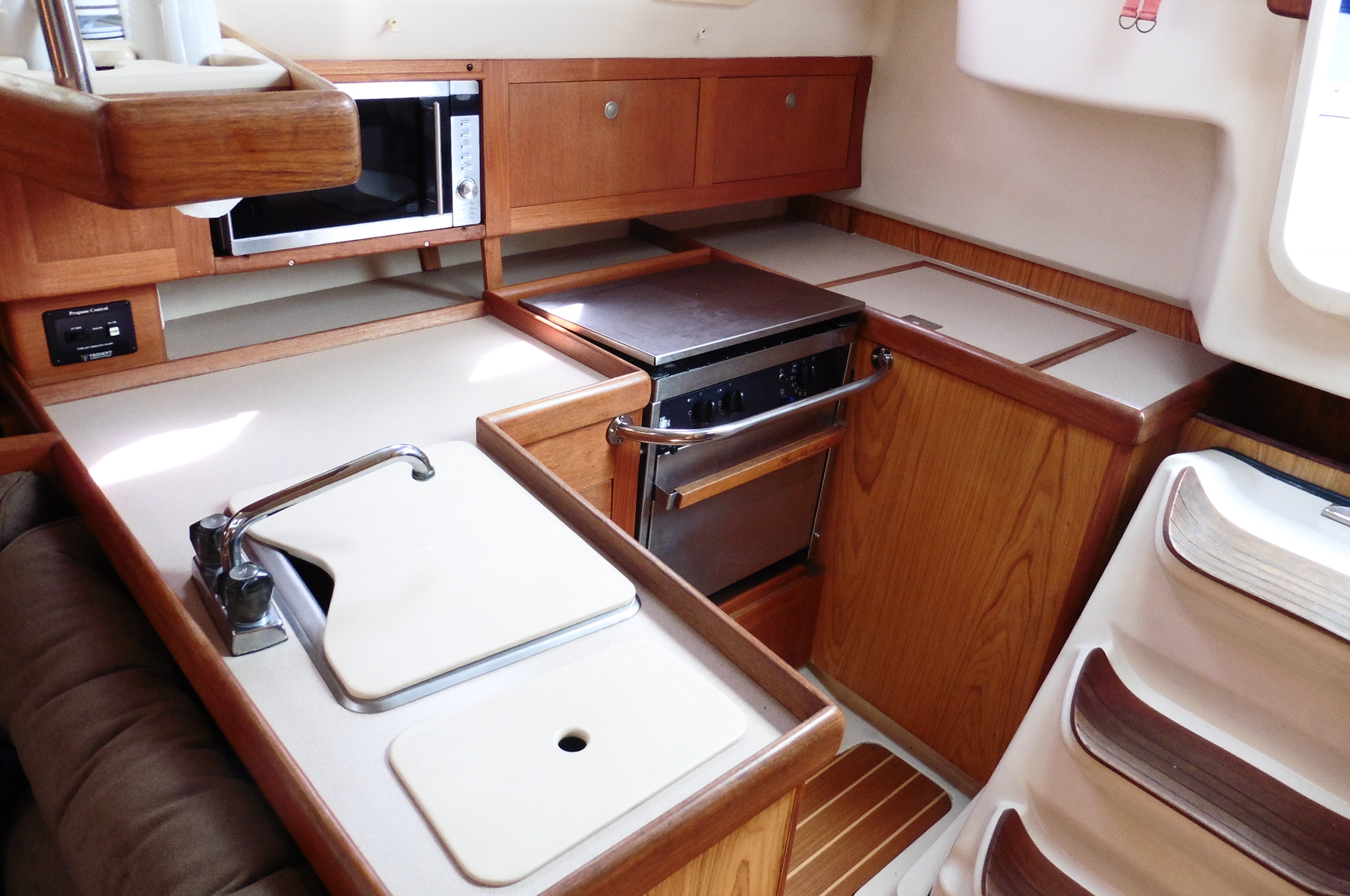 Galley is ‘L’-shaped and to starboard and has stainless steel sink with mixed tap and cover, two-burner Force 10 gas cooker with oven and grill, microwave (new 2010) 12v fridge and plenty of cupboards and work surfaces