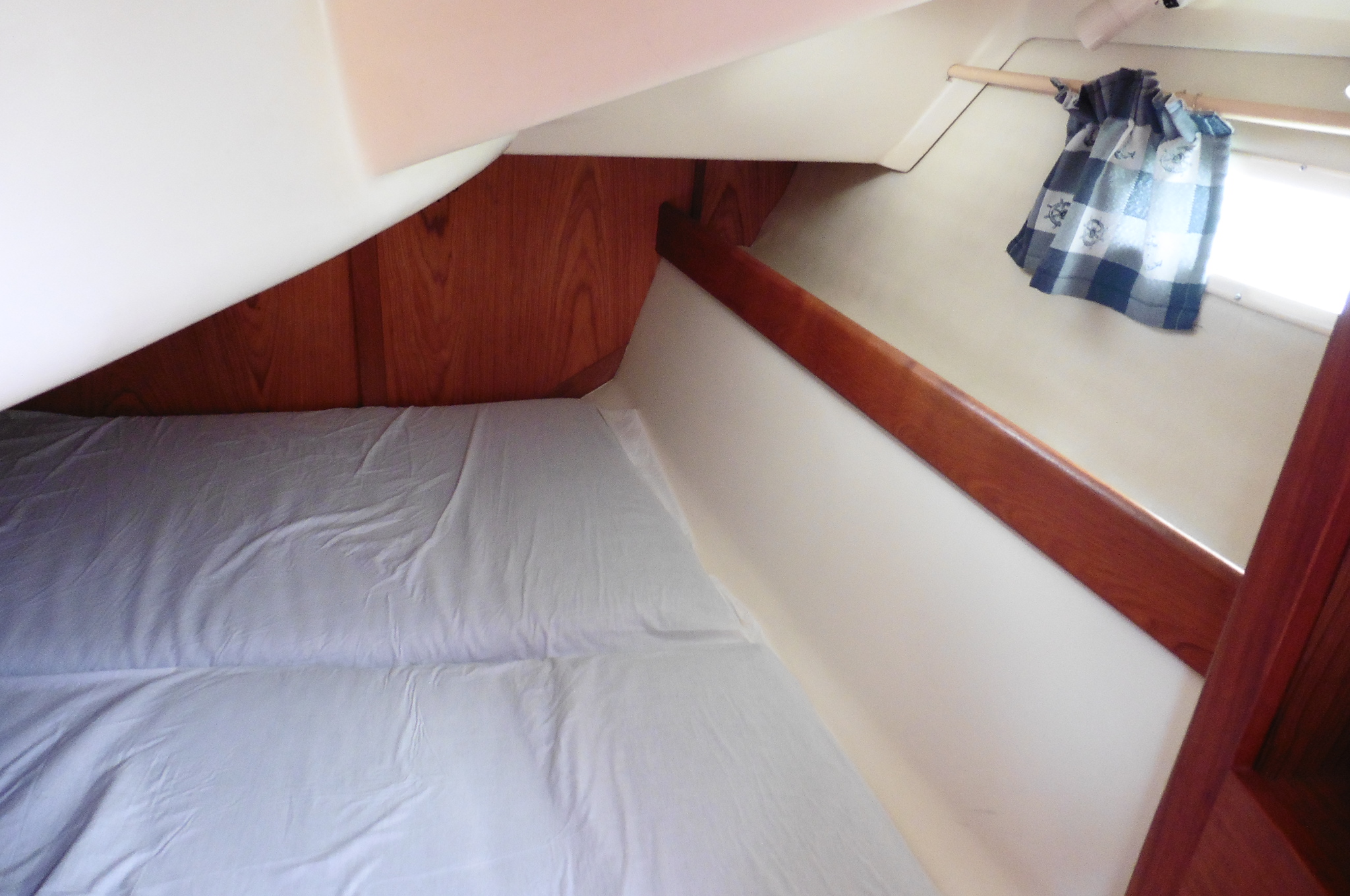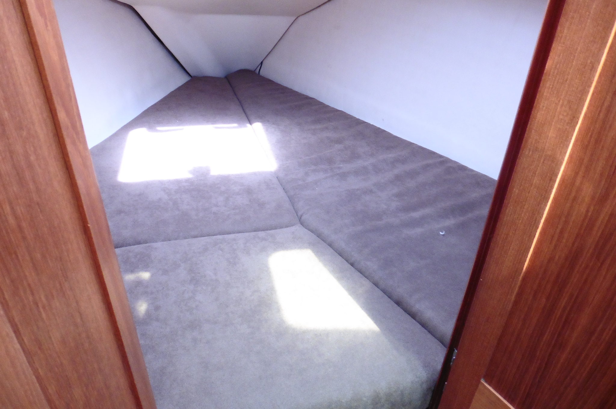 Guest cabin forward has a ‘V’-shaped double berth, storage and one hanging locker