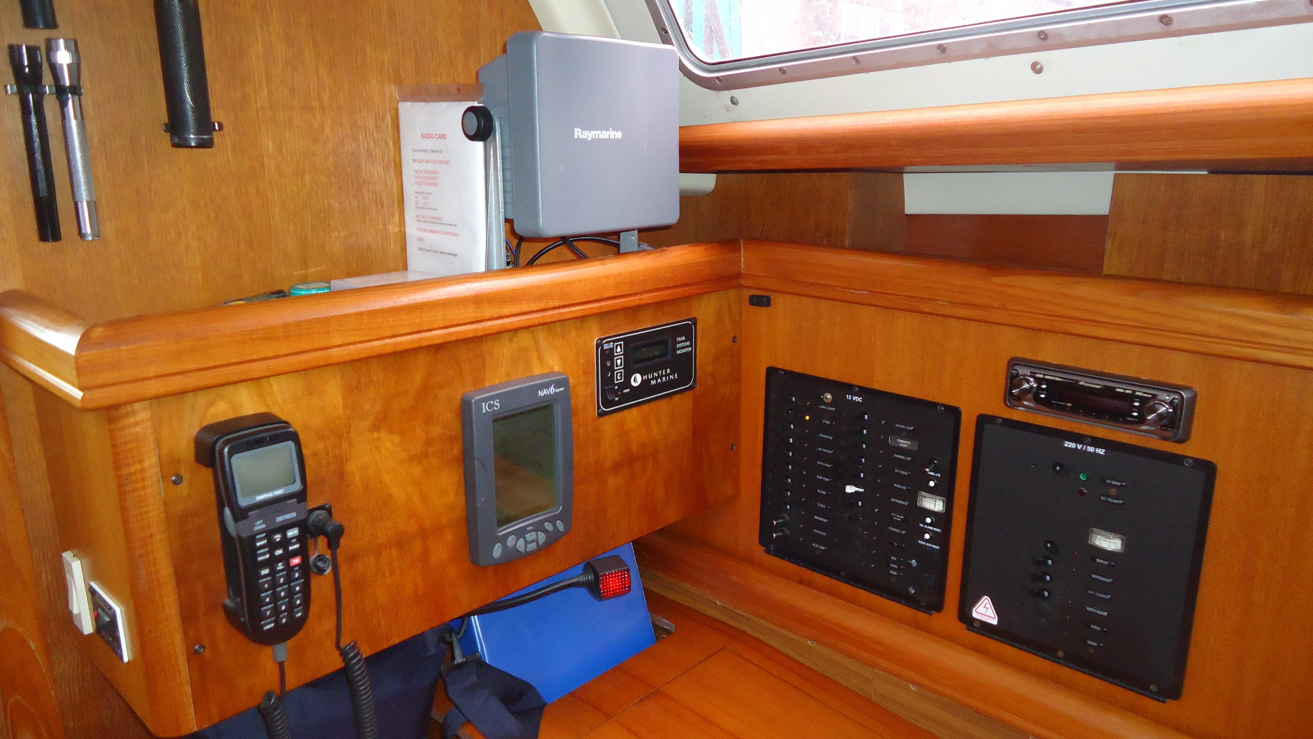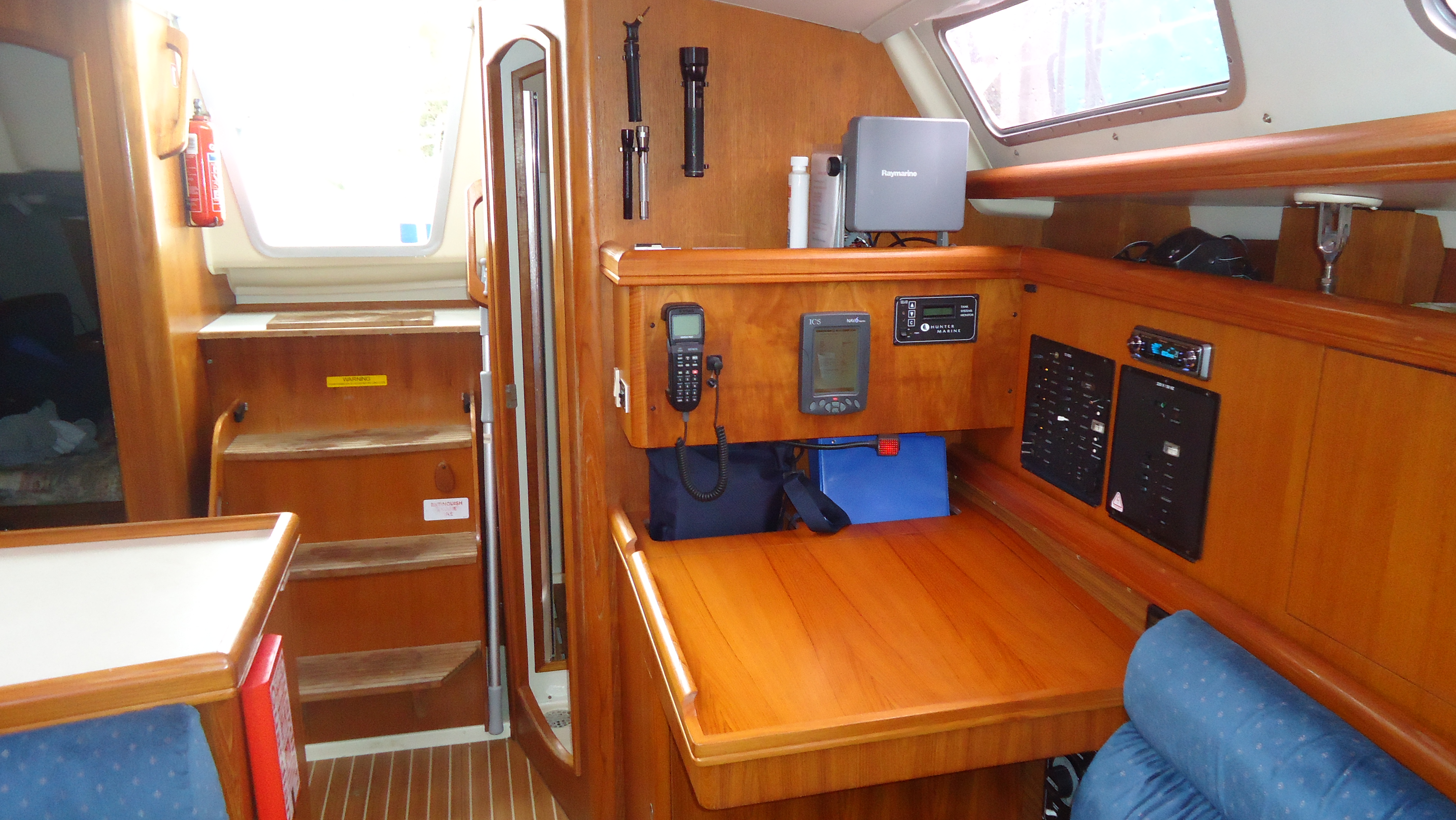 NAVIGATORS TABLE with plenty of work space, navigation instruments, DSC VHF and stowage. Forward is